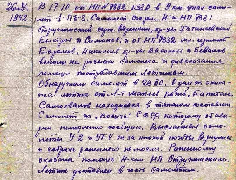 Опубликовано: 1 июля, 2009 Кстати о Никульникове: "...По следам поисков экипажа Пе-3. Хоменко Николай Васильевич сообщил, что в 1944 году, из Шойны в Пешу пришло сообщение, что Канинские ненцы, перешли Канин-камень и наткнулись на наш истребитель. Но людей в самолете они не обнаружили. Бывший начальник НКВД по Канино-Тиманскому району - Рухлов, вылетал туда на двух самолетах марки По-2. Но они так же не нашли людей, не было и крови. Оленеводы говорят, что кровь могла уйти с осадками, а трупы съесть, лисы и песцы. Экспедиция вывезла один пулемет, хотя говорят, что на таких типах истребителей устанавливалось по три пулемета. Мы решили проверить эту информацию и узнали целую историю об этой аварии. Еще осенью 1942 года, пастушка Анна Федоровна Чупрова, работавшая тогда в оленеводческой молодежной бригаде, была свидетельницей этой трагедии. «Днем это было, очень сильный туман был. Дежурили мы в стаде, и вдруг возле сопки Горелой услышали шум самолета, а потом сильный взрыв. Испугались мы, думали немцы бомбят нас. А туман, ничего не видно. Хотелось побежать туда, оленей одних оставить нельзя, а потом и страшно ведь было. Что там взорвалось, кто знает. Прошла ночь, а утром собаки стали беспокоиться и выть. Воют и воют как по покойнику. Ну, решили пойти. Пешком пошли, быков то мало было, почти всех на фронт забрали. Пришли к Камню, смотрим, самолет наш советский разбитый. Правда, не сам самолет, а куски от него лежат разбросанные. А на самой сопке земля и камни словно огнем опаленные. Спустились с сопки, стали обломки рассматривать. Смотрим – два летчика мертвые лежат в стороне. Их наверное взрывом выбросило. Схоронили мы их на сопке» Об этом написал, в ноябре 1979 года, в газете «Нарьяна-Вындер», бывший председатель колхоза «Северный полюс» - Егоров Ю.С., в очерке «Назови мне, Камень, их имена». Он был на Канине в августе 1972, на дне оленевода и побывал на могиле летчиков. Уезжая, они поправили могилку и установили на ней пулемет, с разбившегося самолета. Этот очерк прочитала в Несской школе учащимся учительница истории Светлана Георгиевна Покровская. Ребята загорелись желанием установить имена героев. Была создана группа поиска. Учащимися, под руководством Покровской С.Г., была проведена огромная работа. Ребята не только установили имена погибших, но и были найдены сослуживцы погибших и их родственники. Так 13 октября 1980 года, в Неси произошло большое событие: сюда прилетел вертолет с сопки Горелой. На этом вертолете везли урны с прахом погибших летчиков. В Неси состоялся митинг. Собравшиеся увидели портреты погибших воинов и урны с выгравированными фамилиями: Михин и Никульников. В тот же день урны были доставлены в Архангельск, где через несколько дней состоялось захоронение останков погибших. (Газета «Нарьяна-Вындер», от 24.10.1980 г., «Поиск увенчался успехом» О. Першанин – директор Несской школы). Позже в газете «Нарьяна-Вындер», за 18.11.1980 год, Светлана Покровская, в статье «Они защищали Родину», рассказала о поиске погибших летчиков, об их судьбах. Вот что они обнаружили в документах военных лет. «Два «Пе-3» вылетели на прикрытие союзных транспортов в восточной части Баренцевого моря. Один самолет с задания не вернулся. Командиром экипажа самолета был лейтенант Михин Борис Иванович, а штурманом лейтенант Никульников Николай Михайлович»...". Это произошло 24 ноября 1942 го