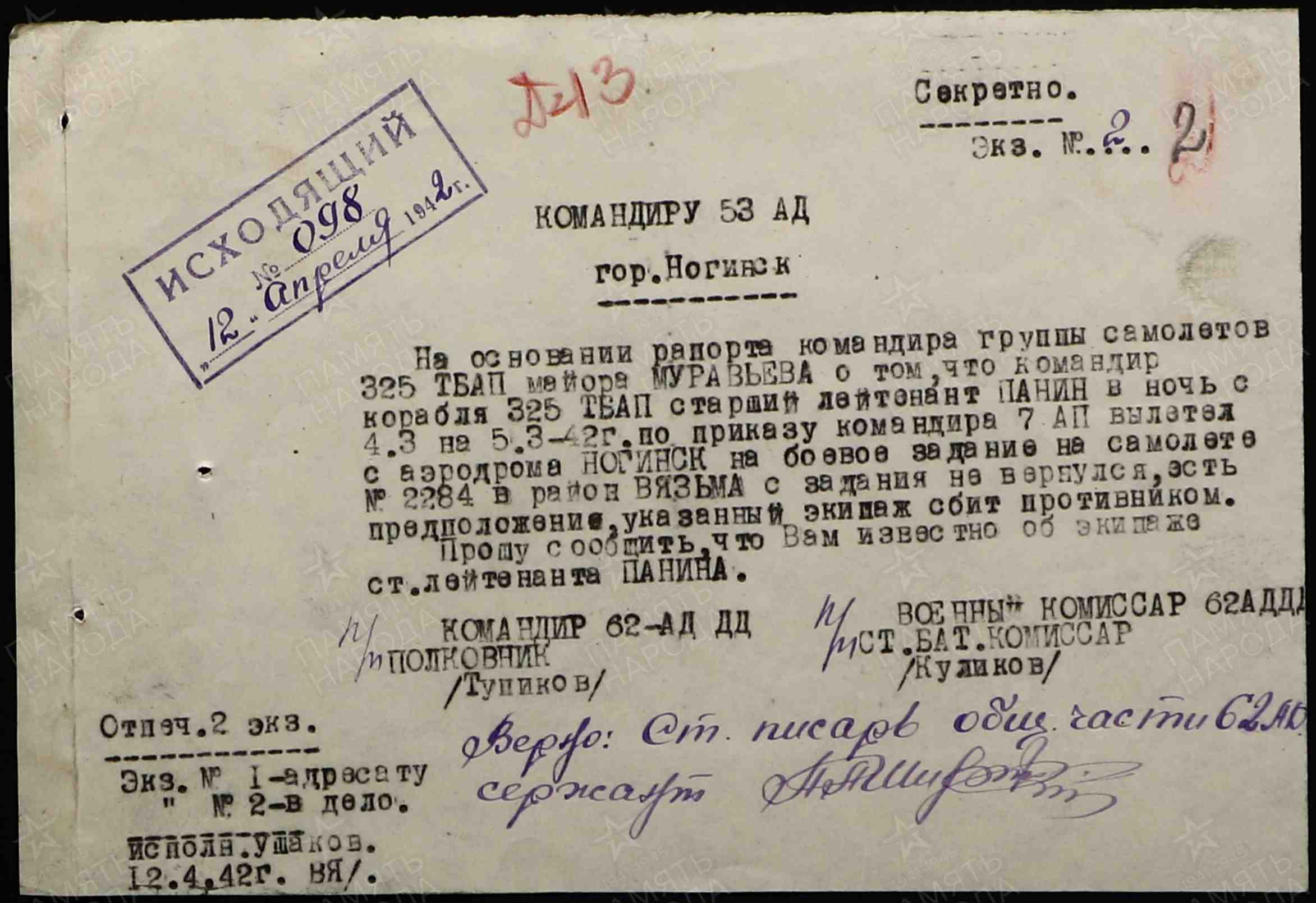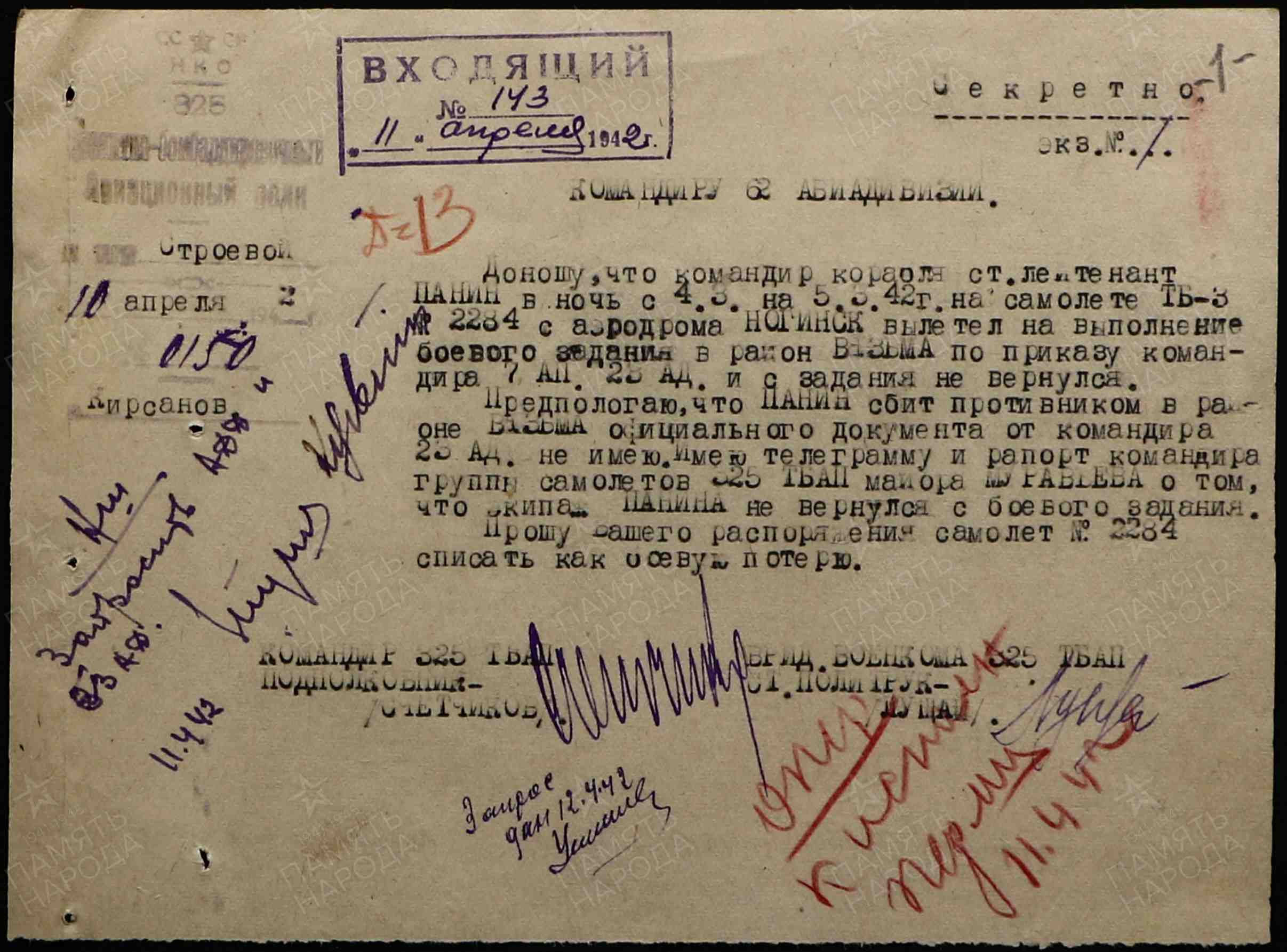 Опубликовано: 1 апреля, 2020 Не знаю, актуально, или нет, но вот информация: 22476 М-34Р №22 нет 475 1934 СССР 7-й ТБАП потерян 20.05.42 Оп.11503, Д18, Лист 306 Управление АДД Донесения и технические Акты об отказах, дефектах и летных происшествиях Акт 24 мая 1942 года г. Монино Комиссия в составе инженера 7 АП ДД инженер-майора Иванова, инженера 1 АЭ инженер-капитана Фомина, старшего техника отряда инженера-капитана Осипова, составили настоящий акт на списание самолета ТБ-3 № 476 с моторами М-34р №№ 1305, 1613, 188, 1383, потерпевшего катастрофу в ночь на 20 мая 1942 года в районе Калуги деревня Каменка. По материалам расследования катастрофа произошла по следующей причине: Командир кораблин капитан Булкин потеряв ориентировку и пытаясь восстановить таковую, при развороте с большим креном потерял скорость и упал на землю и сгорел. Экипаж кораблин погиб полностью. Выводы: самолет полностью уничтожен ремонту не подлежит, требует списания со всем оборудованием и вооружением. Председатель комиссии инженер 7 АП ДД Инженер-майор п/п Иванов и др. 1 Упомянуть пользователя Поделиться сообщением Ссылка на сообщение Поделиться на других сайтах