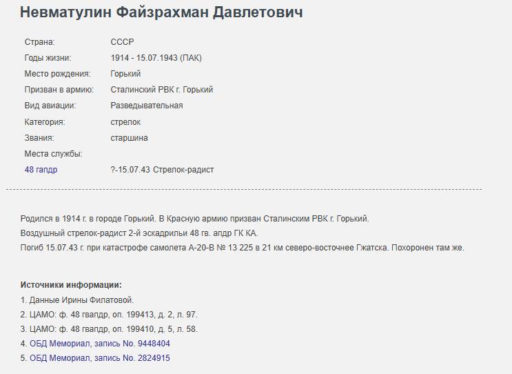 Опубликовано: 28 сентября, 2019 Очень близко... катастрофа... Фамилия Невматулин Имя Файзрахман Отчество Давлетович Дата рождения/Возраст __.__.1914 Место рождения г. Горький, ул. Интернацион, д. 30, кв. 4 Последнее место службы 48 гв. ап дал. разведчиков Воинское звание старшина Причина выбытия убит Дата выбытия 15.07.1943Первичное место захоронения Смоленская обл., Гжатский р-н, г. Гжатск, северо-восточнее, 21 км https://obd-memorial.ru/html/images3?id=2824908&id1=60799c3afdd56c875c0ef97e0e82a72c&path=VS/001/058-0018001-0558/00000444.jpg 2 Упомянуть пользователя Поделиться сообщением Ссылка на сообщение Поделиться на других сайтах