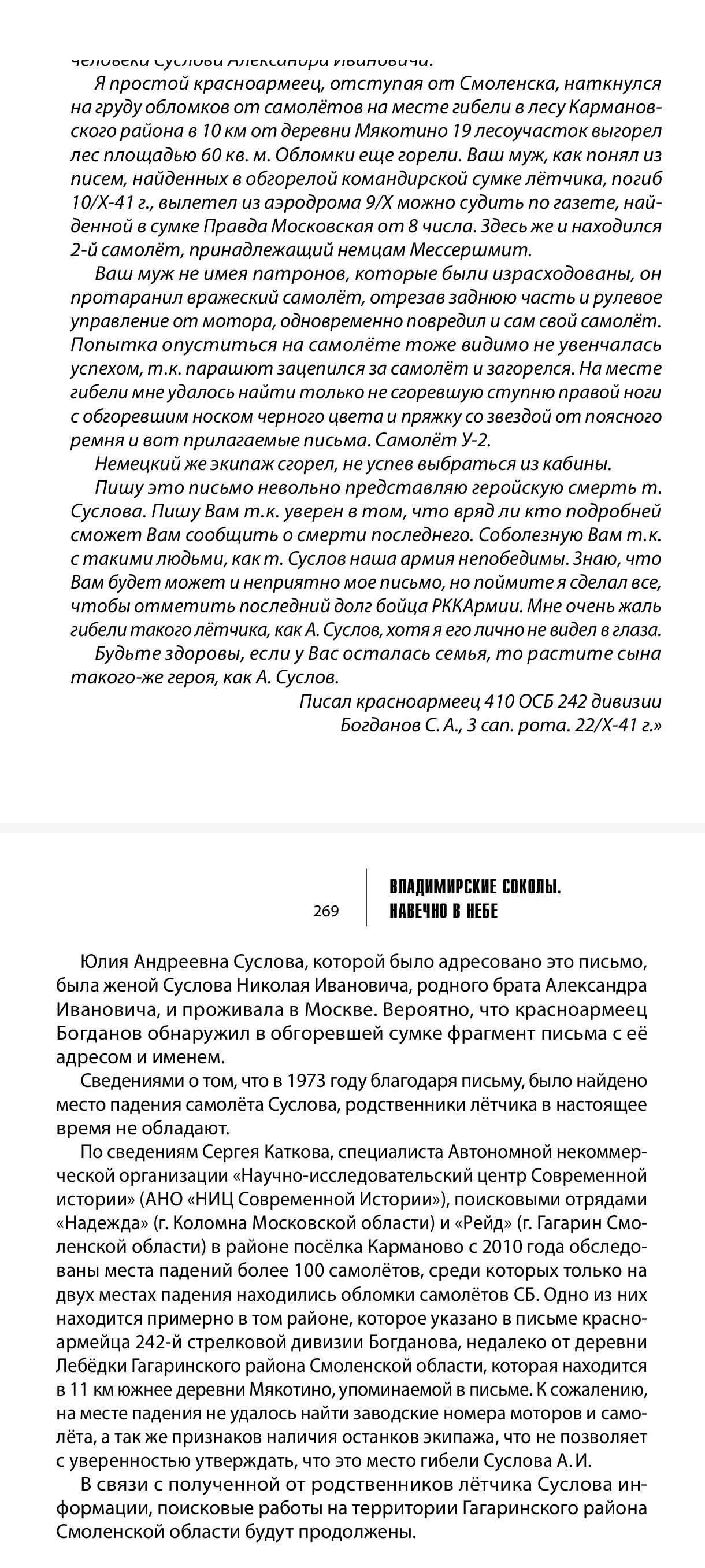 Опубликовано: Monday в 16:28 40 минут назад, Взвод сказал: Добрый вечер. В книге "Владимирские соколы навечно в небе" ч.2 Александровские и Вязниковские районы, автор Е.Агафонов стр. 267 родственники летчика Суслова А.И погибшего 12.10.1941 - Захрямина Людмила Дорофеевна, г. Красноярск. ул. Бограда, д.12. Также в местной газете есть первичные данные по родственникам, проживающим в Вязниковском районе. Нашел эту книгу и информацию о Суслове... Интересно получается: таран? Ну и самолёт не У-2 как в письме Богданова... 1 Упомянуть пользователя Поделиться сообщением Ссылка на сообщение Поделиться на других сайтах