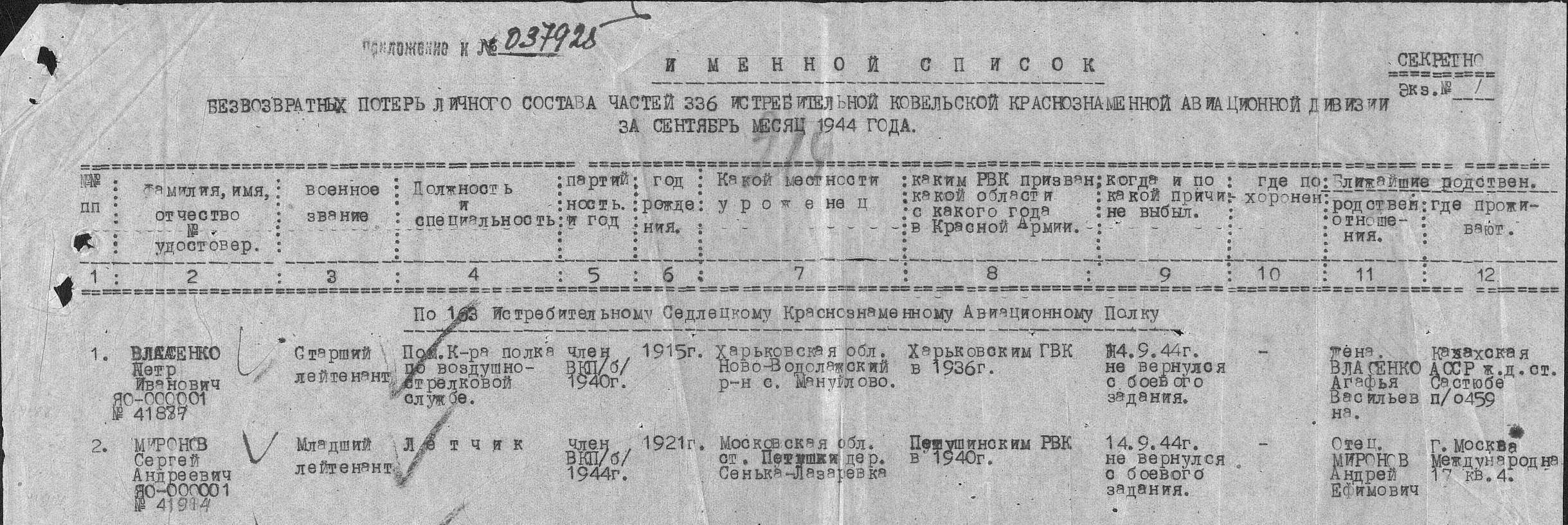 Опубликовано: 31 октября, 2016 14 сентября 1944 года, полк еще потерял лейтенанта Мельникова П.С. Мельников идет отдельным пунктом приказа по 4-м самолетам, сбитым в тот день в воздушном бою. Тут вопрос, Миронов или Власенко, могли в приказе местами поменять. Хотя, если начали с мл. лейтенанта, не в помощника по ВВС, то скорее сохранили порядок. Я тоже так думаю... 0 Упомянуть пользователя Поделиться сообщением Ссылка на сообщение Поделиться на других сайтах