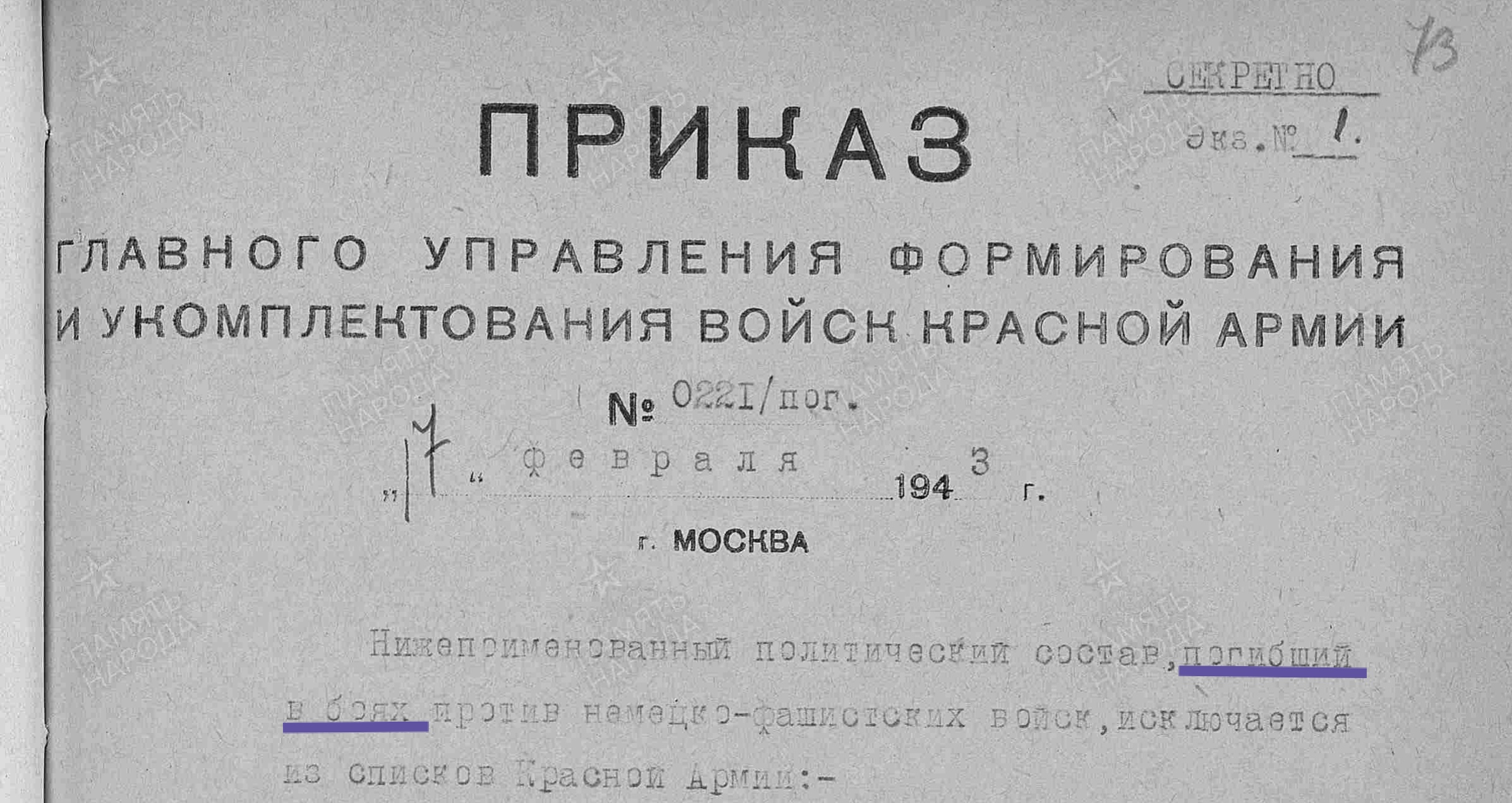Приказом ГУФУ КА № 0221/пог от 17.02.43 исключен как погибший в боях: