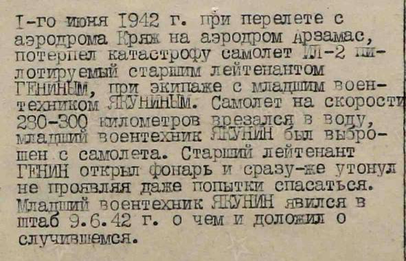 Доброго здоровья коллеги и друзья. В формате данной темы хочу поделиться следующим. Работая недавно в ЦАМО с фондами 1-ой ЗАБ, натолкнулся на такую информацию: "1 июня 1942 года при перелете на фронт во время полета над рекой Волгой в составе девятки, на высоте 500 метров ком.звена 448 ШАП ст.л-т ГЕНИН самовольно вышел из строя и перешел на бреющий полет по центру р.Волга, задел винтом воду и скапотировал. Летчик утонул, техник (мл.воентехник 448 ШАП ЯКУНИН) спасен, самолет затонул". Номера самолета и мотора не указаны, как и имена и отчества членов экипажа. Из-за нехватки времени до конца не успел отработать вопросы - поднят ли был самолет, захоронен ли пилот и т.д. В связи с этим хочу обратиться к Самарским коллегам - известно ли им что-либо об этом случае, об обстоятельствах поиска и подъема самолета. Кстати, после этого события приказом по 1-ой ЗАБ были запрещены при перегоне на фронт полеты над р.Волгой. С уважением.
