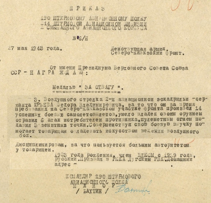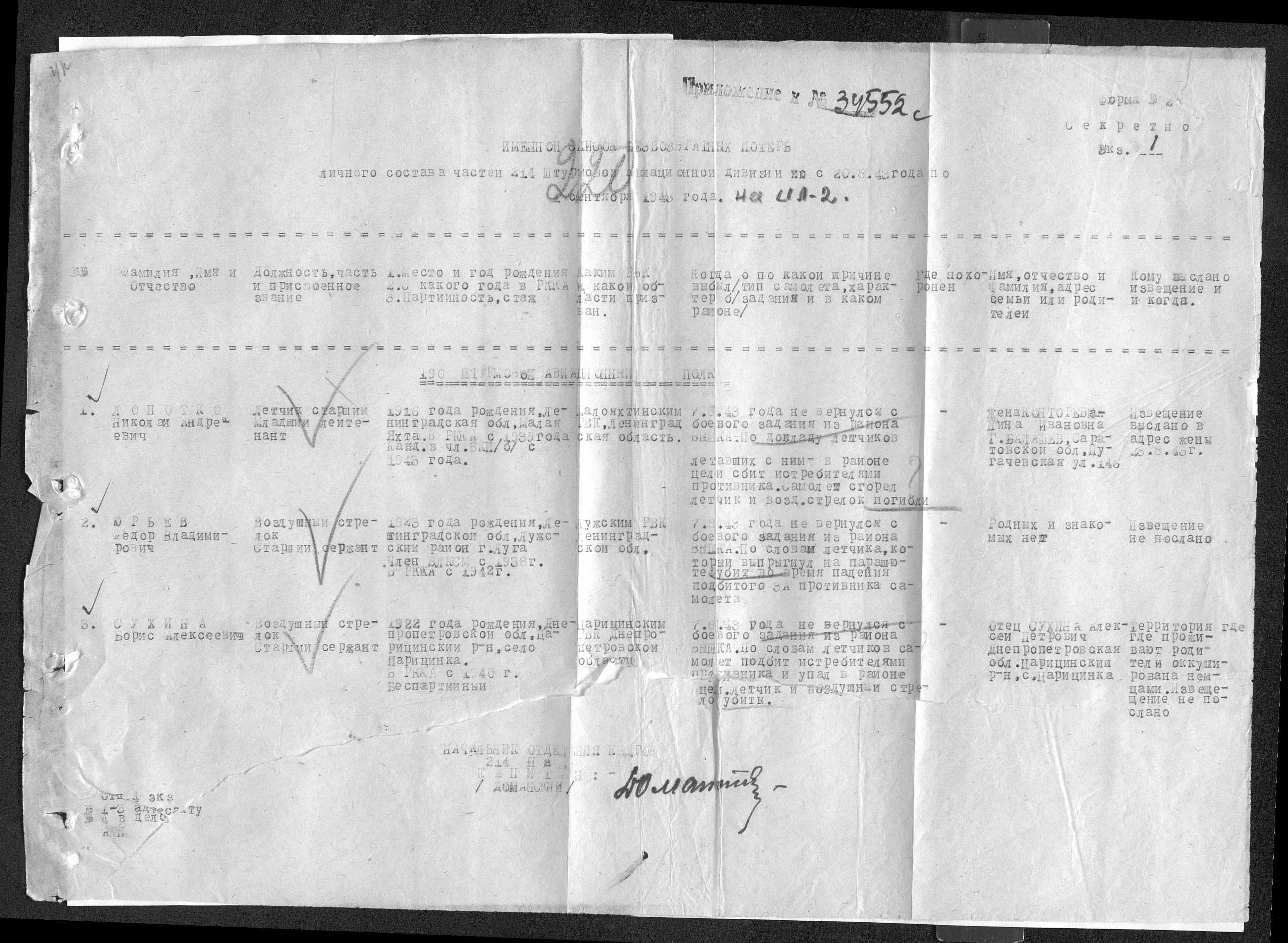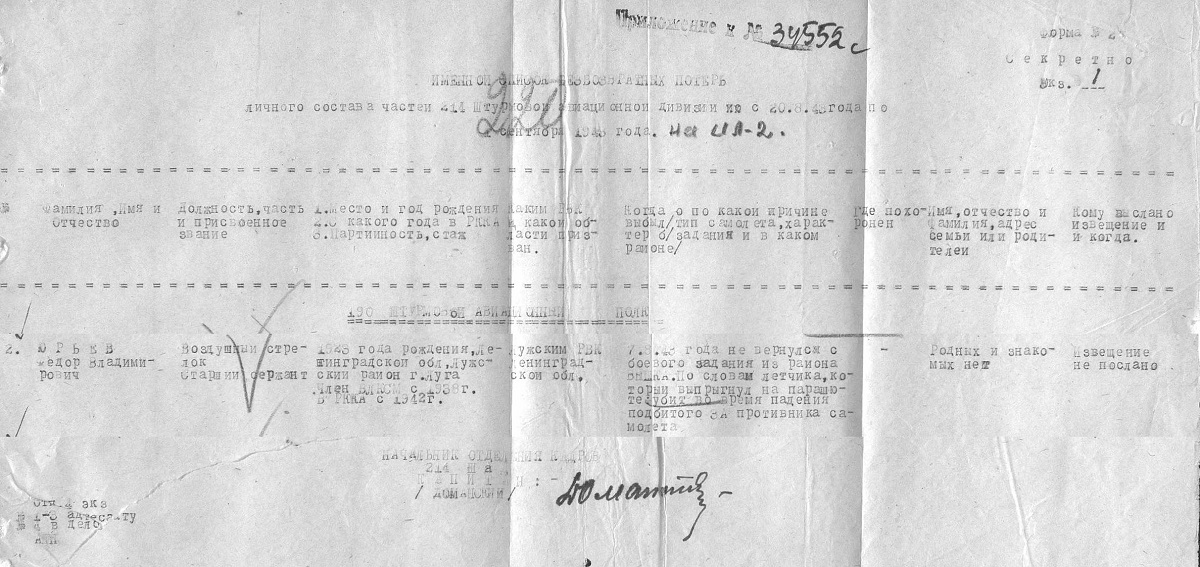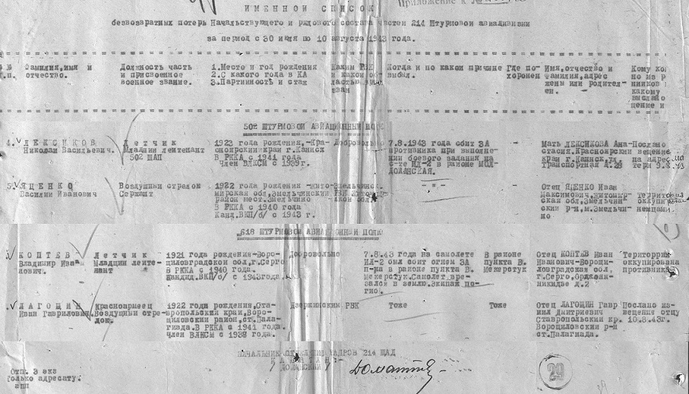 7.8.1943 Самолет №10050 с АМ-38ф №245645 и самолет Ил-2 №3653 с АМ-38ф №243248 не вернулись с боевого задания, исключить из боевого состава и провести по книге учета.