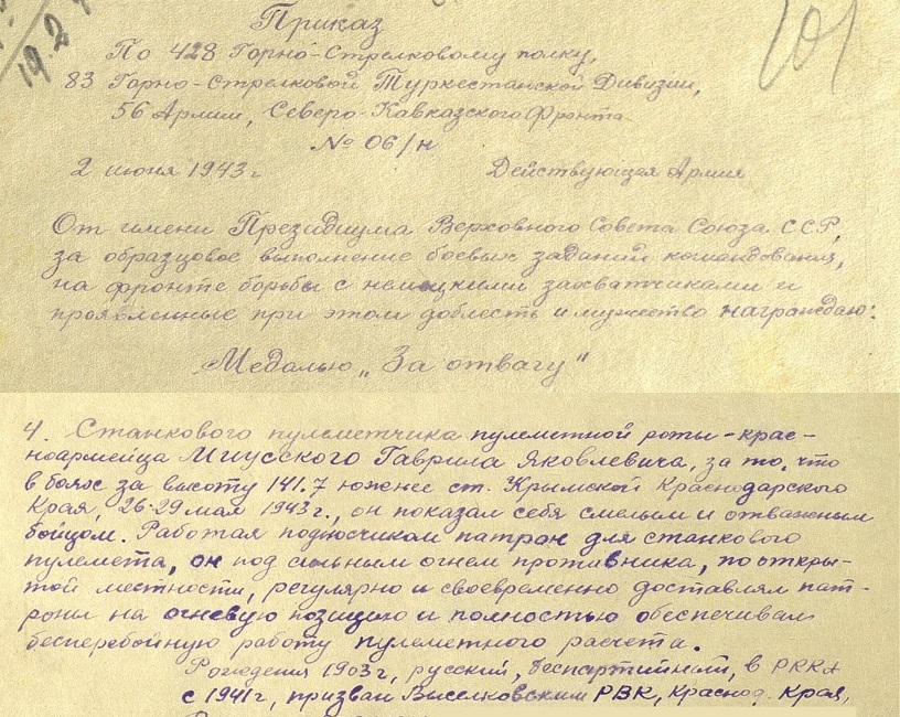 Опубликовано: 2 ноября, 2016 Пробили владельца медали "За отвагу" - красноармеец 428 гсп 83 гсд Миусский Гавриил Яковлевич. Числится пропавшим без вести. Только составители КП не знали... Миусский Гавриил Яковлевич Дата рождения __.__.1903 Дата выбытия __.10.1941 Источник информации Книга памяти. Краснодарский край. Том 14 И родственники были в неведение... Не было связи с бойцом с 1941 года http://www.obd-memorial.ru/html/info.ht ... 654&page=3 Жена проживала в Тихорецке(возможно в 1943), а не по месту призыва(30 января 1943 года – день освобождения Тихорецка, 1 февраля 1943 года был освобожден Выселковский район), не мог, или не знал боец где она, отсюда и следующая дата выбытия(+3 месяца к освобождению). Донесения послевоенного периода Дата донесения 14.05.1951 http://www.obd-memorial.ru/html/info.htm?id=71615654 Миусский Имя Гавриил Отчество Яковлевич Дата рождения/Возраст __.__.1903 Место рождения Краснодарский край, Выселковский р-н, ст. Березанская Дата и место призыва Выселковский РВК, Краснодарский край, Выселковский р-н Воинское звание красноармеец Причина выбытия пропал без вести Дата выбытия __.04.1943 Ещё одно упоминание в КП Дата выбытия __.04.1943 Источник информации Книга памяти. Краснодарский край. Том 3 Вечная Память......... 0 Упомянуть пользователя Поделиться сообщением Ссылка на сообщение Поделиться на других сайтах
