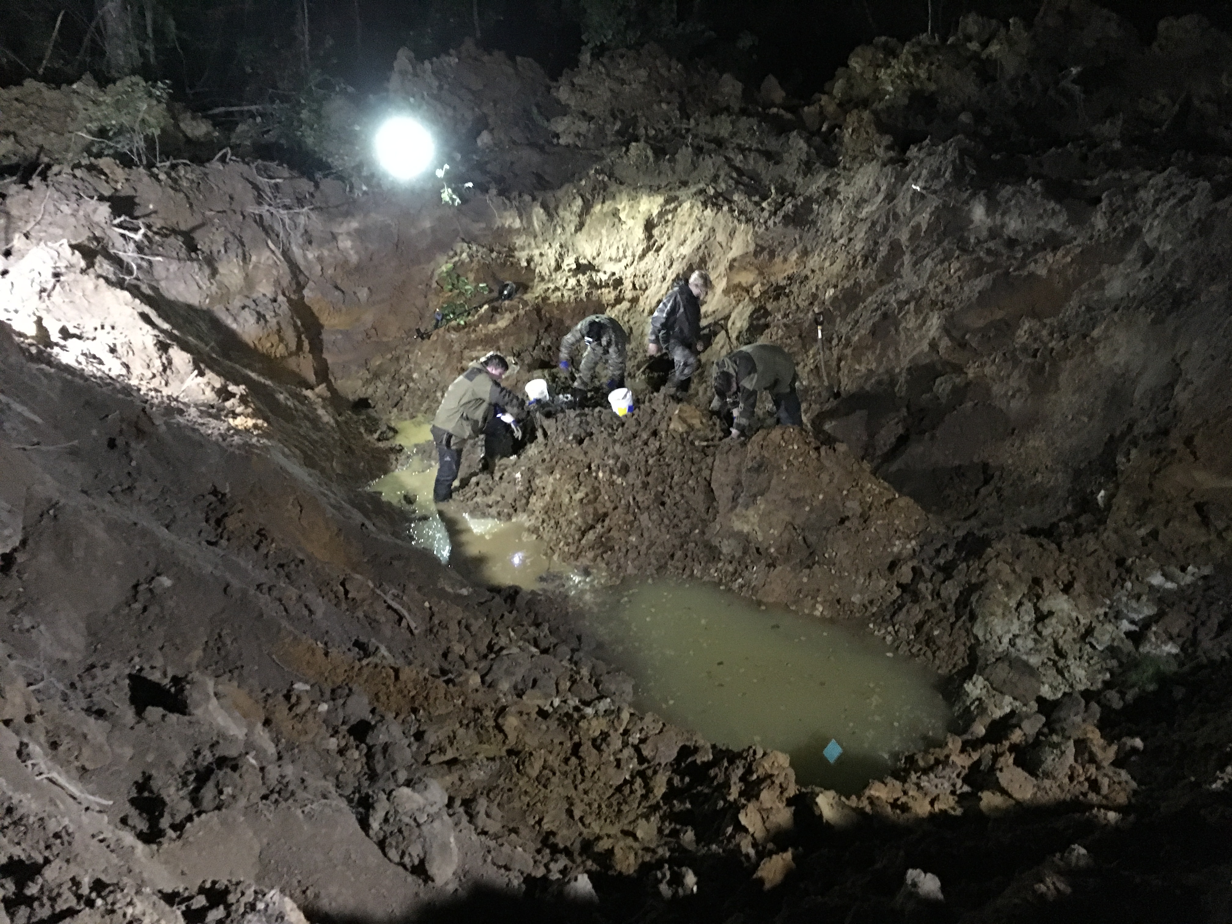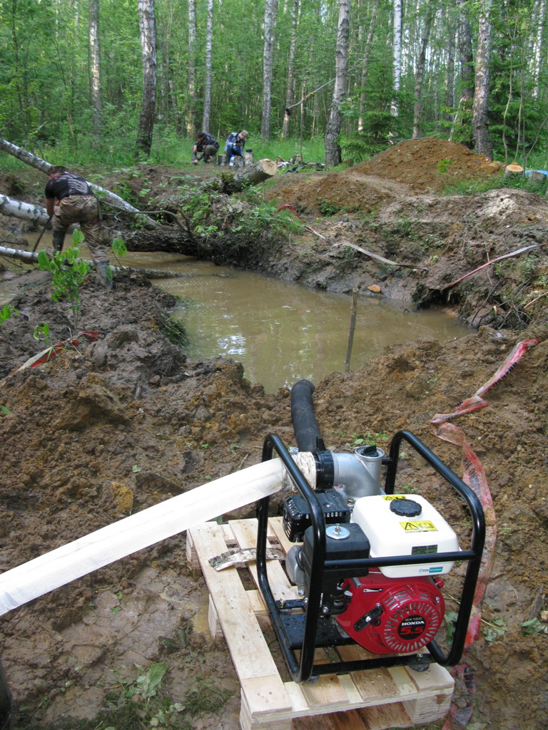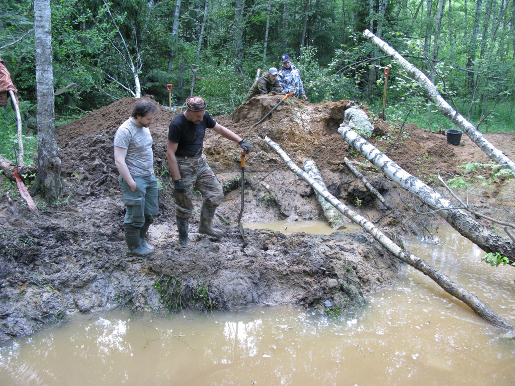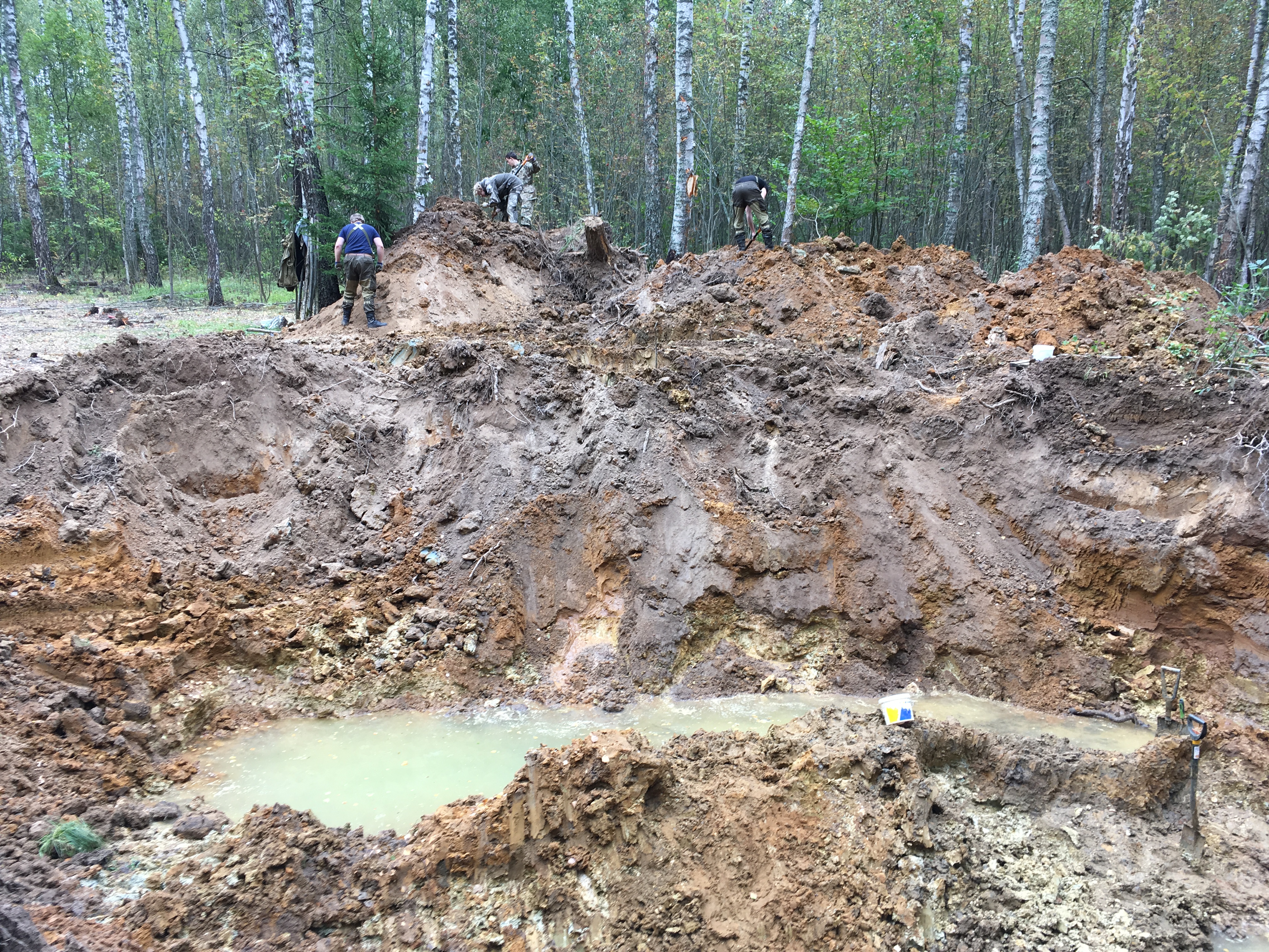 Здравствуйте! С замиранием сердца уже почти на протяжении трёх лет мы ездим на место падения Пешки в надежде на то, что получится пролить свет на обстоятельства гибели и раскрыть тайну экипажа. За это время на яме поработали три разных экскаватора и каждый раз казалось, что глубины не достаточно, ещё немного и пойдут крупные детали, ведь на глубине трёх метров по-прежнему встречались масляные следы и попадались мелкие детали двигателей. Каждый раз мы выкачивали воду из огромной ямы, которая была выкопана экскаваторами. Работали даже в темноте, освещая место раскопа прожекторами, питающимися от генератора.