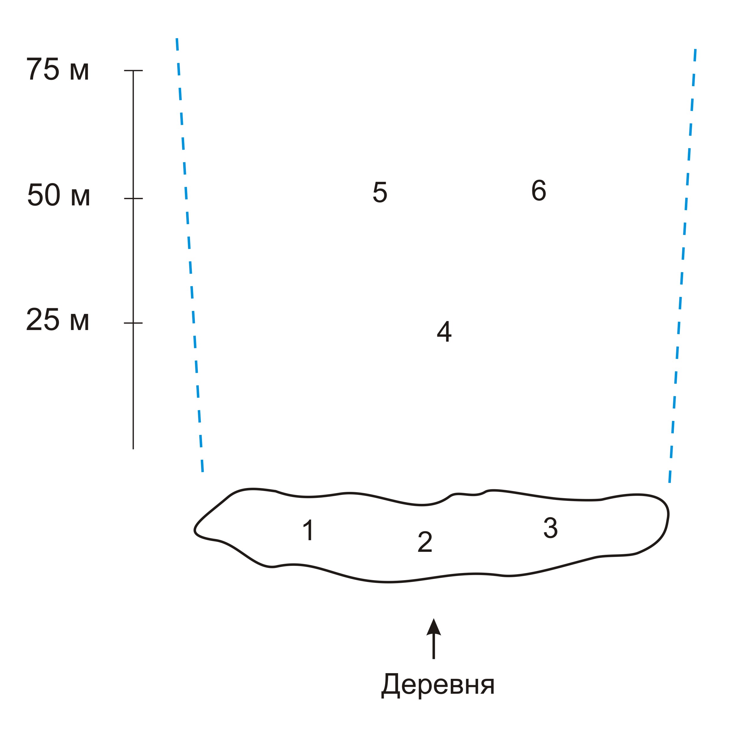 Теперь хочу немного проанализировать место падения и расположение находок. Позади воронки ничего нет, а есть шлейф осколков, границы которого примерно отмечены пунктиром.  Вот небольшая схема: