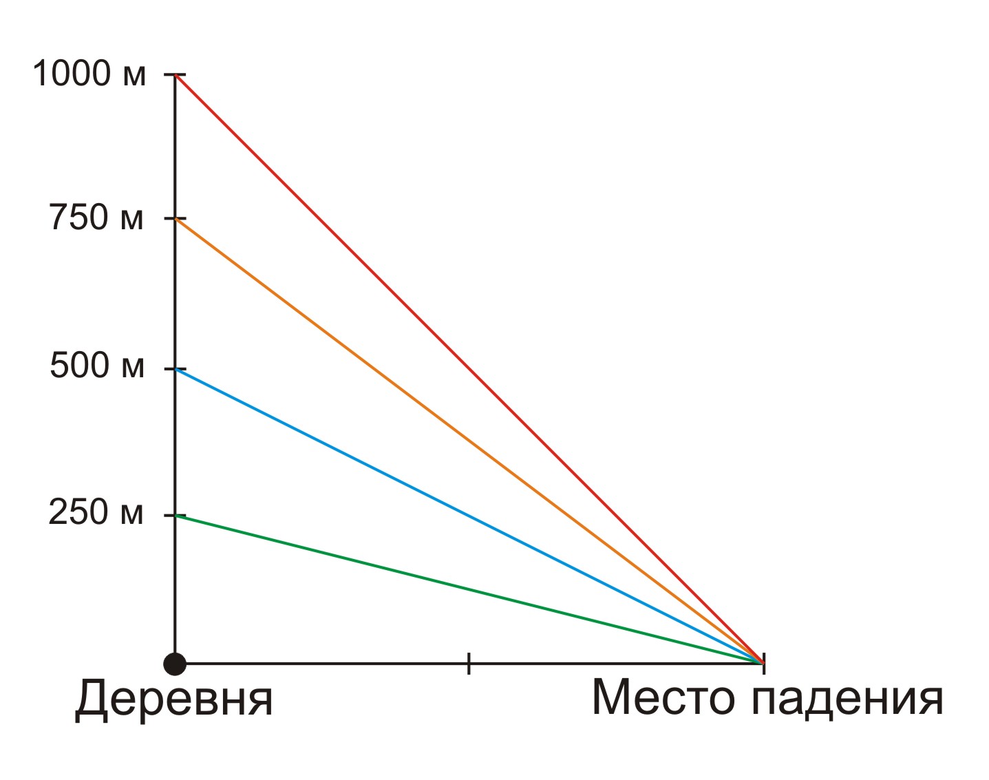 От середины деревни  до места падения ровно 1000 м. На какой высоте ребёнок мог увидеть самолёт и понять, что он зелёный? Думаю, метров до 500. Получается, что самолёт вошёл в землю под острым углом (зелёная или синяя траектории).