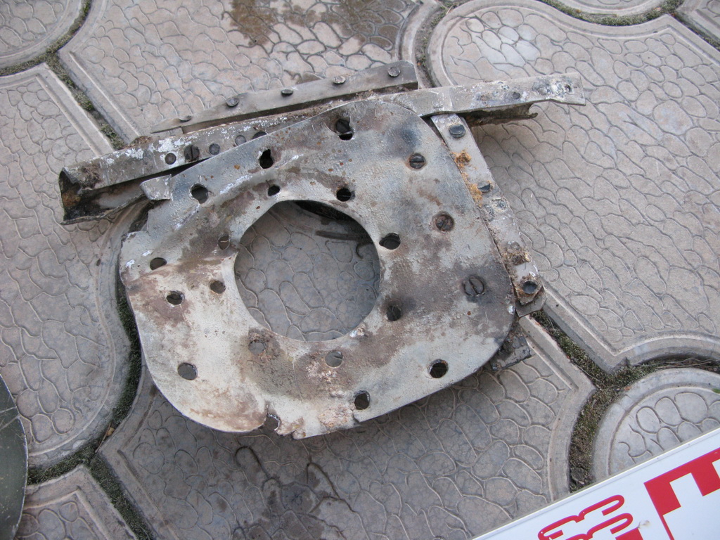 3. Самое "хлебное" место: начиная с 0.5 м до 2.3 м: фрагменты моторамы, фрагменты картера двигателя, клапан из двигателя, промасленная парашютная ткань, два карбюратора, выпускной коллектор, соты радиатора, лючок "запр.масло" (располагался сверху мотогондолы), опять же каблуки и кожа. Вся эта сторона обильно была пропитана маслом.