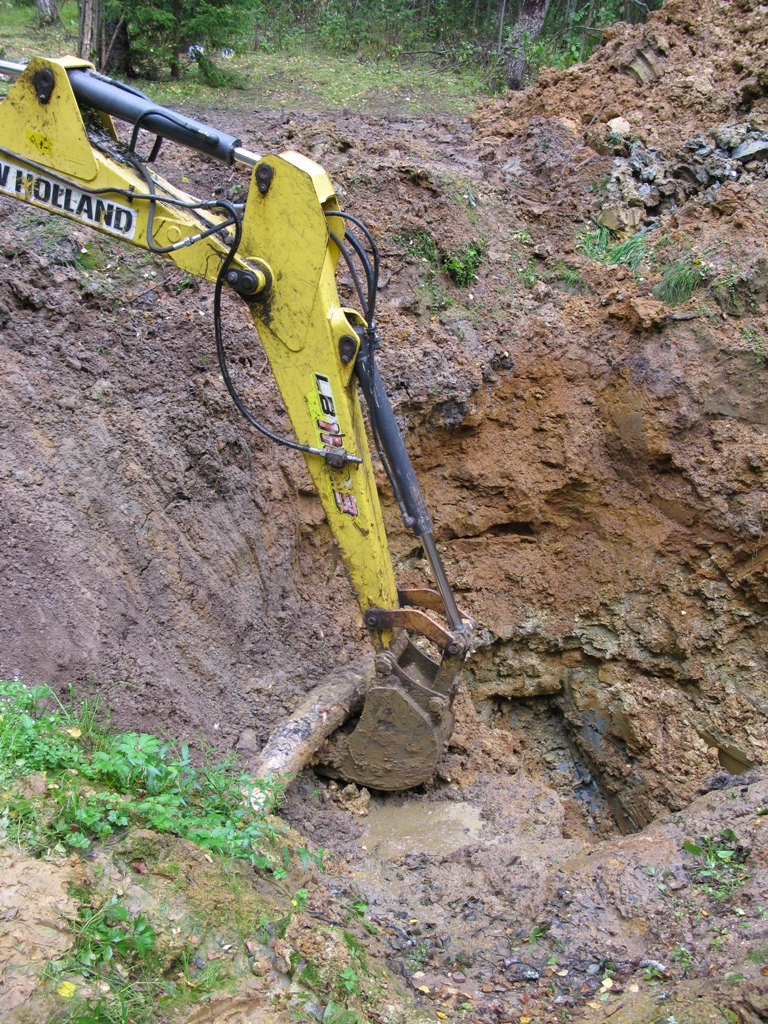 В этот раз удалось сделать просеку и воспользоваться помощью экскаватора. Трактор поработал всего лишь три часа и мы успели убрать старый отвал, подчистить яму и углубиться в точках "1" и "2" метра на четыре (стрела экскаватора не телескопическая). Результата ноль!