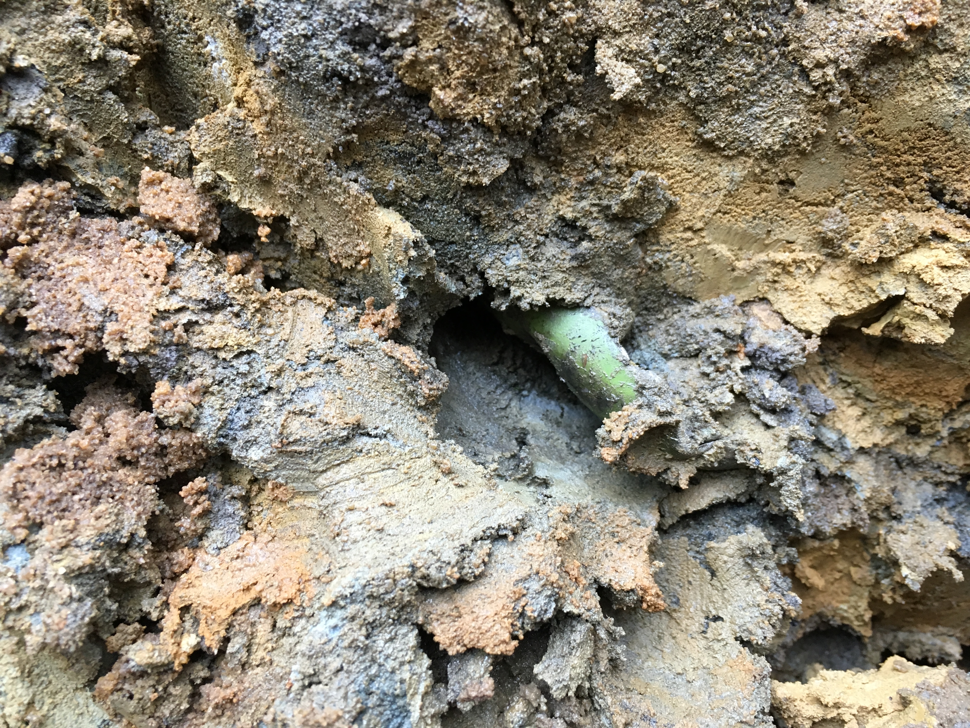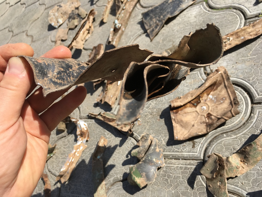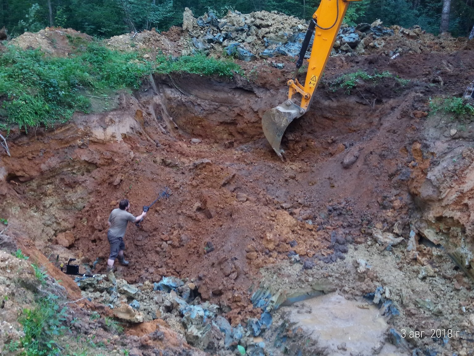Неделю назад с помощью неравнодушных людей нам снова выделили экскаватор. Привезли за сто с лишним километров на трале дали возможность досканально и окончательно проверить место падения. В общем итоге место падения было полностью взрыто во всех плоскостях. Общий диаметр ямы дошёл до двадцати метров и глубиной до шести метров. раскоп послойно проверялся глубинником и верховым прибором. В итоге мы не нашли почти ничего, кроме мелких фрагментов обшивки на глубине. Смесь песка и глины с глубиной переходила в щебень, затем в плотную синюю глину, которую невозможно укопать лопатой, а потом и восве шло сплошное известковое плато ,которое с трудом сковыривал экскаватор. Стало ясно, что ниже ничего нет и не может быть, хотя ТМ-ка нудно звенела в определённых местах, но это было очень похоже на минерализацию или что-то типа водяной жилы, так как это был уже сплошной материк. В итоге яму полностью засыпали и разровняли грунт.