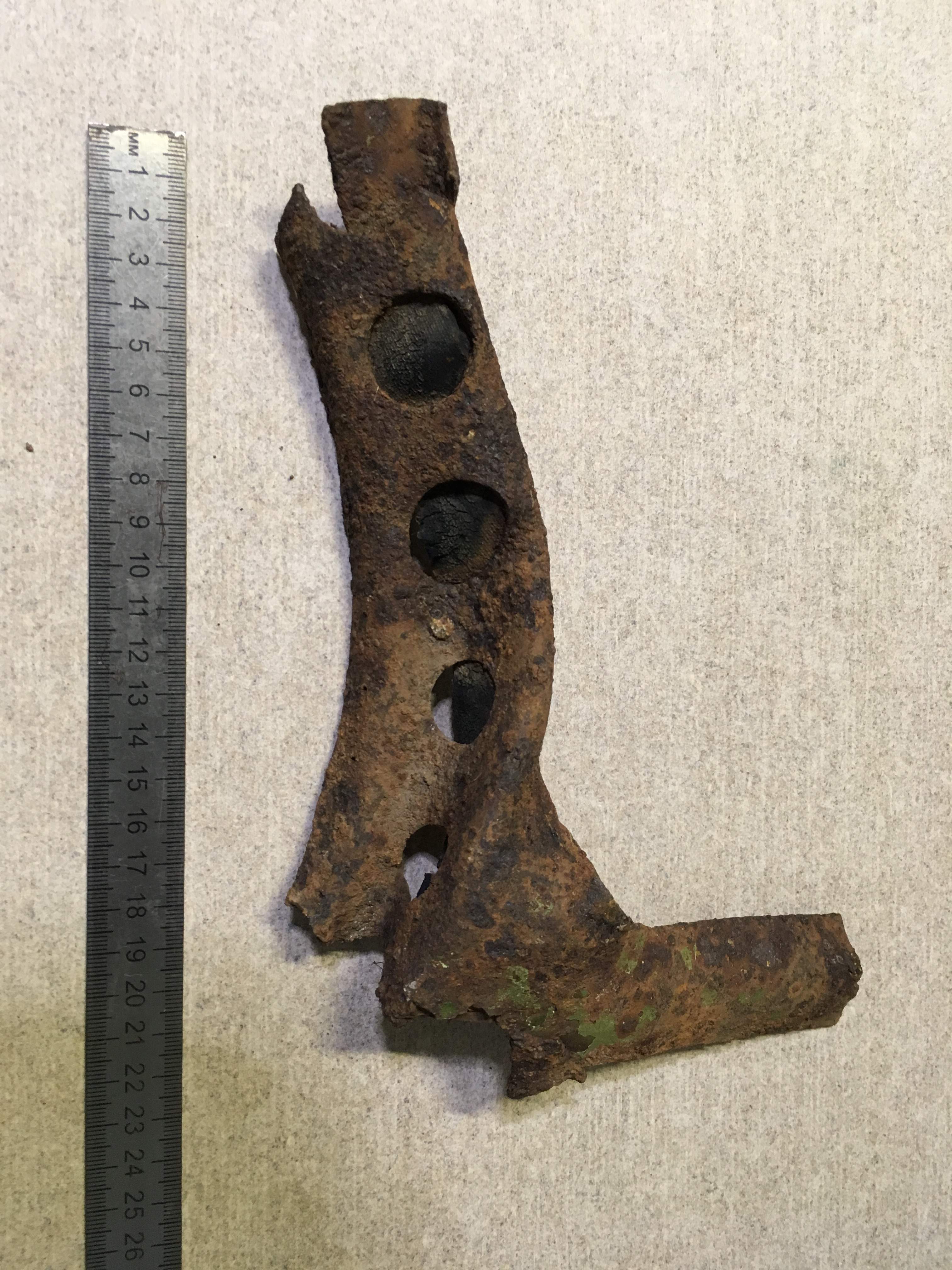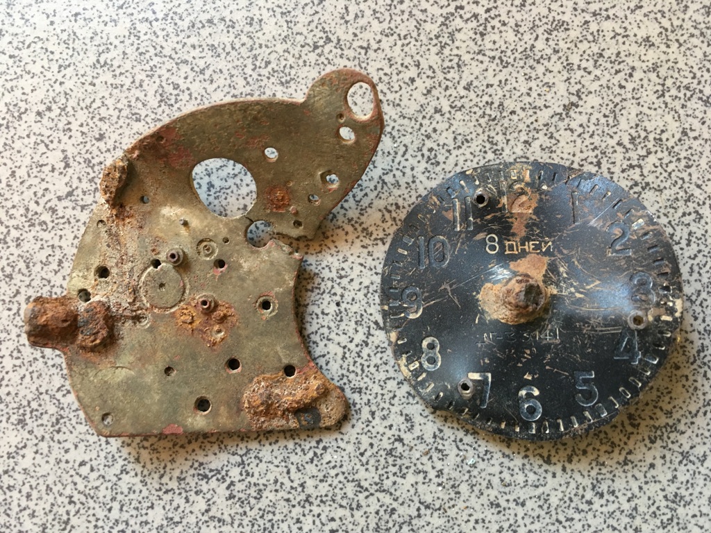 Наконец-то нам удалось попасть первый раз в этом сезоне на самолёт! Яма полностью заполнилась водой. Помогла только мощная помпа. Стенки оплыли на дно и грунт сильно размок, поэтому работать практически невозможно. В самой яме пока ничего не нашли,но глубинные сигналы имеются. Проверили территорию в радиусе 300 - 400 м в районе места падения: нашлись фрагменты обшивки, судя по всему нервюры от какой-то плоскости и очень похожую на крышку портсигара деталь, которая с одной стороны оплавлена (никаких надписей не было). Удалось перебрать отвалы с прошлого года. Нашли очень интересный фрагмент с номером. Очень похоже на стыковочный узел секций фюзеляжа или чего-то ещё. Номера: 41; 79  160. Это может иметь отношение к номеру самолёта?