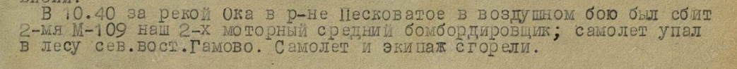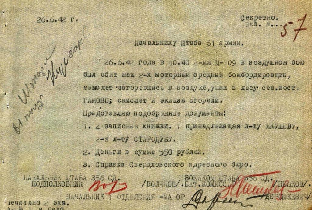 26.06.42 г. с боевого задания в районе г. Орел не вернулся экипаж 40 апдр: летчик лейтенант И.Ф.Якушев, штурман лейтенант Н.Ф.Стародуб.