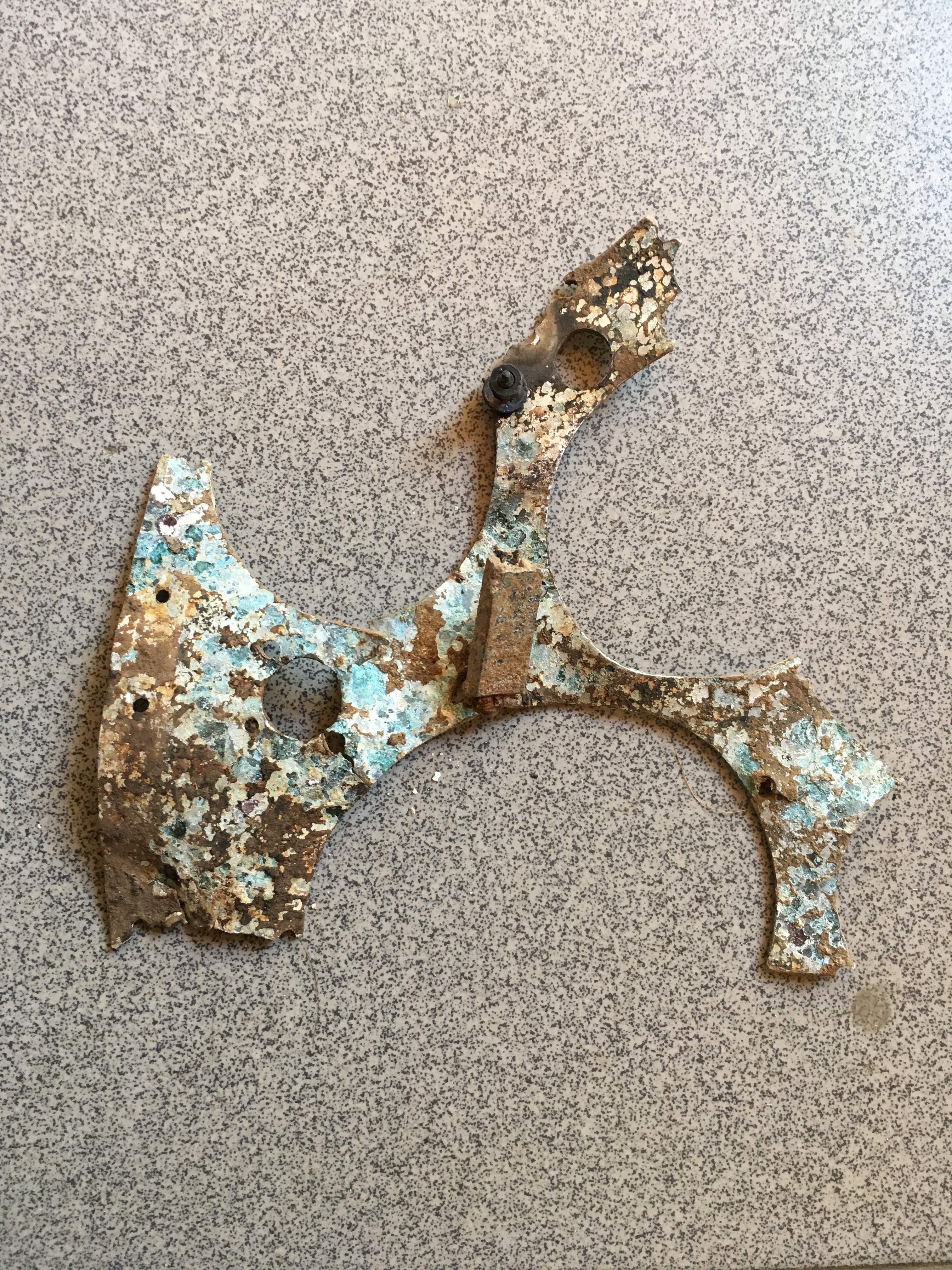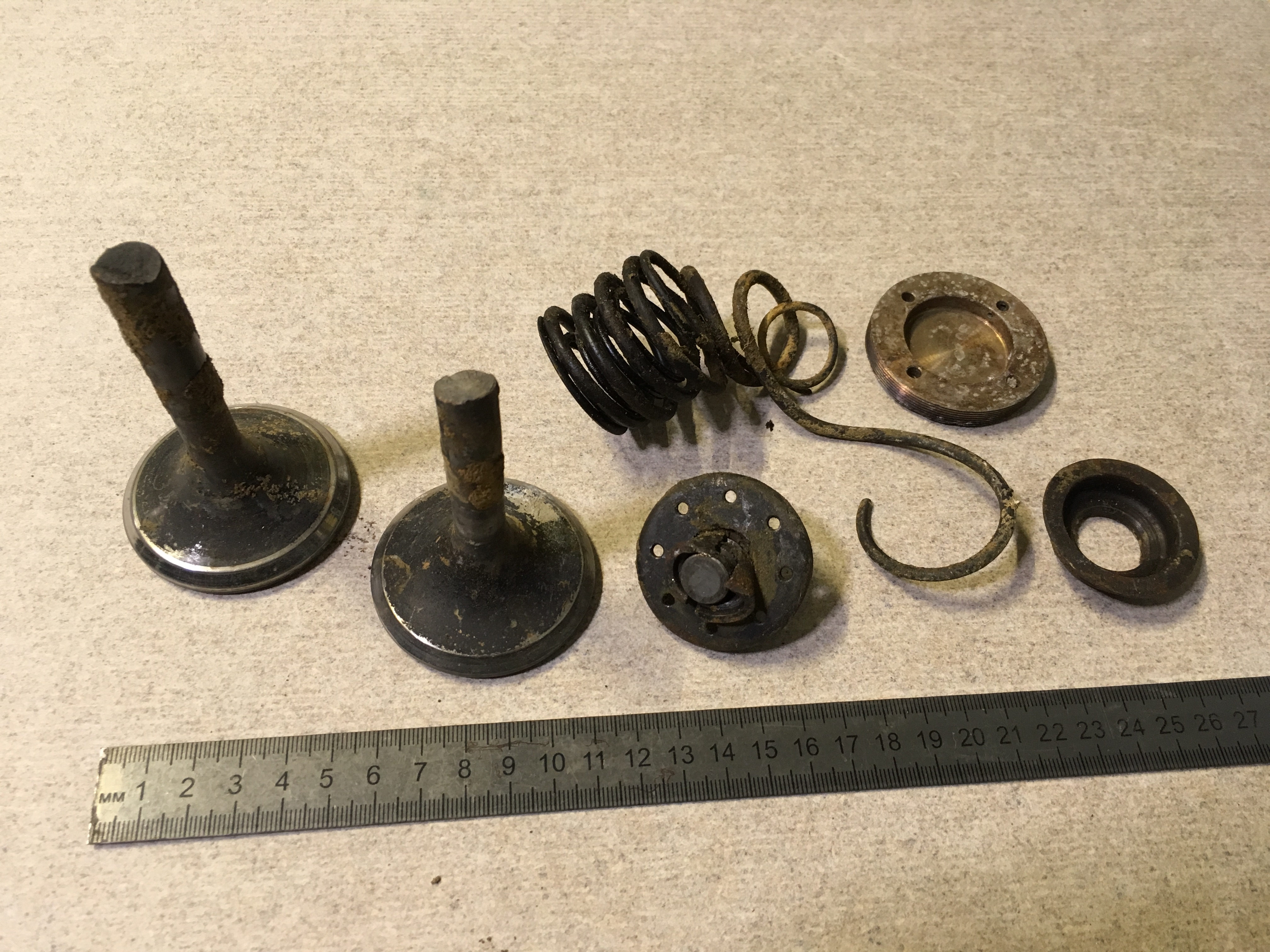 1. На глубине 1.5 м: передняя часть двигателя с шестернёй, фрагменты радиатора; на глубине 2м: два подкрыльевых РС, россыпь мелких деталей мотора, клапан мотора и карбюратор, мотор управления. Это получается левая сторона самолёта.