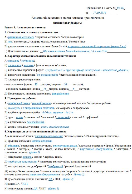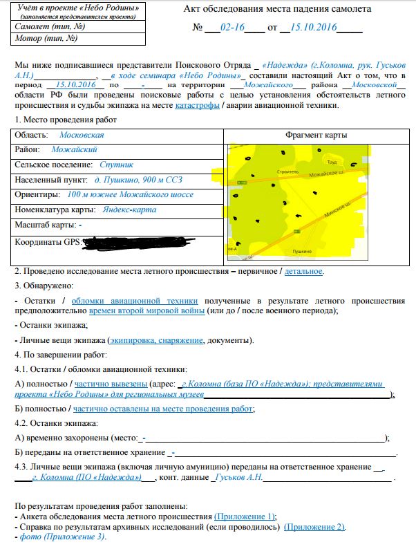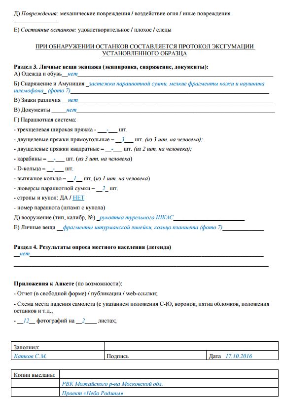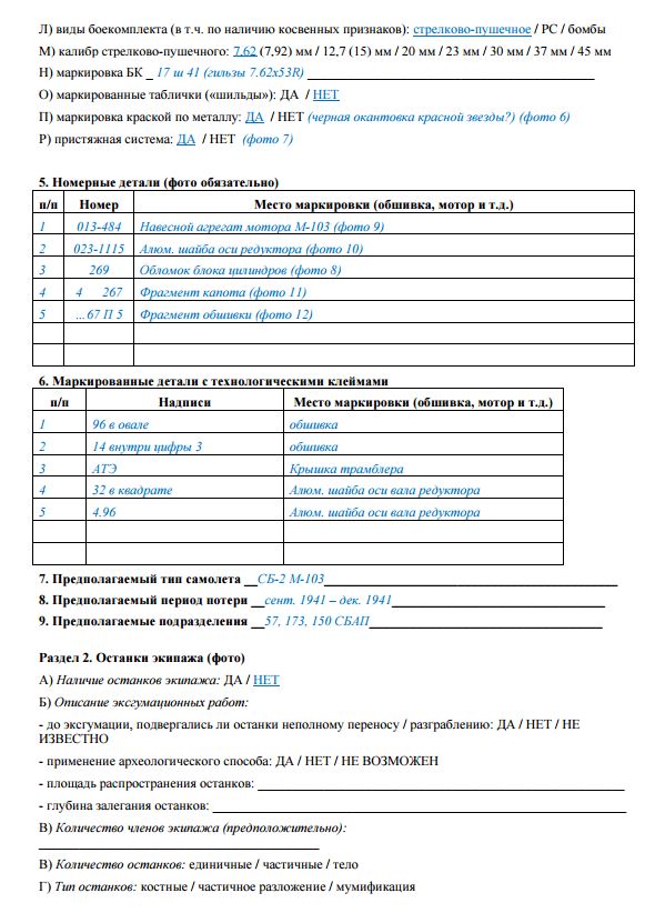 Опубликовано: 18 ноября, 2016 (изменено) Добрый день, В рамках проведения научно-практического семинара "Небо Родины" под эгидой "Поискового Движения России" 15.10.2016 года проведено детальное исследование места катастрофы самолета "СБ" в районе д. Пушкино, с/п Спутник, Можайского района, Московской области. В работе участвовали представители поисковых отрядов из различных регионов РФ и зарубежья. Проведено полное вскрытие воронки от места падения самолета и зачищена площадь основного разлета обломков (сплошным вскрытием на участке обнаружения парашютной системы и приборным поиском по периметру разлета). Обнаружены характерные обломки самолета типа СБ (части обшивки, конструкций крыла, внутреннего оборудования (приборы) и навесных агрегатов двигателя типа М-103), остатки боекомплекта (гильзы ш7.62х53R 1941 года выпуска завода №17 в Подольске), рукоятка турельного ШКАС. Также найдены части экипировки и снаряжения экипажа (части парашютного снаряжения, мелкие фрагменты кожи и наушника шлемофона, фрагменты штурманской линейки, кольцо планшета). Из парашютной системы найдены двущелевые пряжки и вытяжное кольцо на один комплект, люверсы парашютной сумки (все на локальном участке в эпицентре шлейфа обломков). Самолет упал вблизи от Можайского шоссе. Место падения представлено двумя воронками до 2-3 м глубиной на расстоянии около 5 м с понижением между ними. Воронки выбраны в прошлом (крупных деталей нет, следы подъемных работ и крепи). По шлейфу обломков от основных воронок азимут падения определен как 30-45 гр северо-восток. Падение под крутым углом. В воронках и на их бортах обнаружены: Навесной агрегат мотора М-103 с номером 013-484, обломки опорной шайбы ведомой шестерни редуктора с номером 023-1115. В шлейфе обломков обнаружены: фрагмент обшивки с номером ...67 П 5, фрагмент капота с номером 4/267, фрагмент обшивки с видимой черной "окантовкой звезды", технологические лючки и разрушенные приборы (в. т.ч. шкалы приборов «темп. масла» и «высота») Таким образом, предположительно найден самолет СБ № .../267 с моторами М-103А №№ 023-1115 и (?) 013-484, погибший предположительно в период осени 1941 - зимы 1942 года. Предположительно при крушении в самолете находилось не менее одного члена экипажа. По архивному поиску в настоящий момент установлено, что: - на дату 01.09.1941 мотор М-103А №013-484 выпуска 1940 года завода №26 стоял на СБ №2/263 и был направлен из 65 ОАЭ МВО в 77 САД (г.Тула). - в 77 САД ВВС МВО был только один полк на этом типе самолетов - 173 СБАП. - 173 СБАП входил в 77 САД до 13.10.1941, когда 77 САД была передана в состав ВВС 5А, а затем ВВС Западного Фронта. 173 СБАП при этом остался в прямом подчинении ВВС МВО. - СБ №2/263 на конец марта 1942 года также проходит по документам ВВС МВО (видимо тот же 173 СБАП), НО с другими номерами двигателей. - 173 СБАП ВВС МВО (ВВС МЗО) действовал в т.ч. на Можайском направлении в период ноября 1941 - января 1942 года с аэродромов Раменское и Кубинка. - Также в данном направлении в конце 1941 года работал 150 СБАП ВВС Западного Фронта. Поскольку деталь с №013-484 является частью навесного оборудования, то в процессе ремонтов в рем.частях 77 САД (или иным способом) она теоретически могла попасть в последующем на самолет ВВС Западного Фронта (тот же 150 СБАП). - В данном направлении есть единичные потери как у 173 СБАП, так и у 150 СБАП. Просим сообщить, если у кого-то есть дополнительные сведения о найденны