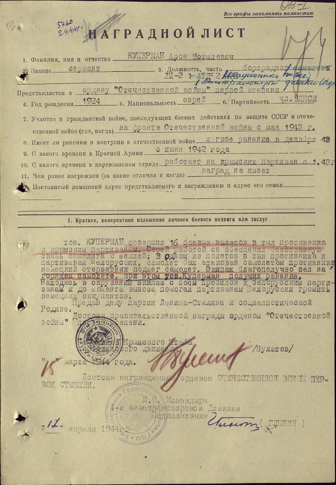 Опубликовано: 22 ноября, 2016 Куперман Арон Мотылевич. Бортовой радист. Погиб в августе 1944г. на Западной Украине. Наградной в 1-й авиа транспортной дивизии ГВФ, апрель 1944 г. 0 Упомянуть пользователя Поделиться сообщением Ссылка на сообщение Поделиться на других сайтах