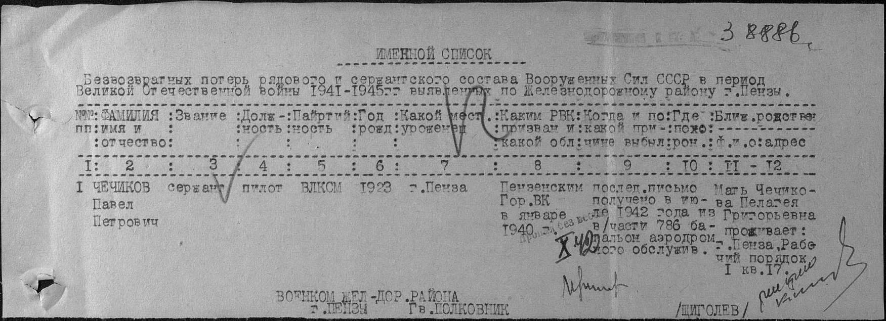 Опубликовано: 6 января, 2017 Сержант Чечиков (Чичиков) Павел Петрович пилот Ил-2 из 41 шап, проходившего подготовку в 1 зап. авиа бригаде погиб в катастрофе 16 июня 1942 года в Куйбышевской обл. Самолет упал в районе аэродрома Толкай в Кинель-Черкасском районе. Его я приводил ранее как пример того, что имена многих погибших летчиков утрачены на захоронениях Куйбышевской/Самарской области (и в других тыловых регионах). Удалось в делах Приволжского ВО найти отчет о катастрофе , узнать полное имя пилота. В ОБД "Мемориал" по нему нашелся в послевоенном списке из военкомата г. Пензы, т.н. подворовой обход. В данных полностью совпадает имя, звание, должность, последнее письмо получено в июле 1942 года из 786 БАО, которое обслуживало 1 запасную авиа бригаду. Иногда в документах фамилию членов семьи называли как Чичиков. Адрес матери Чечикова Пелагея Григорьевна, г. Пенза, ул. Рабочий порядок, д.1, кв.17. В списках захоронений имя Чечикова (Чичиков) отсутствует. Понятно, что его похоронили, но имя на могиле и в списках захоронений затерялось. Увы, это обычная судьба. Нужно будет попробовать разыскать родных Чечикова в Пензе. Возможно, они так и не узнали о месте его гибели. 1 Упомянуть пользователя Поделиться сообщением Ссылка на сообщение Поделиться на других сайтах
