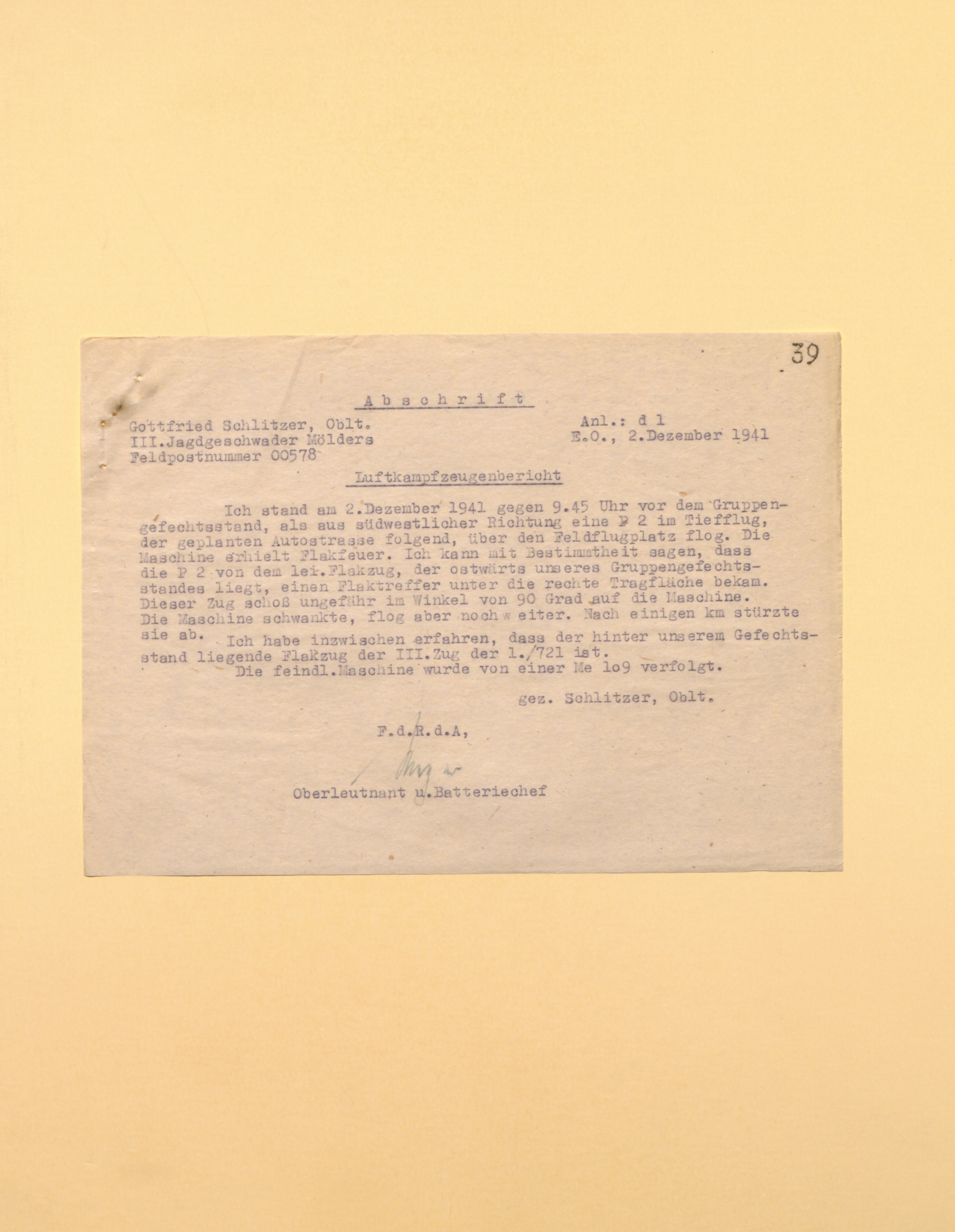 Опубликовано: 10 сентября, 2022 (изменено) @катуар Вы все правильно сделали.Большое Вам спасибо.Ваша информация считаю по теме.Из перевода видно что самолет Пе-2 уходя вдоль дороги от преследования Ме-109 (т.е. с юго-западного направления) на высоте 50 м был сбит ЗА..От прямых попаданий 37 и 20 мм снарядов загорелся правый мотор и центроплан,был сброшен колпак и два члена экипажа выбросились на парашютах над лесом.Один приземлился на лес,второй зацепился за самолет парашютом и упал рядом с самолетом.Время немецкое 9.35 2.12.41г. Как я понял говорится про полевой аэродром Малоярославец ( прямоугольник в окружении зенитных подразделений)..Самолет упал в конце взлетки,зацепив предварительно высокие деревья, и взорвался ."Пешка" вела огонь по аэродрому с бортового оружия.Вреда не нанесла.Насколько точно немцы с земли определили Пе-2 не знаю.Возможно это был Пе-3. Изменено 10 сентября, 2022 пользователем Юрий Анатольевич дополнение 0 Упомянуть пользователя Поделиться сообщением Ссылка на сообщение Поделиться на других сайтах