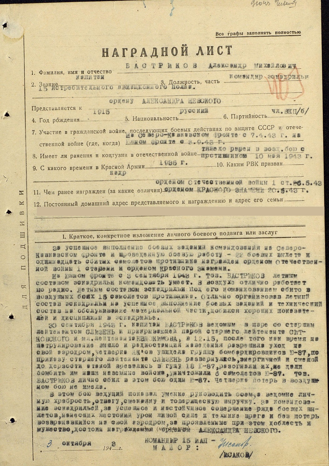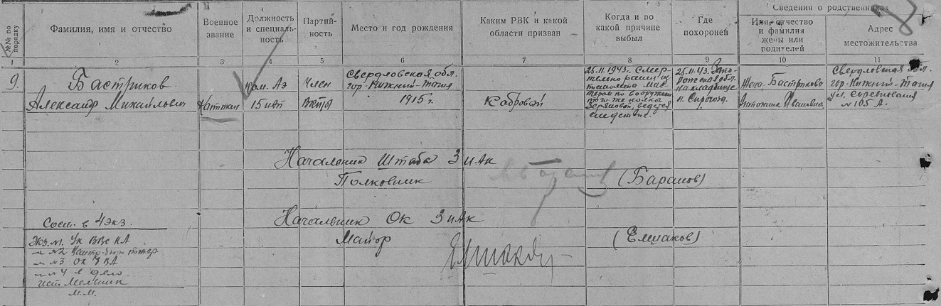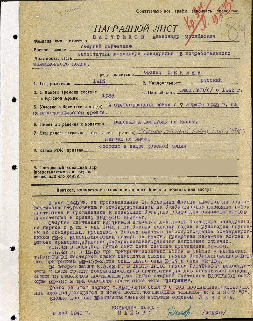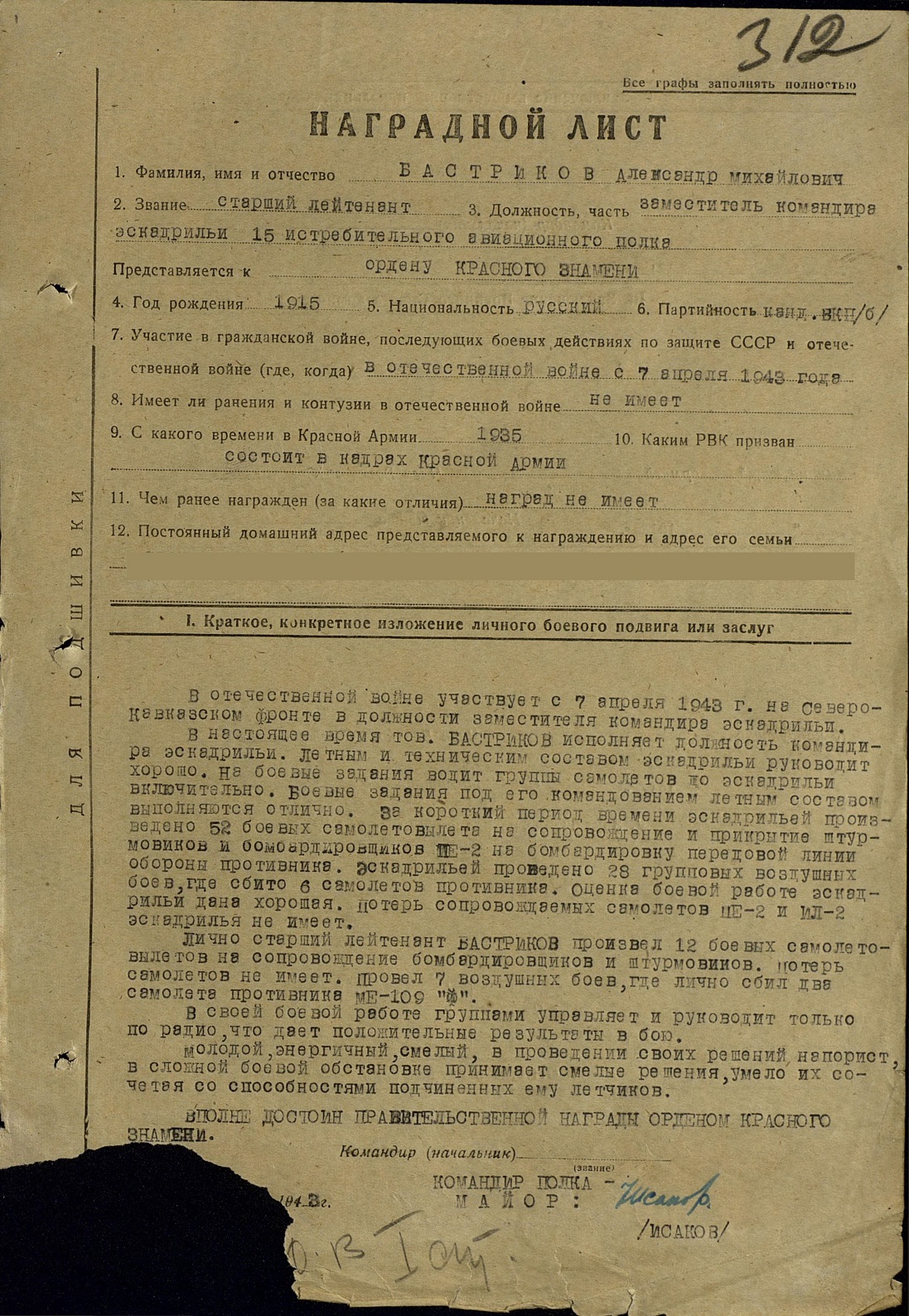 Опубликовано: 9 сентября, 2017 В соответствии со сведениями о состоянии материальной части в 278 ИАД по состоянию на 22.04.1943 г., самолет Як-7Б № 4011 с мотором М-105ПФ № 4-2533 находился в исправном состоянии и был закреплен за старшим лейтенантом Бастриковым. Самолет Як-7б № 4011 с мотором М-105ПФ № 4-2533 был исключен из списков 15 ИАП 278 ИАД как сгоревший при выполнении боевого задания 10.05.1943 г. (Приказ по 15 ИАП № 031 от 16.05.1943 г.). В соответствии с Оперативной сводкой № 23 штаба 278 ИАД от 10.05.1943 г., в 16:39 4 Як-7б 15 ИАП ведущий ст. л-т Бастриков, вылетели на перехват бомбардировщиков противника в район Крымская, Абинская. В результате воздушного боя не вернулись из боевого задания 3 Як-7б, летчики: ст. л-т Бастриков, мл. л-т Лосев и мл. л-т Сорокопудов. В соответствии с Оперативной сводкой № 26 штаба 278 ИАД от 13.05.1943 г., по уточненным данным 10.05.1943 г. ст. л-т Бастриков и мл. л-т Лосев вели воздушный бой с Фв-190 и Ме-109 в районе южнее Крымская. В воздушном бою Бастриков был сбит, выбросился с парашютом, самолет сгорел, летчик имеет ранения мягких тканей обеих верхних и нижних конечностей и грудной клетки. 0 Упомянуть пользователя Поделиться сообщением Ссылка на сообщение Поделиться на других сайтах