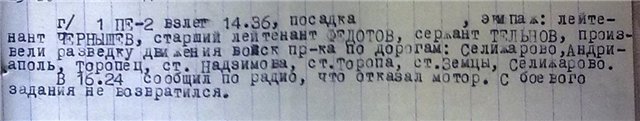 Костя,боевое напряжение на экипажи самолетов Пе-2 бомбардировочных и развед.полков два вылета в день. По одному и тому же маршруту  мог летать не один экипаж. Тем более если НВБВ экипаж,то задание не выполнено и пошлют следующий экипаж. Маршут Пе-2 л-та Чернышова из 514 бап известен,время вылета и время отказа  мотора известно.Долго на одном моторе не всякий пилот Пе-2 протянет.Это не СБ. Крейсерская скорость Пе-2 порядка 400 км/ч. Учти встречный ветер до ст.Назимово и попутный после. Смоделируй полет вашего Пе-2 до ВП с последующим капотом и катастрофой. И стрелок мог быть выброшен и далеко. За пример можешь взять полет пары Пе-2 из 202 бап вылетевшей с аэродрома Колпачки 14.12.42г. в р-н В.Лук, радиосвязь с которой оборвалась через 30 минут полета. И лежат они до сих пор в лесу в р-не Потураево,что Ю-З Андреаполя. Отдельное спасибо Тарасу,что нашел этому документальное подтверждение в ЦАМО.