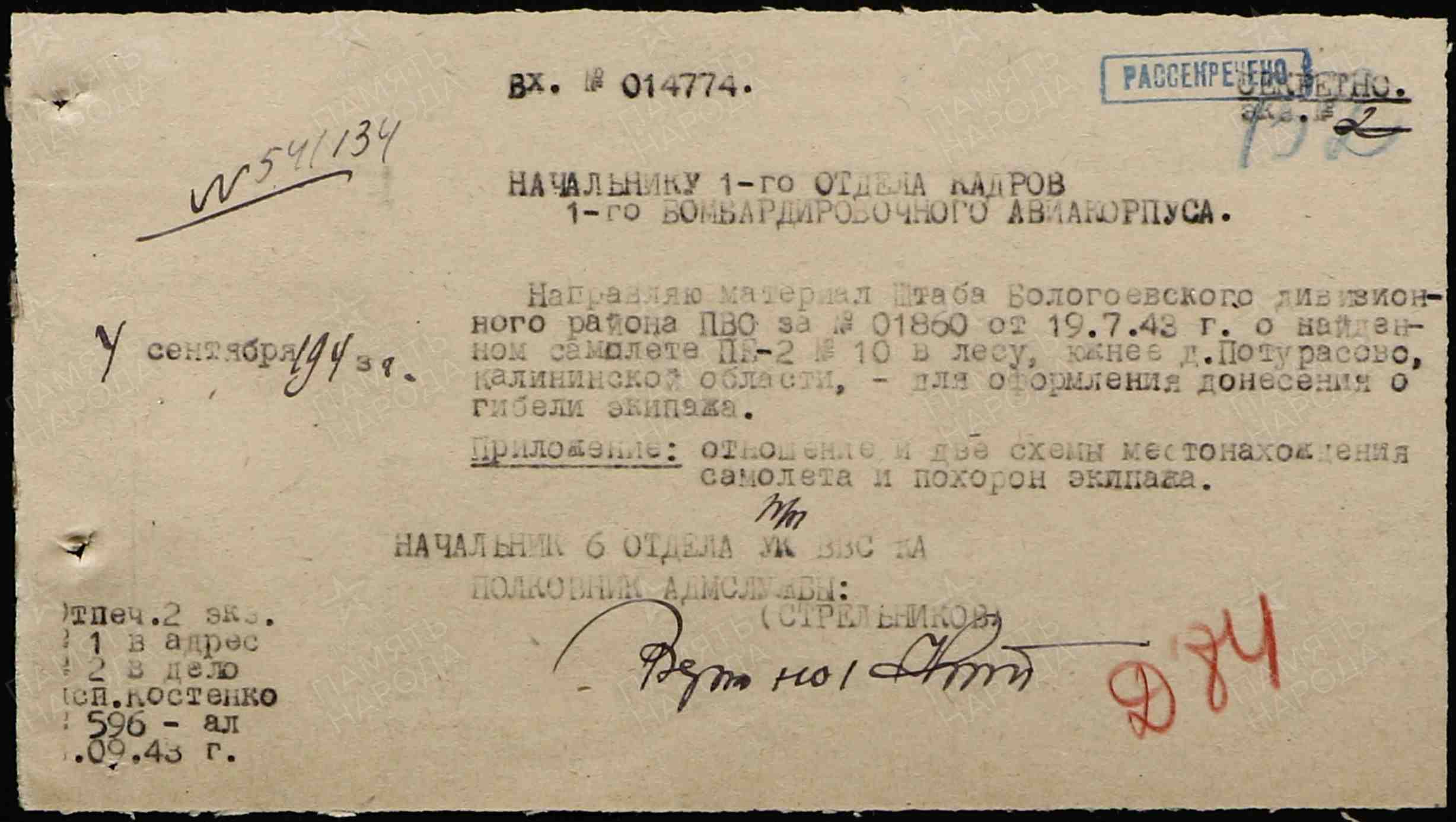 Прошу владельцев баз номеров Пе-2, соответствует ли этот номер номеру самолета, на котором 14.12.42 погиб экипаж П.А. Иванов, штурман А.А. Житов, стрелок - радист П.Н. Никулин.