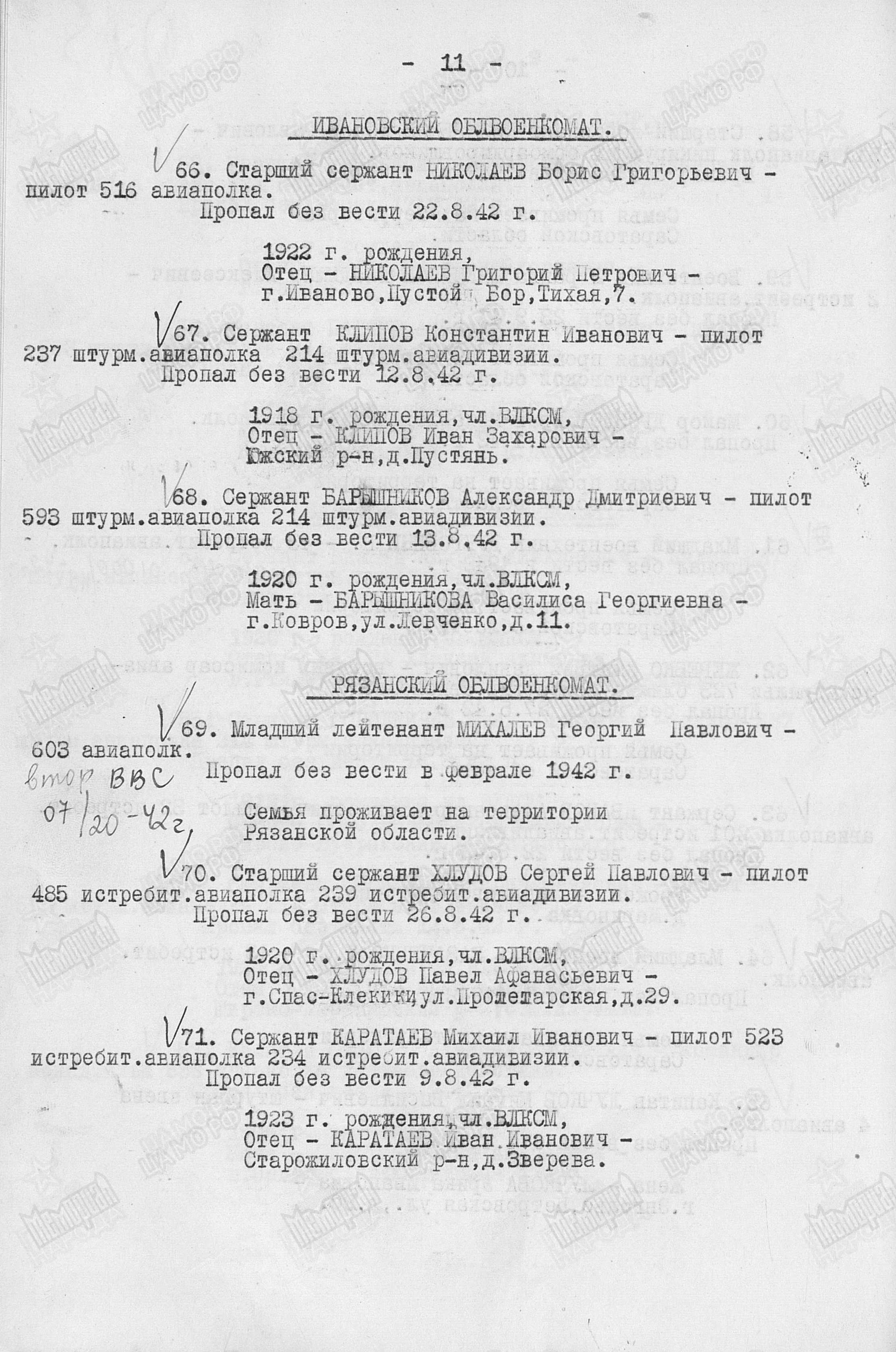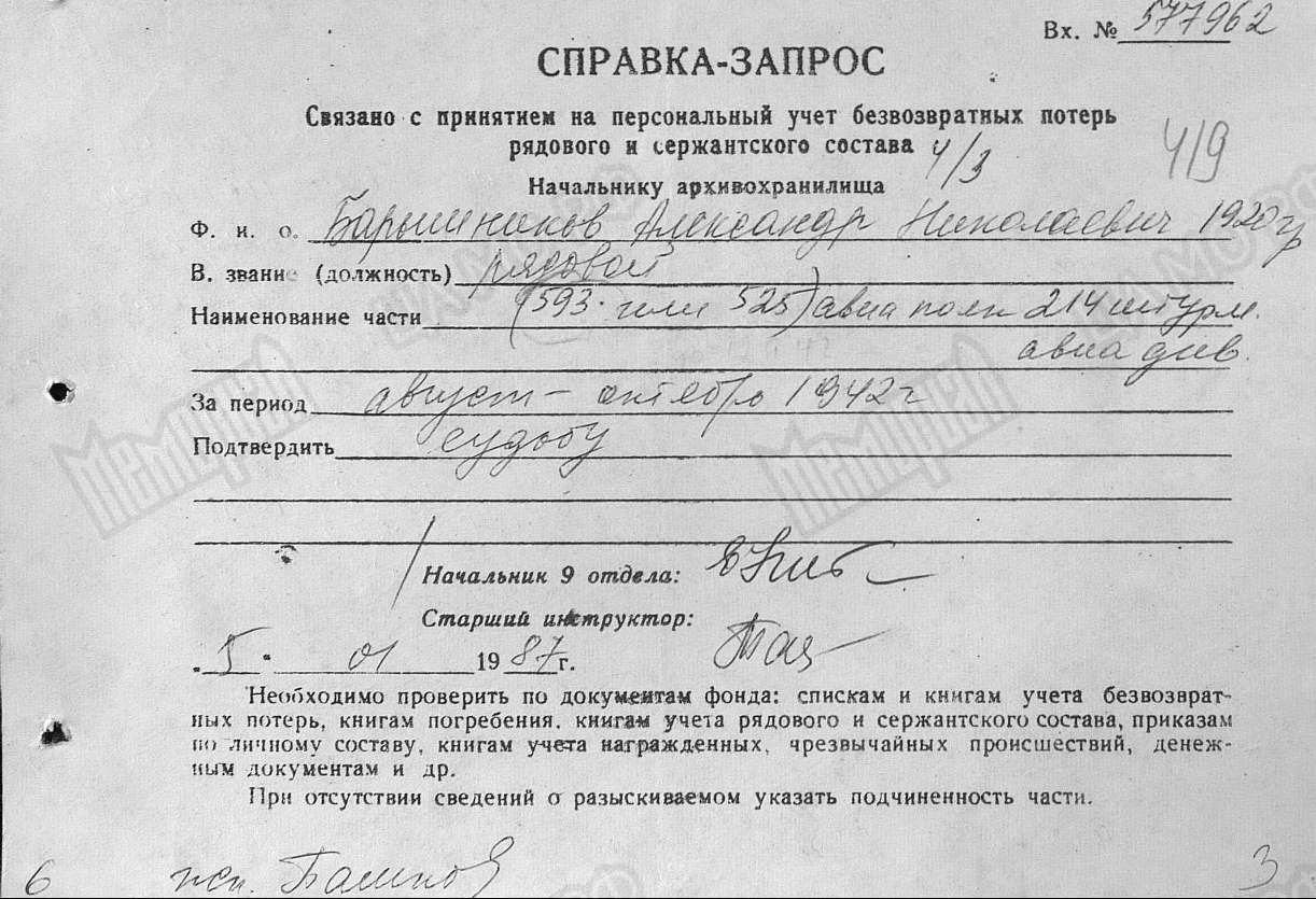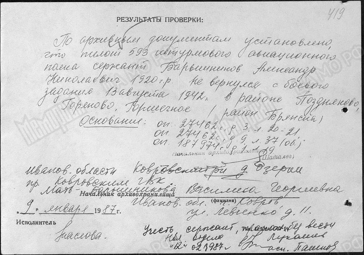 Опубликовано: 15 октября, 2018 Юкина Татьяна Валерьевна (г.Ковров) - http://www.moypolk.ru/kovrov/soldiers/baryshnikov-aleksandr-nikolaevich "Барышников Александр Николаевич. Сержант. Брат моей прабабушки. Родился в г. Коврове 25 декабря 1920 г.Окончил аэроклуб в г. Коврове. В 1940 году поступил в Балашовское военное летное училище. В декабре 1941 года досрочно окончил его и был направлен на фронт в звании сержанта. Воевал в составе 593-го ШАП (штурмовой авиаполк) на самолете ИЛ-2.13 августа 1942 года пропал без вести на боевом вылете в р-не г. Брянска." Фото по ссылке. Можно связаться с автором. 1 Упомянуть пользователя Поделиться сообщением Ссылка на сообщение Поделиться на других сайтах