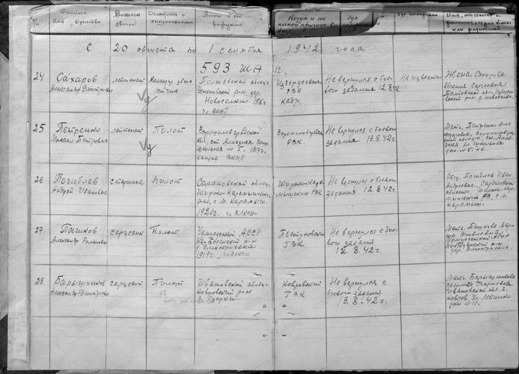 Опубликовано: 15 октября, 2018 ЦАМО фонд 214 шад, оп. 1, д. 4 Оперативные сводки дивизии 1942 л.л. 162-162 об Оперсводка 214 шад за 13.8.1942 22.00 Потери (593 шап) нбз: Пилот мл. л-т Петренко Михаил Антонович, нбз Ил-2 №1873907 (второе упоминание - Ил-2 №1873907) Пилот с-т Пашков Александр Романович нбз Ил-2 №1876907 (второе упоминание - Ил-2 №1876907) Пилот с-т Барышников Александр Николаевич нбз Ил-2 №1878607 (второе упоминание - Ил-2 №1878607) Штурман полка к-н Дьяченко Михаил Антонович над целью подбит ЗА. На обратном маршруте отказал мотор, вынужденно сел в районе Воронинка (8 км ЮВ Сухиничи). Летчик невредим, вернулся в часть. Ил-2 №1876907, состояние неизвестно. (второе упоминание - Ил-2 №1873907). Т.е. у Дьяченко скорее всего дважды ошибочно номер? А у всех нбз оба раза упоминаются те же номера. 1 Упомянуть пользователя Поделиться сообщением Ссылка на сообщение Поделиться на других сайтах