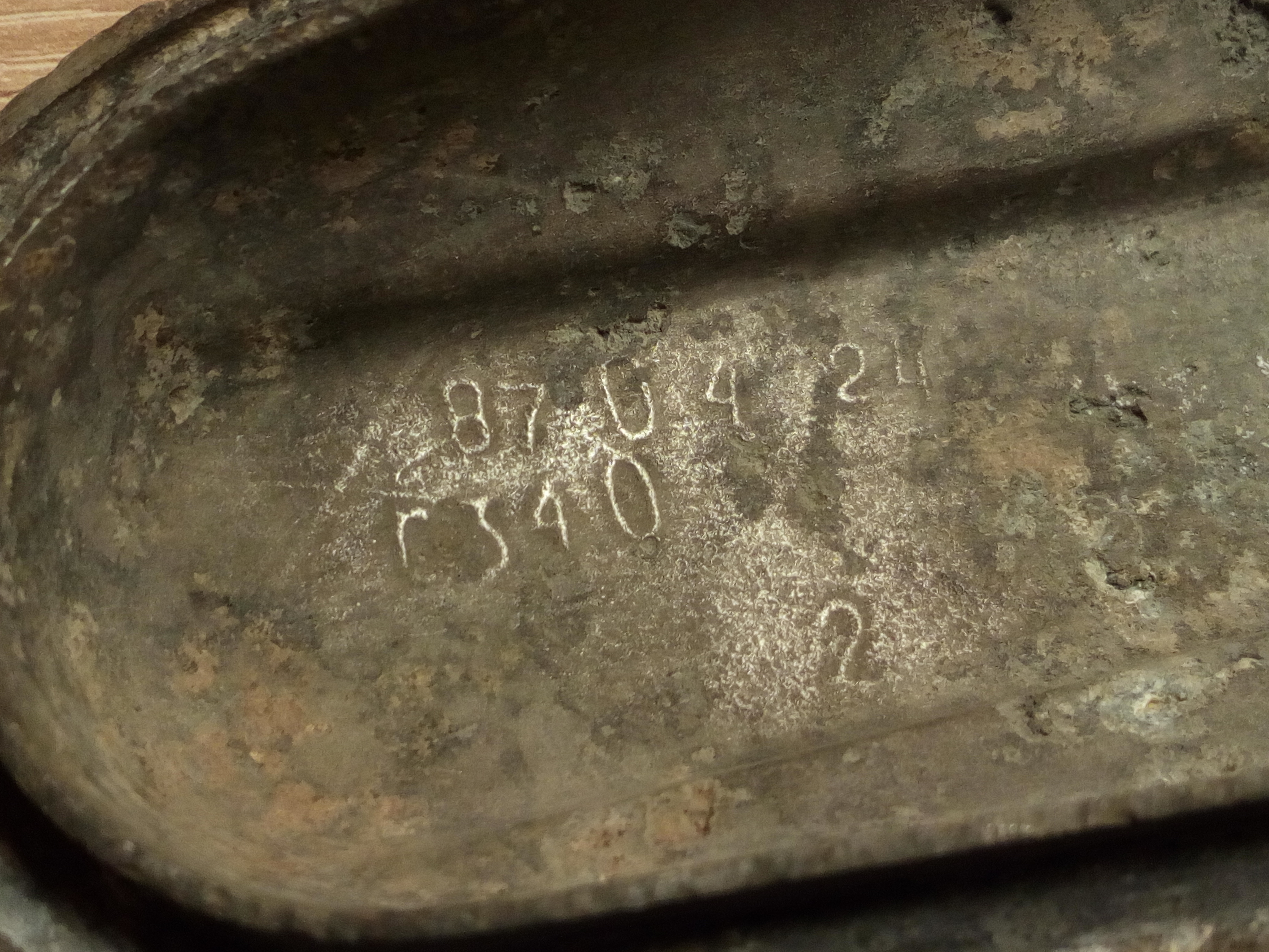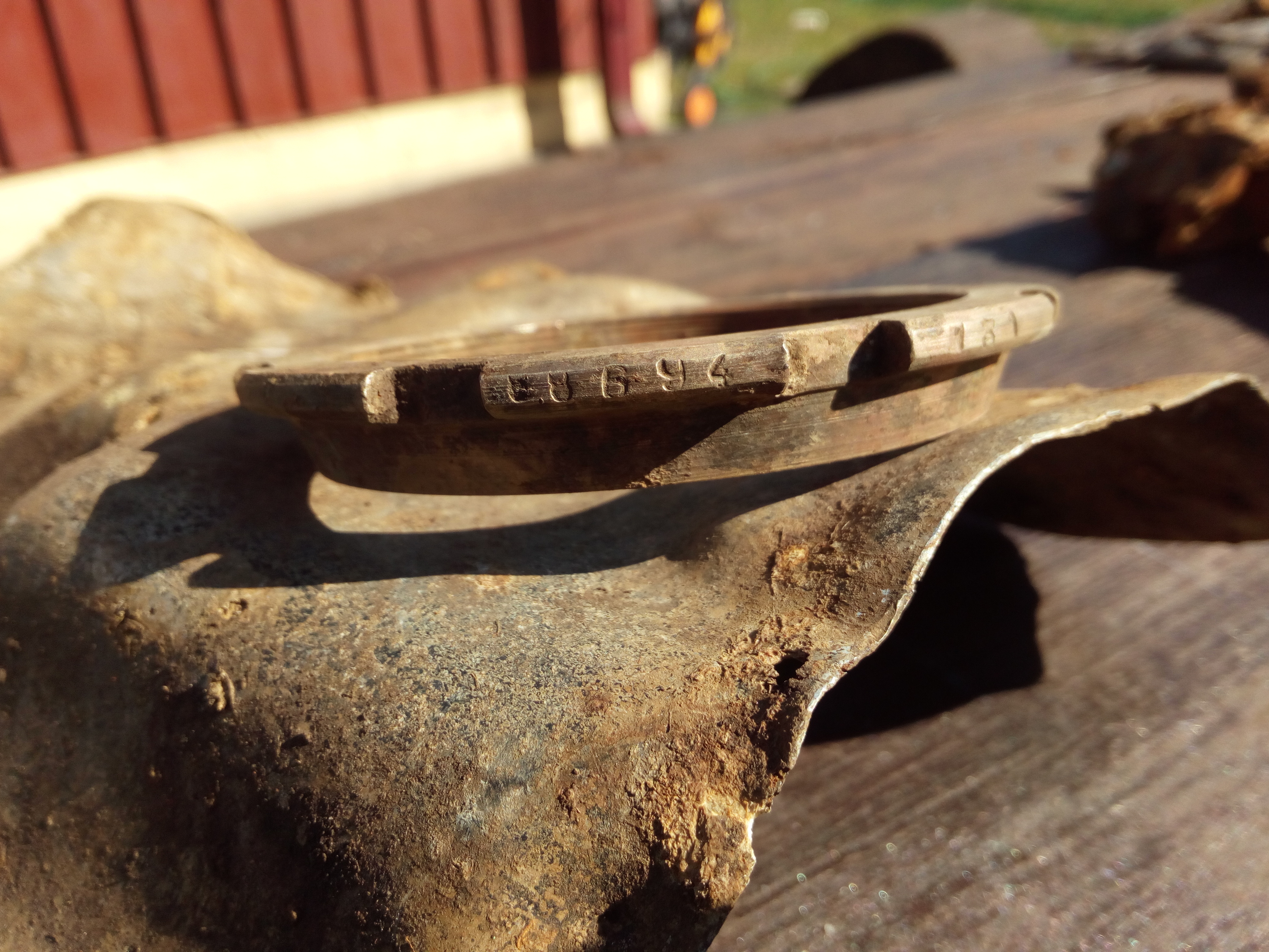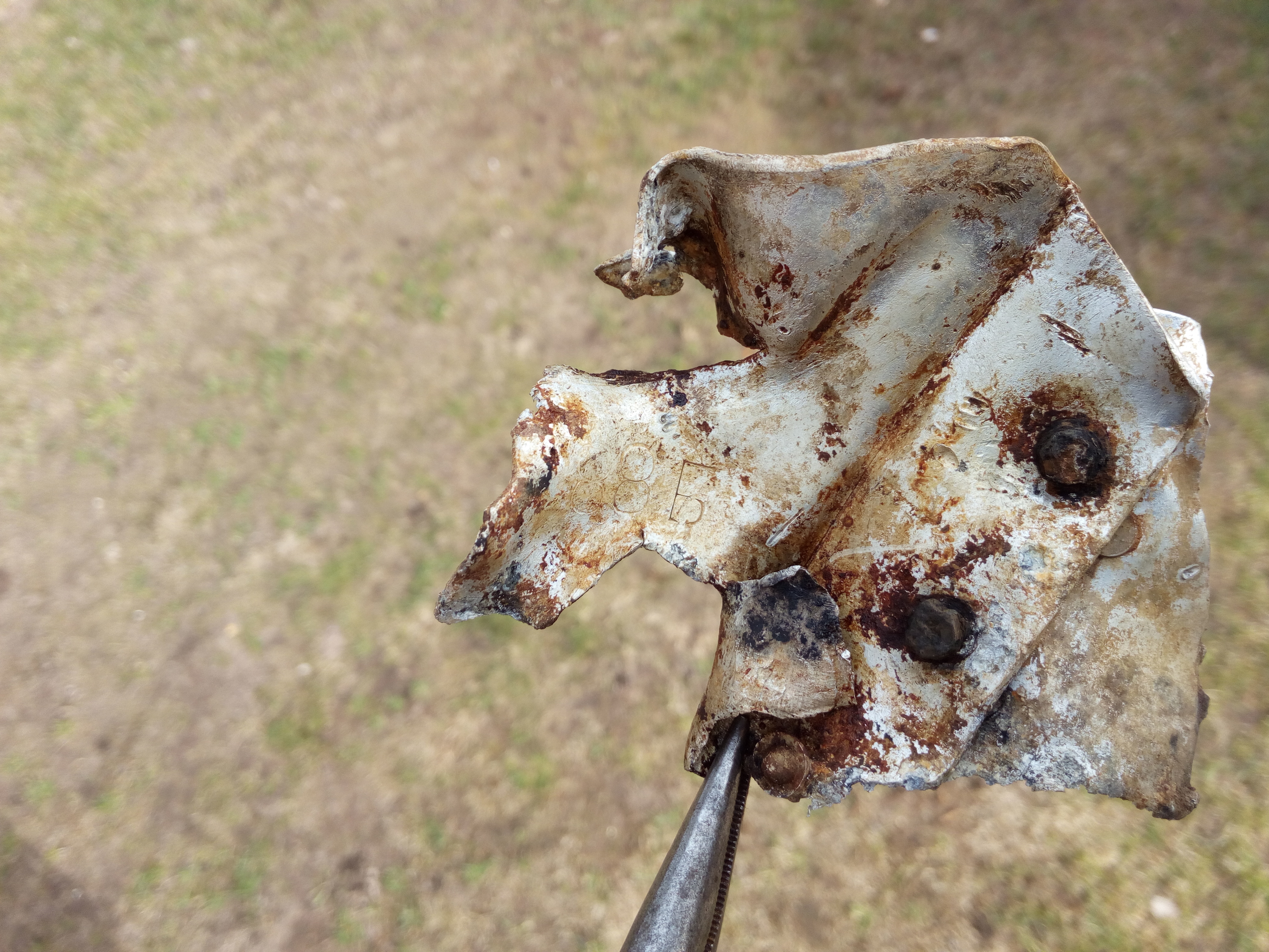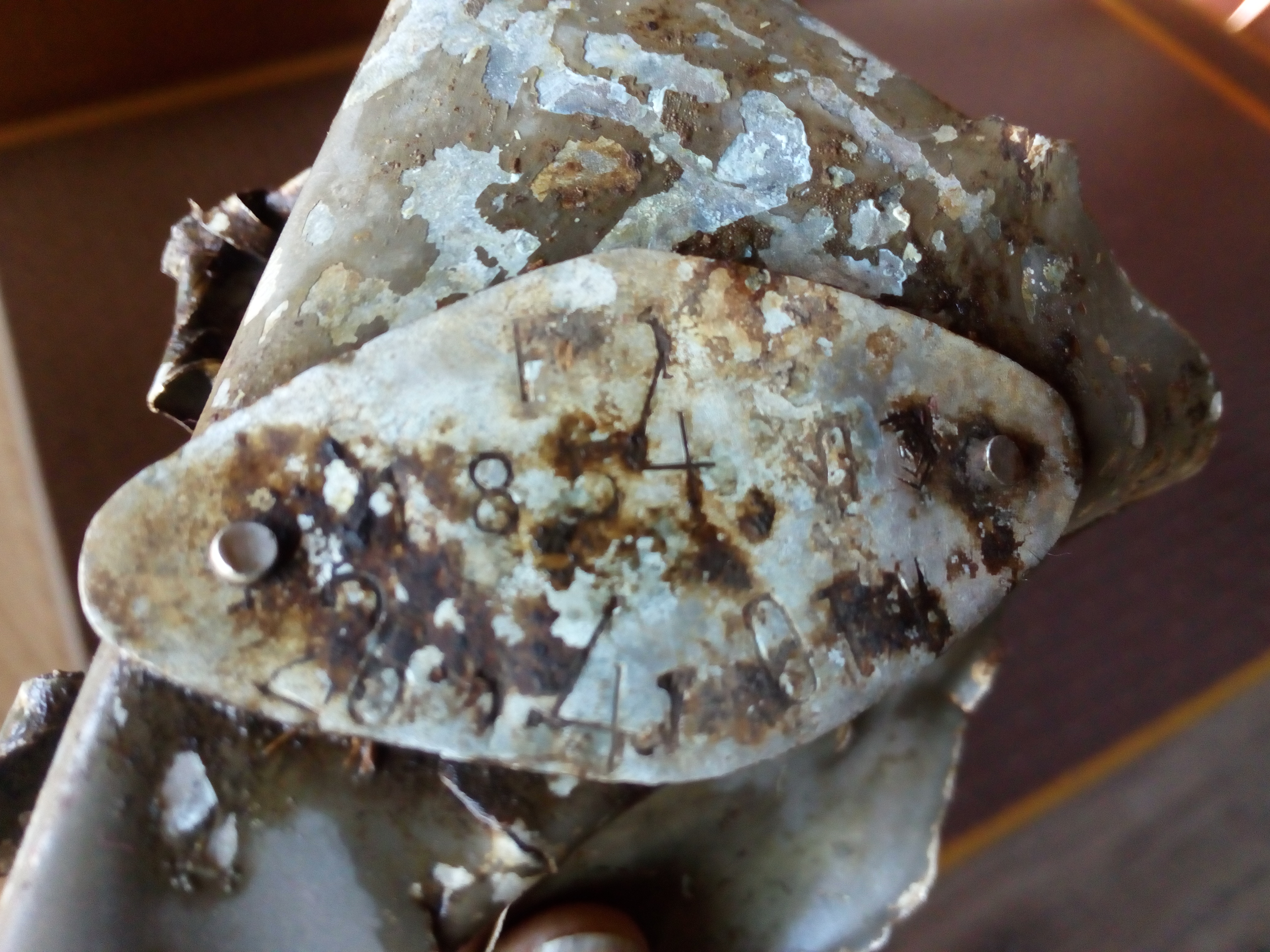 Опубликовано: 16 апреля, 2019 Спасибо за ответ, фото чуть позже к сожалению. Но! По результатам воскресного выезда к месту падения набор фрагментов самолета значительно пополнился. Все нуждается в чистке, на что сейчас нет времени. Но главное хочется показать не откладывая. На месте разборки мотора найдено бронзовое кольцо, или гайка. Легко читается «88694» на одном зубе и «131» на другом. Вопрос к уважаемым знатокам: может ли это быть номером мотора? Ну и другая находка — шильда на фото. «Р 1 1854 Л 26 1 41 ОТК» Давайте обсудим. С уважением. 4 Упомянуть пользователя Поделиться сообщением Ссылка на сообщение Поделиться на других сайтах