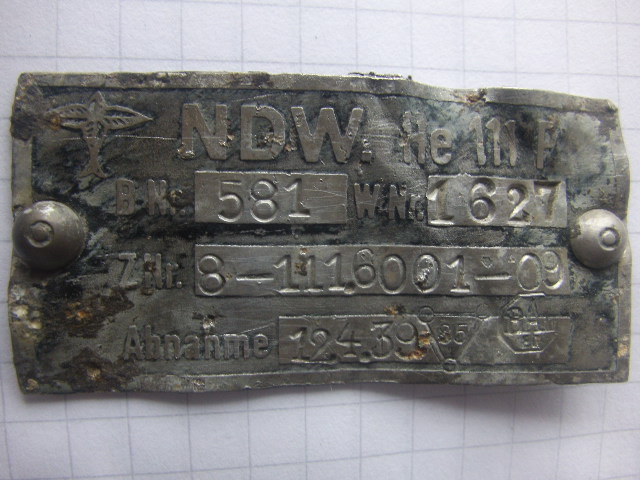 Опубликовано: 20 апреля, 2019 Не трудно, но не вполне понимаю столь пристального внимания к W.Nr 1627, если его судьба никак не проливает свет по делу найденной машины. Сводка 31.01.1942 - Transportverbände (Средиземноморье-Африка): 11.01.1942 - KGr.z.b.V. He 111 - Palermo - Bruchlandung infolge Motorschaden - He 111 P-2 - 1627 - 80%. Кстати говорят, что несколько лет назад был другой аналогичный шильдик с W.Nr. "1627", но с B.Nr. 583 и Z.Nr. 8-111.538 с датой от 06.1939. С того же самолета или с другого не ясно... 0 Упомянуть пользователя Поделиться сообщением Ссылка на сообщение Поделиться на других сайтах