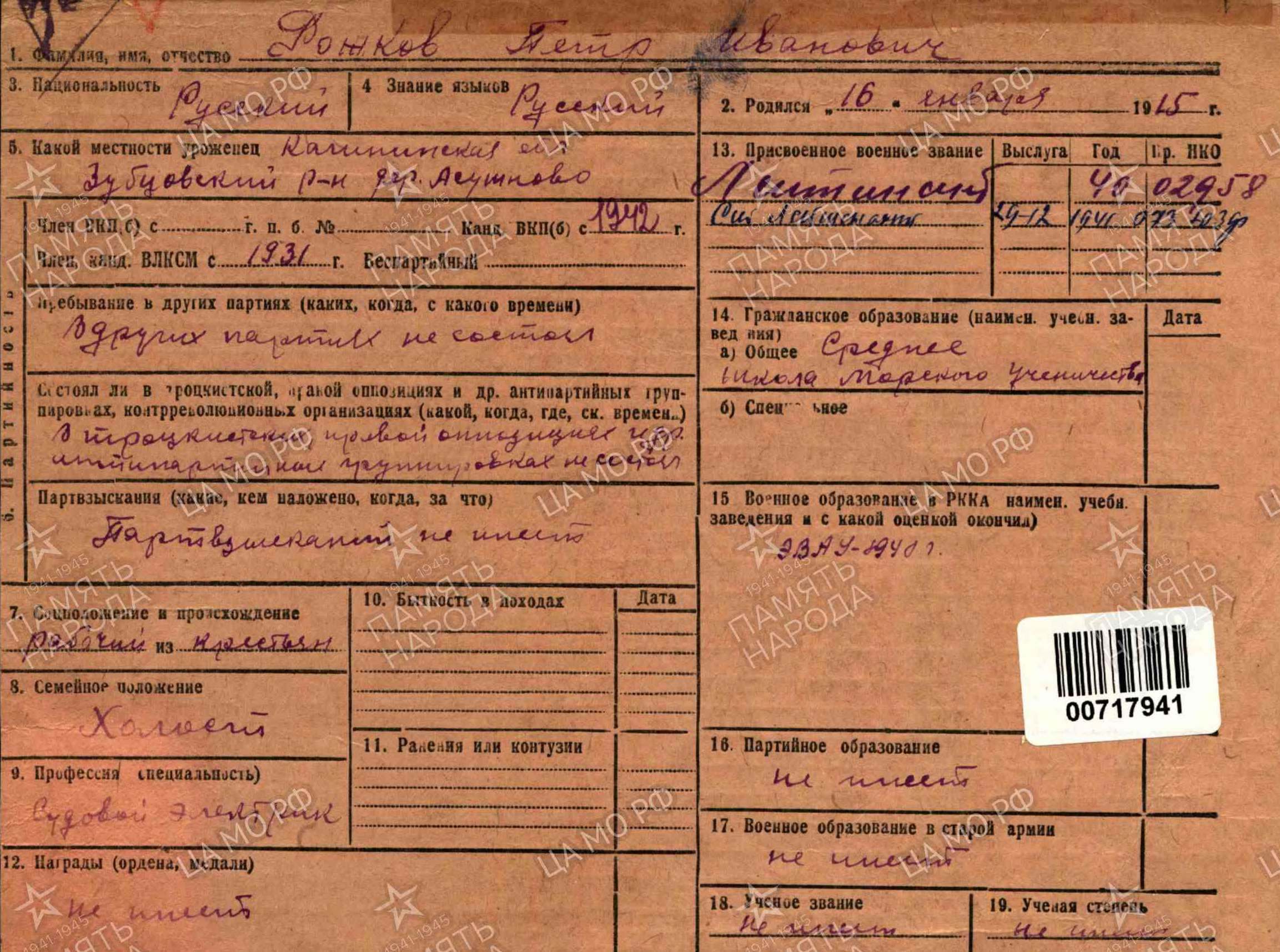 Опубликовано: 16 апреля, 2021 (изменено) Пишу здесь, чтобы не создавать новую тему. На «Памяти народа» начали размещать сканы документов из КАРТОТЕКи. По ним, в том числе, можно узнать номер партбилета летчика (не всегда указан) и порядок прохождения им службы (на размещенных ранее УПК такой последовательности не было). На некоторых документах есть фото летчиков. Встретились также документы и на воздушных стрелков-радистов (иногда с фото), но сверхсрочной службы. Например, ранее вот этого документа на ст. л-та Рожкова П.И. на «Памяти народа» не было: https://pamyat-naroda.ru/heroes/memorial-chelovek_kartoteka_memorial37758897/ В найденных при поиске документах на нужного героя ищем тот документ, в котором есть слово КАРТОТЕКА. Например: Изменено 17 апреля, 2021 пользователем skylark 3 Упомянуть пользователя Поделиться сообщением Ссылка на сообщение Поделиться на других сайтах