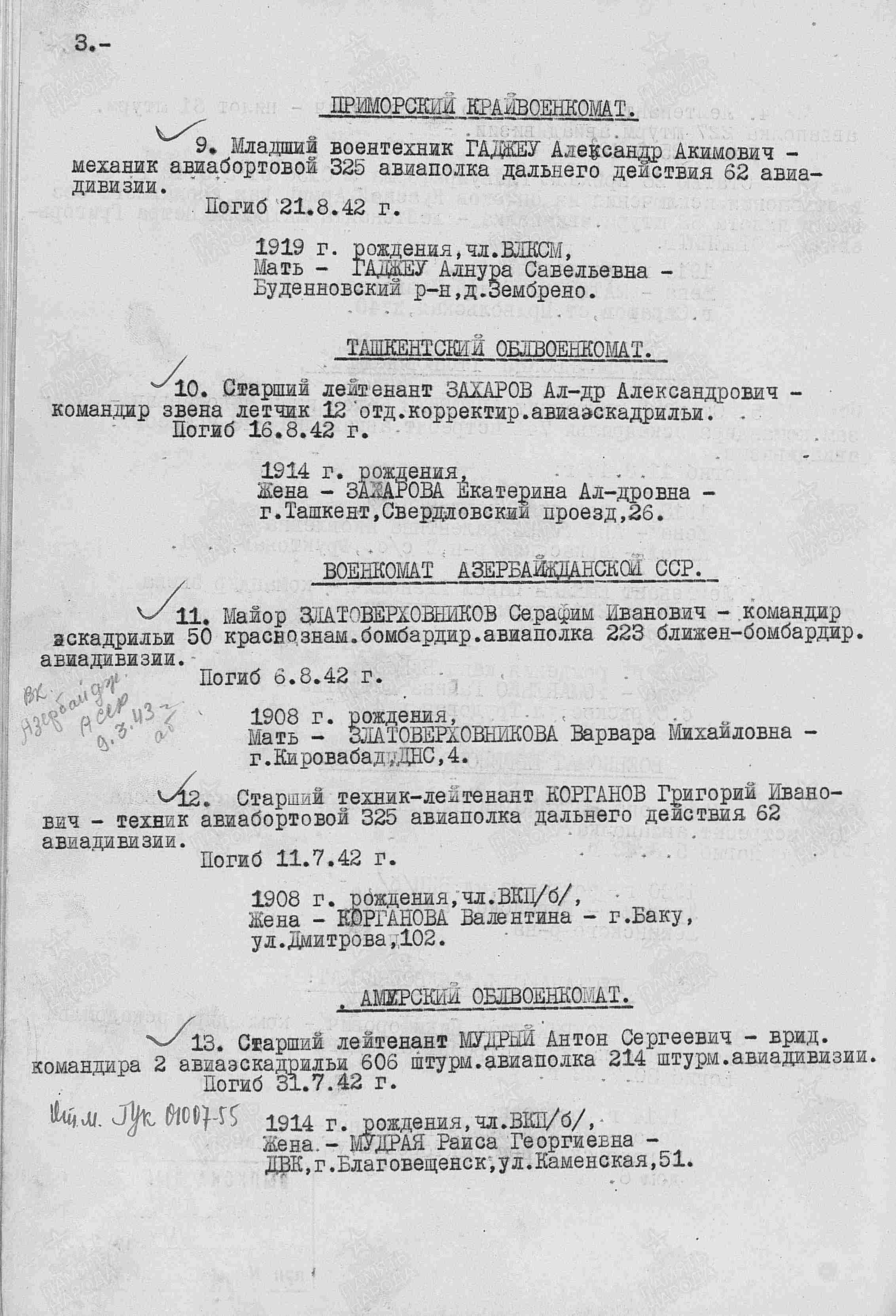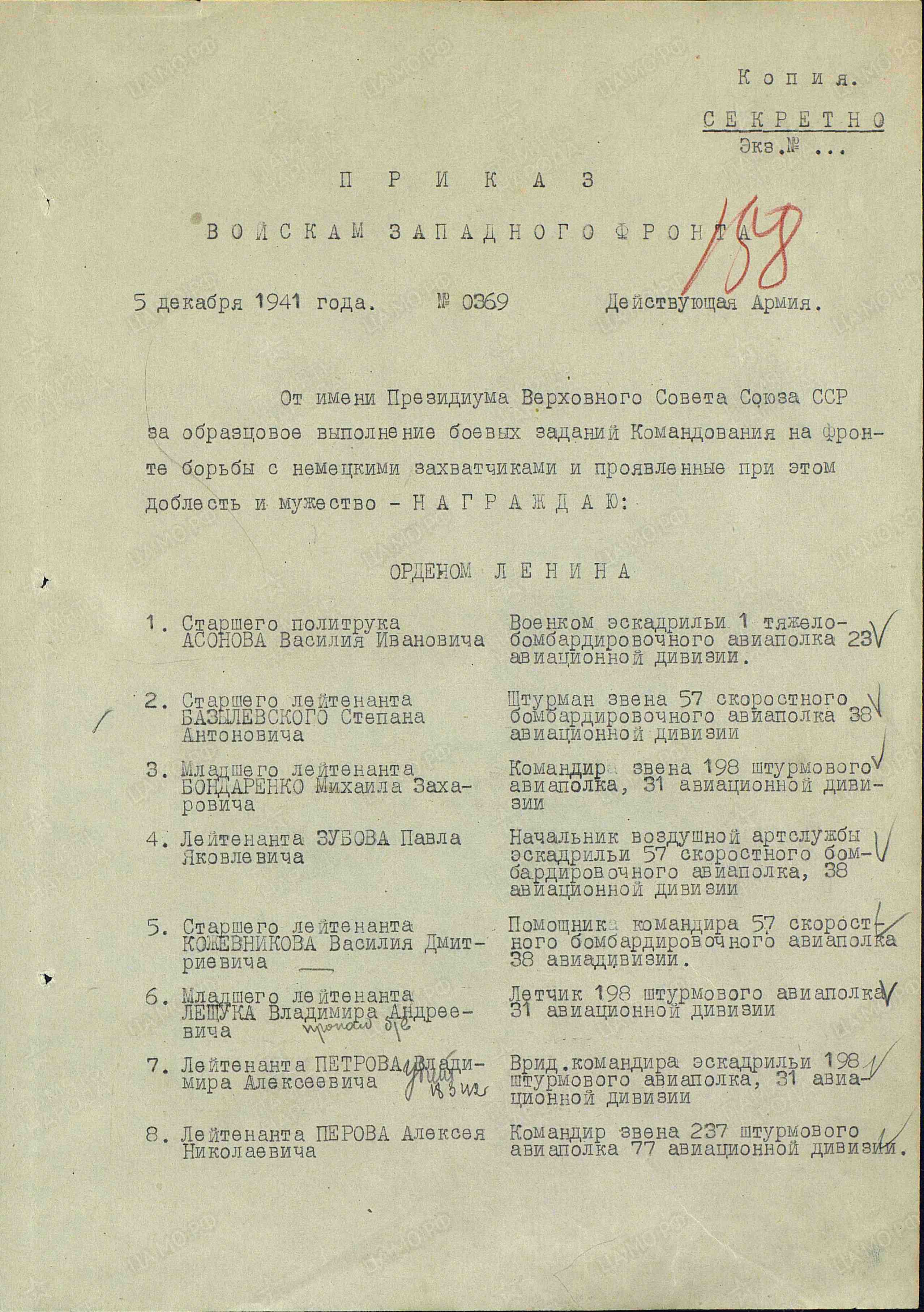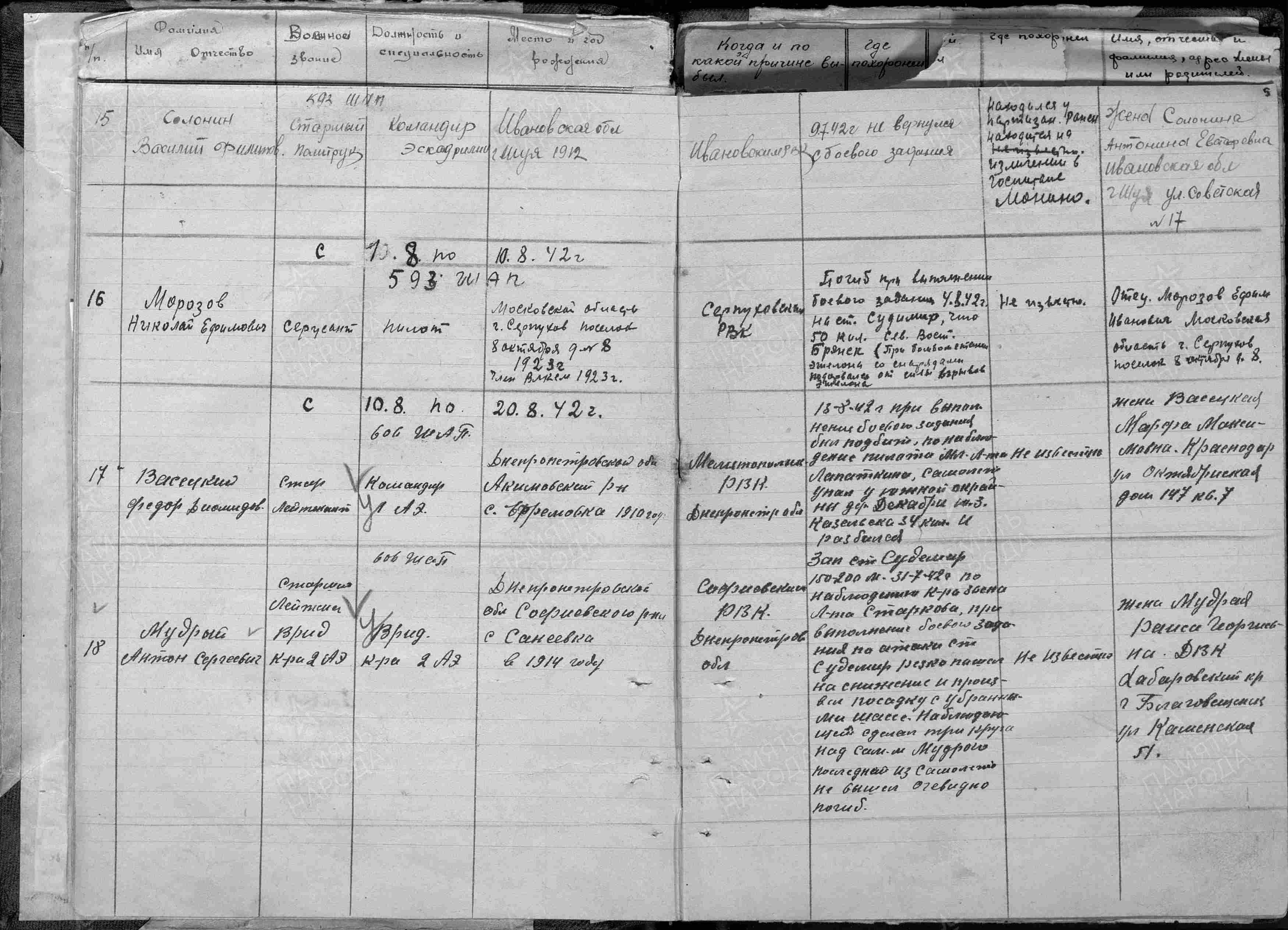 Опубликовано: 19 ноября, 2020 (изменено) Добрый вечер уважаемые коллеги. Еще года три-четыре назад,случайно в документах 214 ШАД 1 Воздушной Армии,мне попадалась эта редкая фамилия летчика- Мудрый Антон Сергеевич. Следующий раз мне попалась фамилия летчика Мудрого в прошлом году,в ходе изучения документов генерала Васильева,т.е.документов комиссий ,которую он возглавлял по якобы указанию Никиты Хрущева,и искали они в Жиздринском районе Калужской области место падения летчика-истребителя Л.Хрущева. Потом был рассказ случайных людей о якобы севшем на вынужденную в годы войны самолете рядом со ст.Судимир. Меня заинтересовала судьба этого боевого летчика,и в ходе изучения документов удалось установить следующее, буду описывать события в хронологическом порядке,подкрепляя рассказ сканами документов. Лейтенант Мудрый Антон Сергеевич 1914 года рождения,начал воевать в составе 606- го легкобомбардировочного полка с первого дня ,как его часть прибыла на фронт.Полк был сформирован осенью 1941 года, на базе Ярославской школы стрелков-радистов,так же в оперативное подчинение полка были переданы 64 Ораэ и 105 Ораэ. На вооружении полка состояли 27 самолётов Р-5 и эскадрилья Р-Z. С октября 1941 г. полк из-за прорыва противника по направлению Юхнов-Медынь-Малоярославец начал боевые действия в составе ВВС Московского военного округа, а затем Западного фронта и принимал участие в ходе освобождения городов Наро-Фоминск,Калуга,Малоярославец,Боровск и действовал в составе 77 САД,которой командовал Герой Советского Союза полковник Антошкин И.Д.(кстати мой земляк,так как часть своего детства и юношества я прожил в г.Вязники и районе,откуда был родом и ГСС Антошкин И.Д.) В декабре 1941 г. полк был переформирован в 606-й ШАП. За осенние бои 41 года Антон Сергеевич Мудрый был представлен командованием части к награждению орденом Красного Знамени,но как часто бывало на фронте,в последней инстанции,награду занизили на одну ступень и получил он орден Красной Звезды. (см.документы ниже) Кстати,его награждение прошло одним приказом № 0369 по Западному фронту ,где вместе с ним был награжден его однополчанин на то время- мл.лейтенант Русаков Иван Андреевич,стрелок-бомбардир 606-го ЛБП,в будущем который станет классным штурманом и погибнет в составе своего экипажа летом 1943 года,о нем тема Комбата - "ПЕ-2 Жиздринский район". (см.документы ниже) 31 июля 1942 года ст.лейтенант ,временно исполняющий должность командира 2 авиаэскадрилий Антон Мудрый в составе своей эскадрилий выполняет боевое задание по штурмовке станций Судимир,на тот момент Орловской обл.В ходе штурмовки его самолет поврежден и он сам получает ранение.Падает на вынужденную посадку недалеко от станции.Его боевой товарищ,командир звена ,л-т Старков делает несколько кругов над стоящей в поле машиной,и видя что летчик не подает признаков жизни,принимает его за погибшего и так сообщает в своем донесений после выполнения задания.Как и полагалось ,по всем положенным инстанциям ушло сообщение о гибели летчика А.Мудрого и выписке его из состава 214 ШАД. (см.документы ниже) Но ,как свидетельствуют документы,дело обстояло другим образом. В тот день Антон Мудрый не погиб.Он возможно получил ранение, и в течений месяца скрывался в местной деревне.Правда, там видно по прошествию времени,в рассказе селяне ошиблись именем и называют ле