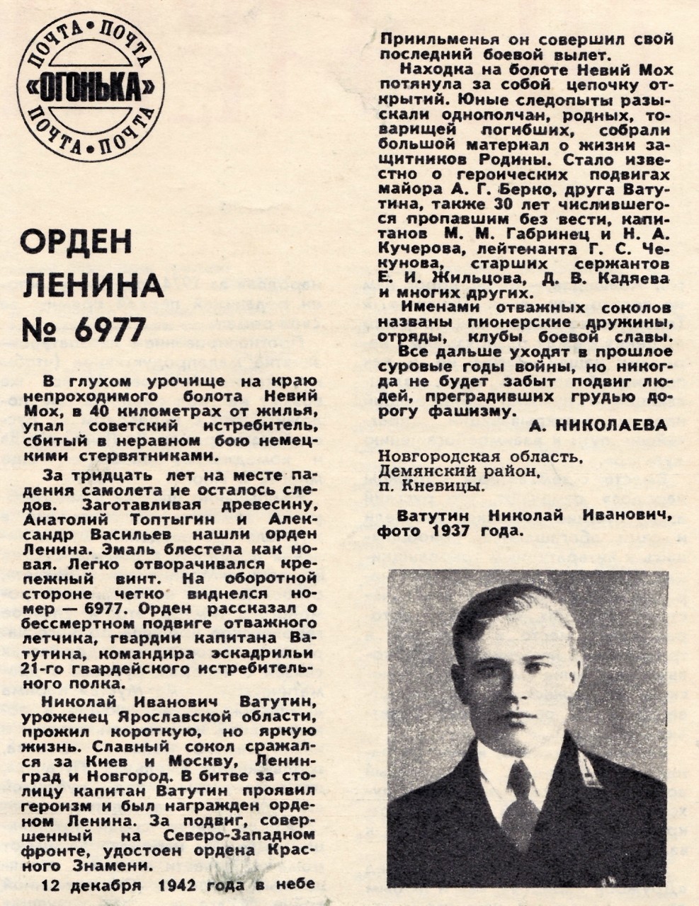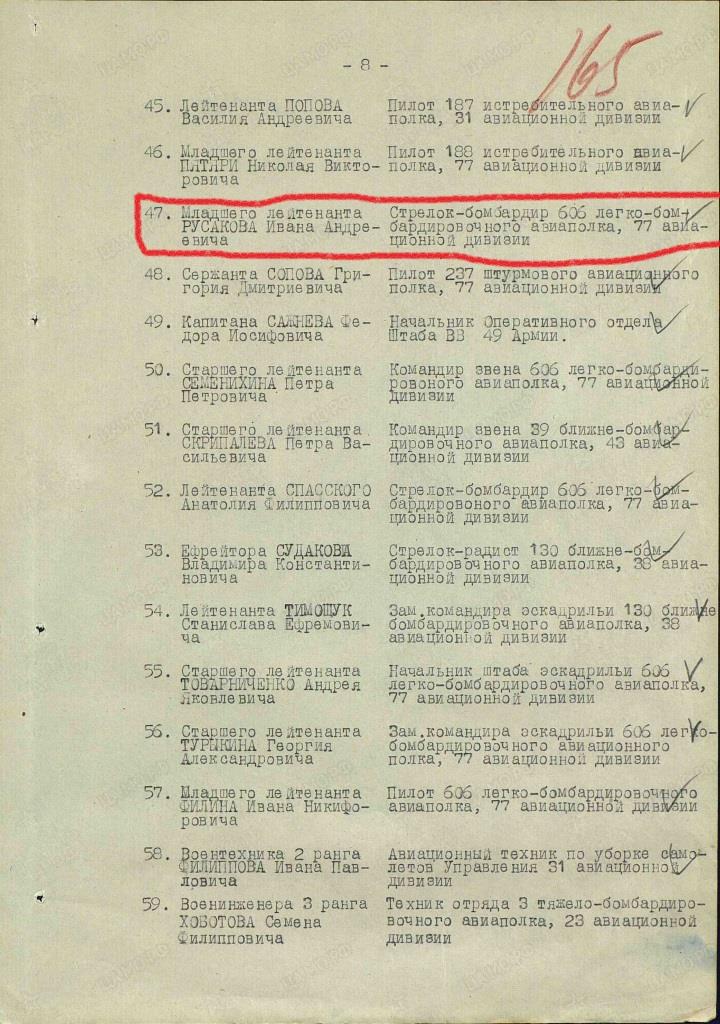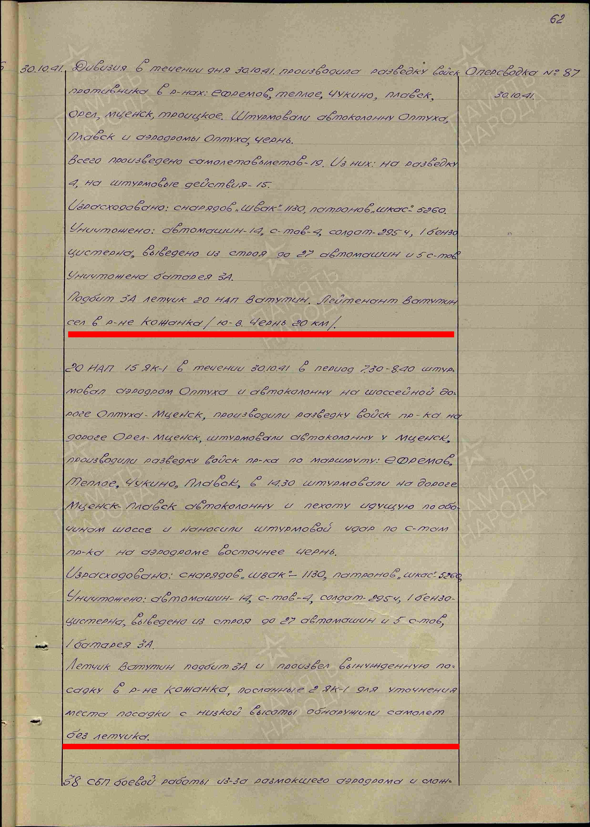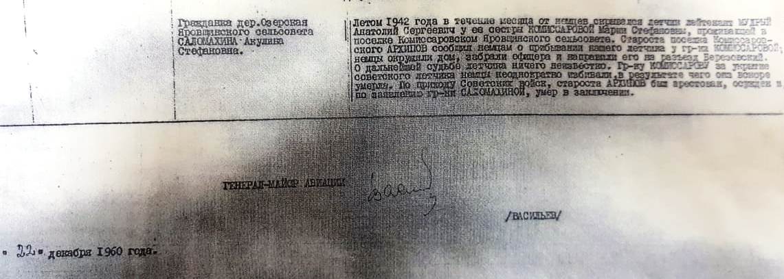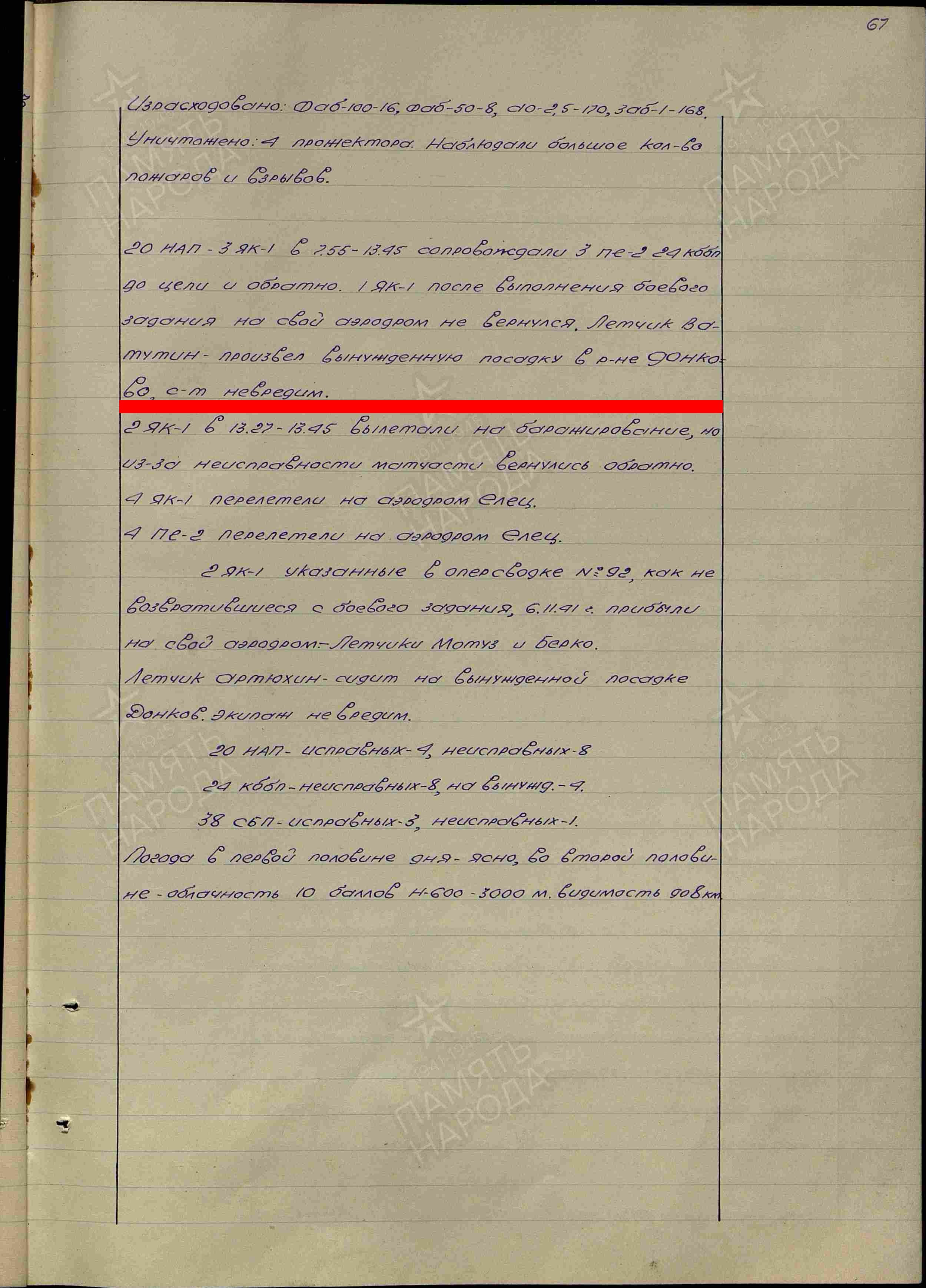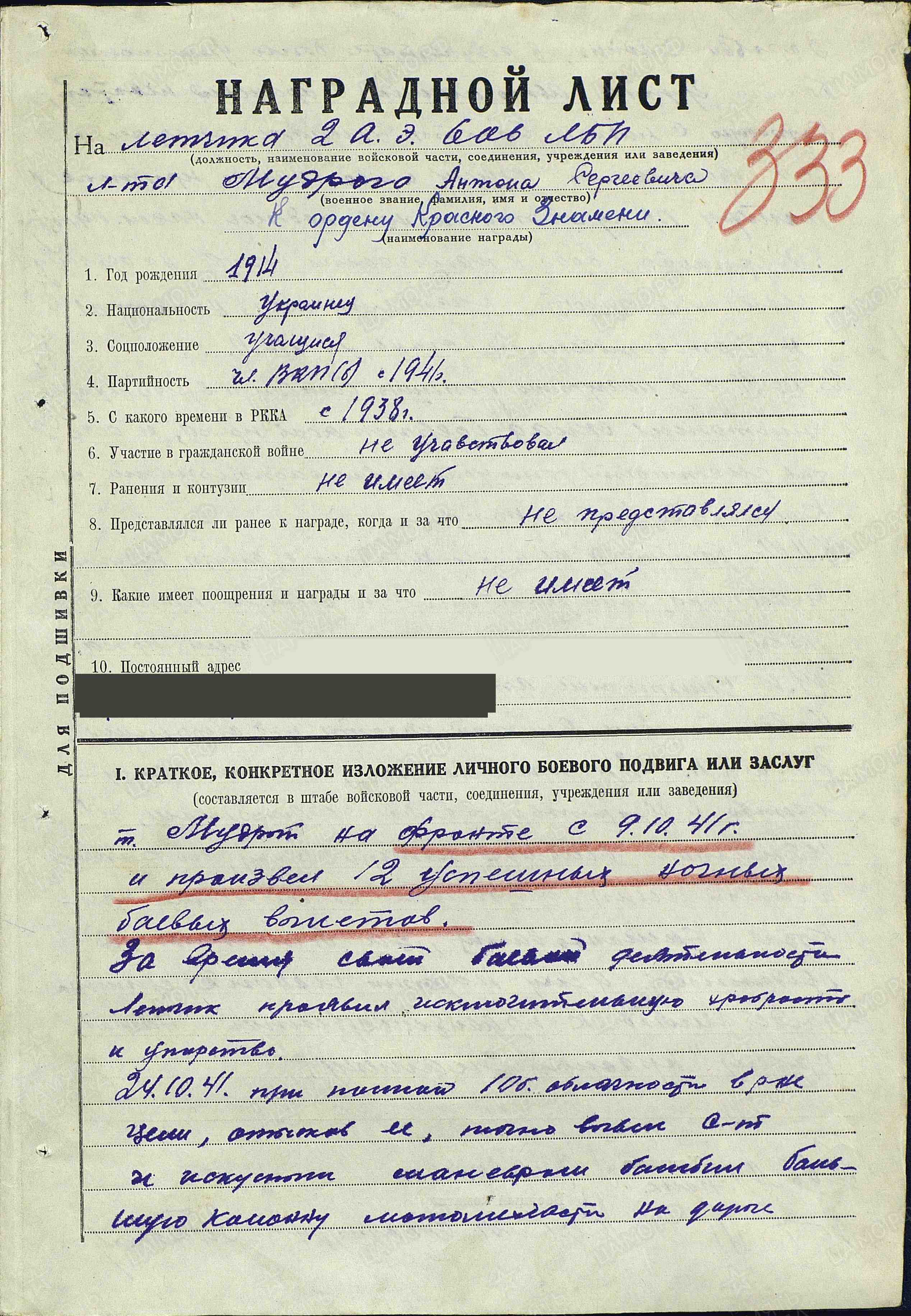 Опубликовано: 31 января, 2021 В 19.11.2020 в 18:28, Аirborn сказал: Добрый вечер уважаемые коллеги. Еще года три-четыре назад,случайно в документах 214 ШАД 1 Воздушной Армии,мне попадалась эта редкая фамилия летчика- Мудрый Антон Сергеевич. Следующий раз мне попалась фамилия летчика Мудрого в прошлом году,в ходе изучения документов генерала Васильева,т.е.документов комиссий ,которую он возглавлял по якобы указанию Никиты Хрущева,и искали они в Жиздринском районе Калужской области место падения летчика-истребителя Л.Хрущева. Потом был рассказ случайных людей о якобы севшем на вынужденную в годы войны самолете рядом со ст.Судимир. Меня заинтересовала судьба этого боевого летчика,и в ходе изучения документов удалось установить следующее, буду описывать события в хронологическом порядке,подкрепляя рассказ сканами документов. Лейтенант Мудрый Антон Сергеевич 1914 года рождения,начал воевать в составе 606- го легкобомбардировочного полка с первого дня ,как его часть прибыла на фронт.Полк был сформирован осенью 1941 года, на базе Ярославской школы стрелков-радистов,так же в оперативное подчинение полка были переданы 64 Ораэ и 105 Ораэ. На вооружении полка состояли 27 самолётов Р-5 и эскадрилья Р-Z. С октября 1941 г. полк из-за прорыва противника по направлению Юхнов-Медынь-Малоярославец начал боевые действия в составе ВВС Московского военного округа, а затем Западного фронта и принимал участие в ходе освобождения городов Наро-Фоминск,Калуга,Малоярославец,Боровск и действовал в составе 77 САД,которой командовал Герой Советского Союза полковник Антошкин И.Д.(кстати мой земляк,так как часть своего детства и юношества я прожил в г.Вязники и районе,откуда был родом и ГСС Антошкин И.Д.) В декабре 1941 г. полк был переформирован в 606-й ШАП. За осенние бои 41 года Антон Сергеевич Мудрый был представлен командованием части к награждению орденом Красного Знамени,но как часто бывало на фронте,в последней инстанции,награду занизили на одну ступень и получил он орден Красной Звезды. (см.документы ниже) Кстати,его награждение прошло одним приказом № 0369 по Западному фронту ,где вместе с ним был награжден его однополчанин на то время- мл.лейтенант Русаков Иван Андреевич,стрелок-бомбардир 606-го ЛБП,в будущем который станет классным штурманом и погибнет в составе своего экипажа летом 1943 года,о нем тема Комбата - "ПЕ-2 Жиздринский район". (см.документы ниже) 31 июля 1942 года ст.лейтенант ,временно исполняющий должность командира 2 авиаэскадрилий Антон Мудрый в составе своей эскадрилий выполняет боевое задание по штурмовке станций Судимир,на тот момент Орловской обл.В ходе штурмовки его самолет поврежден и он сам получает ранение.Падает на вынужденную посадку недалеко от станции.Его боевой товарищ,командир звена ,л-т Старков делает несколько кругов над стоящей в поле машиной,и видя что летчик не подает признаков жизни,принимает его за погибшего и так сообщает в своем донесений после выполнения задания.Как и полагалось ,по всем положенным инстанциям ушло сообщение о гибели летчика А.Мудрого и выписке его из состава 214 ШАД. (см.документы ниже) Но ,как свидетельствуют документы,дело обстояло другим образом. В тот день Антон Мудрый не погиб.Он возможно получил ранение, и в течений месяца скрывался в местной деревне.Правда, там видно по прошествию времени,в рассказе селяне ошиблись имене