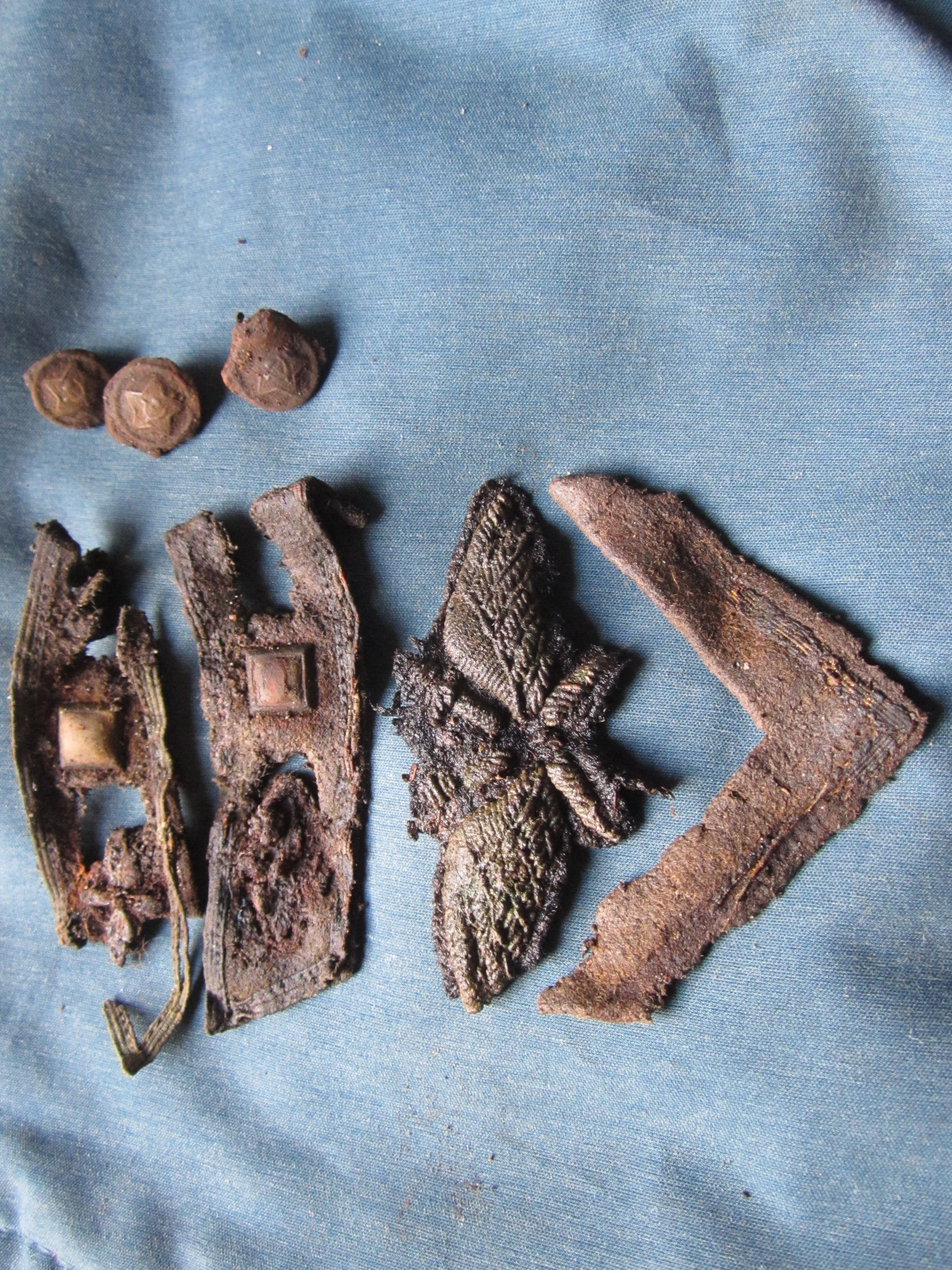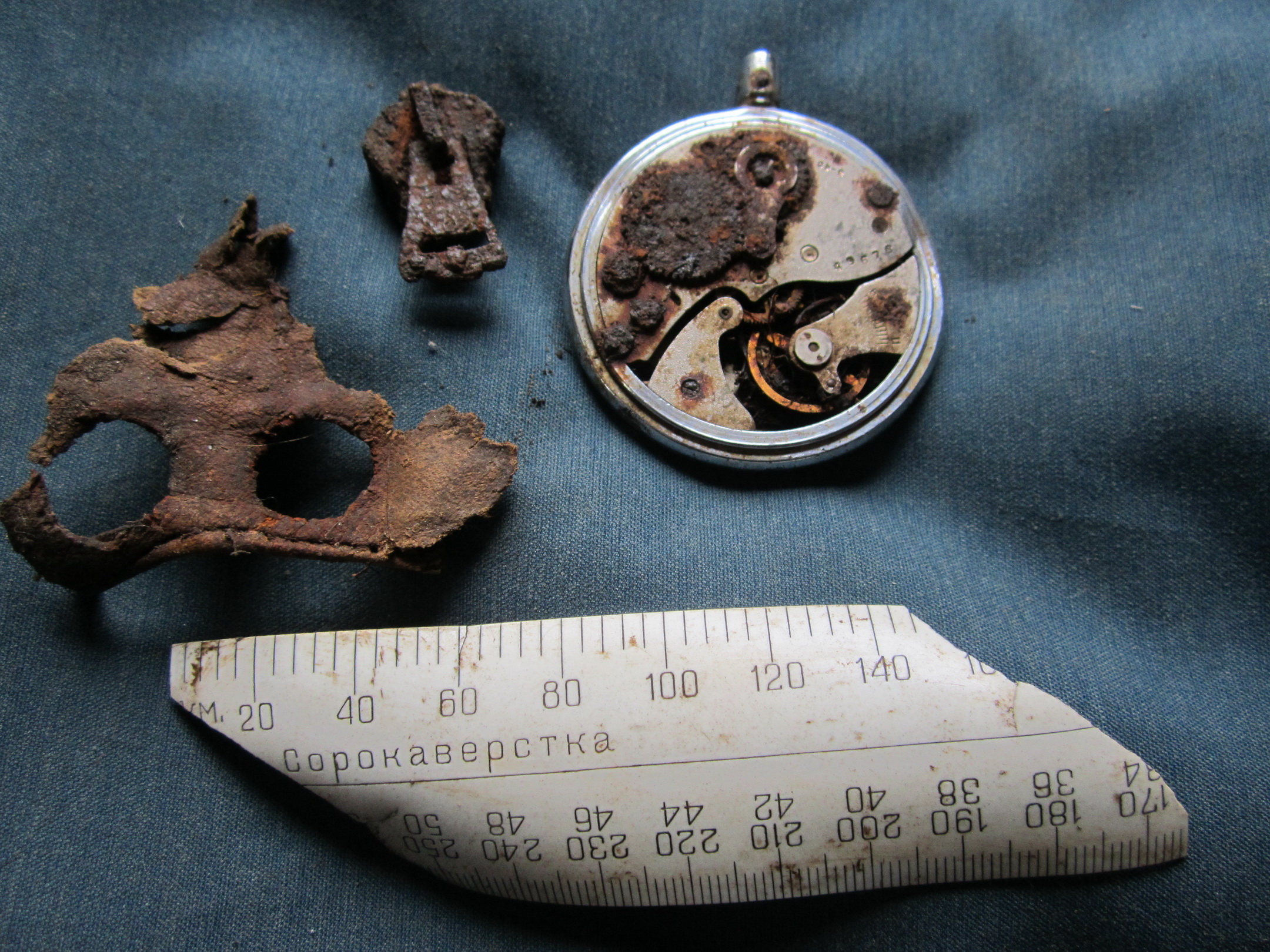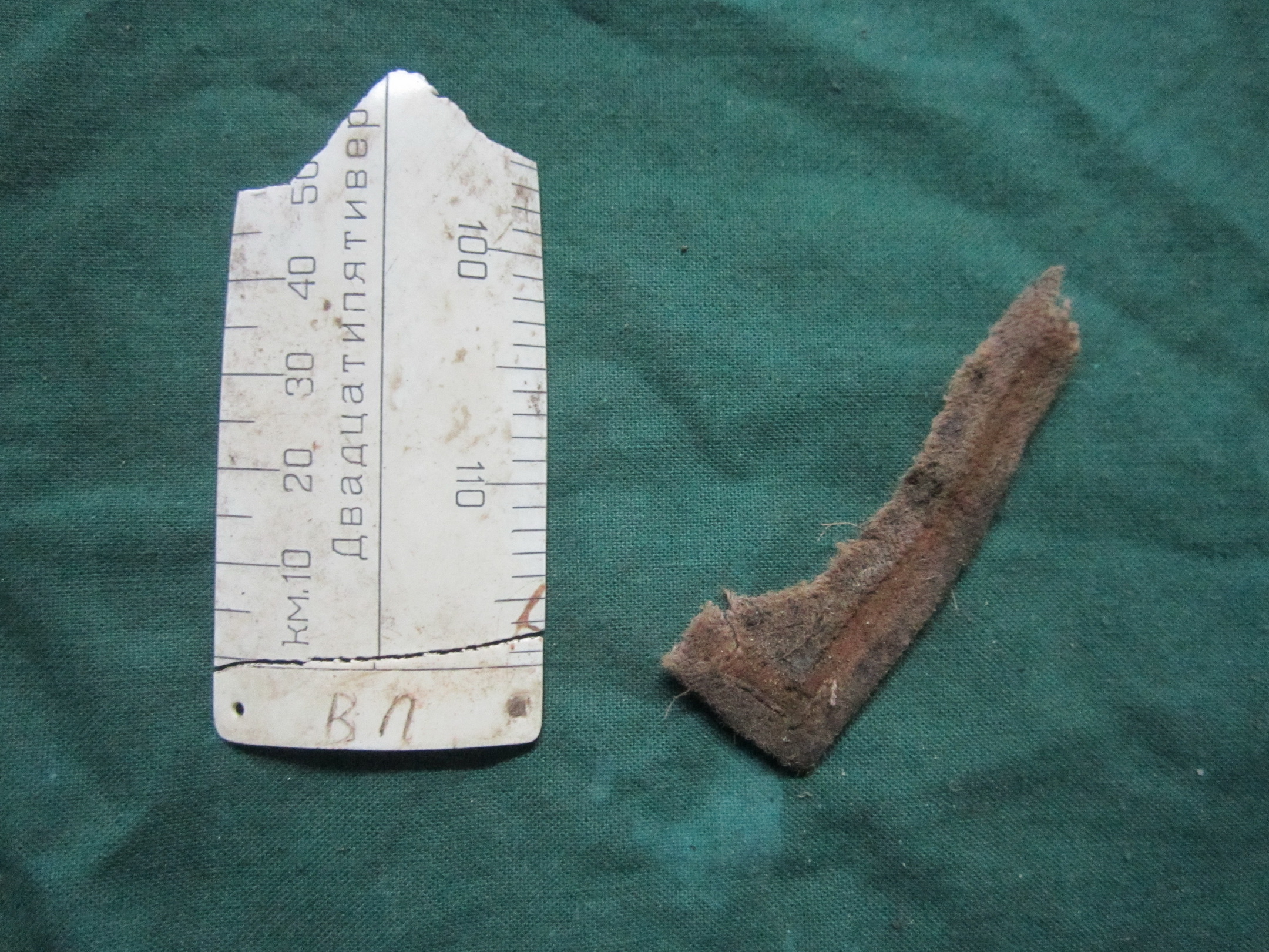 Опубликовано: 10 мая, 2021 Здравствуйте.Сегодня хорошая погода, подсохло.Решил отработать " под нож " отвал и края могилки стрелка -радиста на МП 2/26. Результат: часть штурманской линейки с инициалами-ВЛ, часть нарукавного шеврона,возможно мл. л-т и два ларингофона.По краю могилки и в метре от неё, под дерном, попадаются костные фрагменты. Пошел второй комплект парашютных пряжек. ВЛ - возможно Вадим Лумбовский. 4 Упомянуть пользователя Поделиться сообщением Ссылка на сообщение Поделиться на других сайтах
