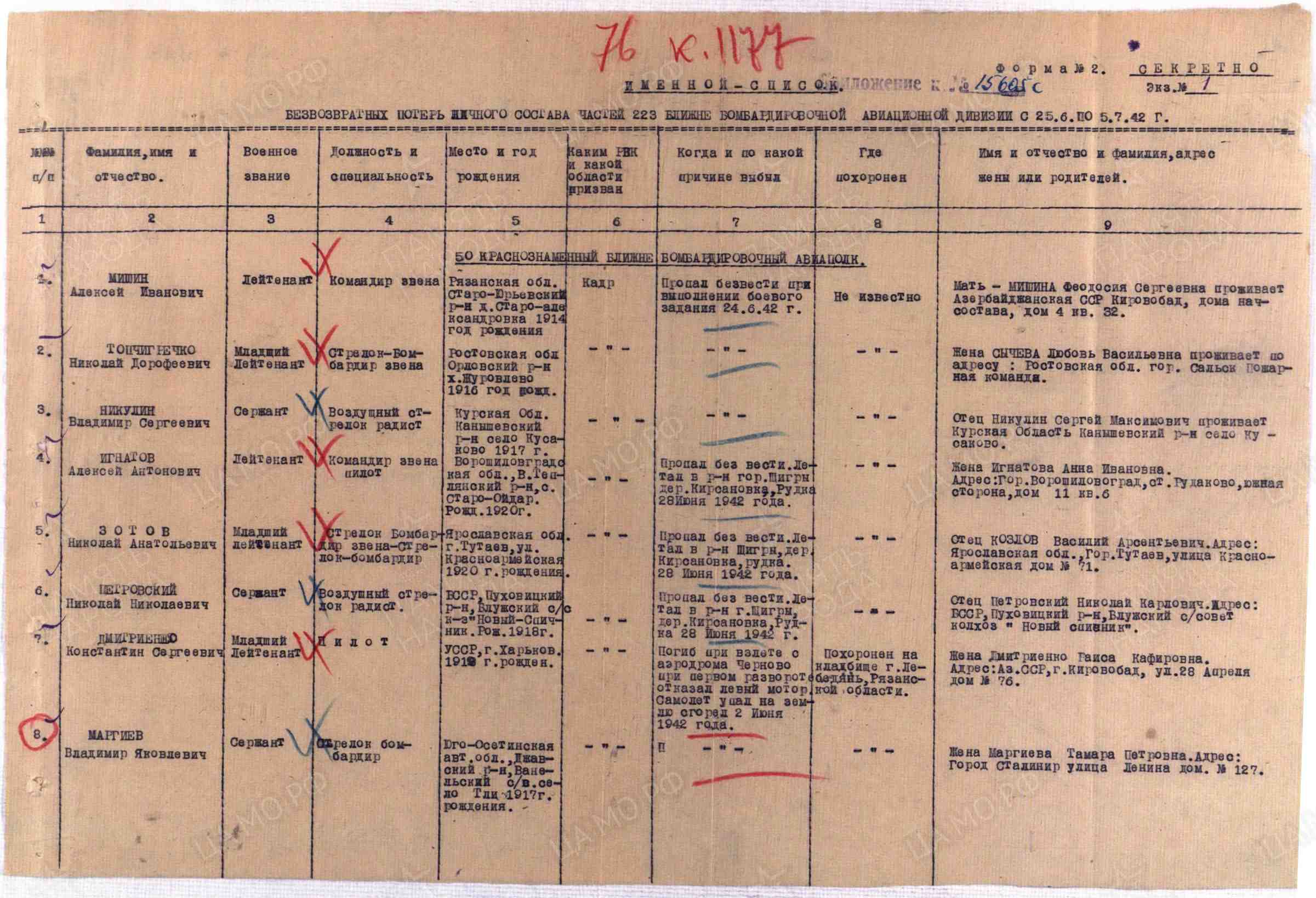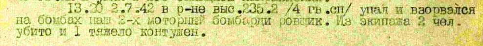 Опубликовано: 21 час назад Думаю, что опечатка в донесении, и правильно высота 225.2 В 03.11.2021 в 14:49, linnet сказал: Упомянутую высоту 235.2 не нашел. Там есть высота 225.2 Версия появилась интересная, но без жбд и оперсводок 50 бап или 223 бад не могу проверить.. Все укладывается кроме месяца. Двое погибших, отсутствует воздушный стрелок-радист. Цитата 50 бап. 02.06.42 г. при взлете с аэродрома Черново при первом развороте отказал левый мотор Пе-2. Самолет упал на землю и сгорел. Погибли летчик мл. лейтенант К.С.Дмитриенко и стрелок-бомбардир сержант В.Я.Маргиев. Похоронены на кладбище г. Лебедянь, Рязанской области. На форуме уже определяли, что Черново - это Чернава, а это 6 км южнее от места указанного в донесении МП В донесении да, дата июньская, но вот парадокс, выглядит как опечатка, именной список за период 25.06.-05.07.1942, и по порядку дат у этого экипажа должен быть июЛь, а не июНь. Единственное пока возможное верное подтверждение - извещение на Маргиева с датой 02.07.1942 Фантастически, но уж больно все складно... 1 Упомянуть пользователя Поделиться сообщением Ссылка на сообщение Поделиться на других сайтах