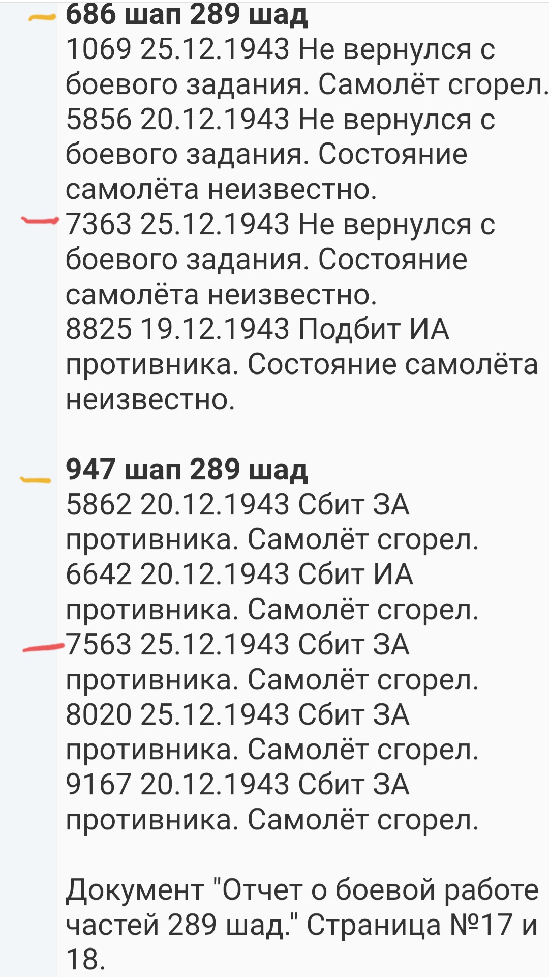 Опубликовано: 12 февраля, 2023 (изменено) Уважаемая Дочь ветерана ВОВ 863 иап!Благодарим Вас за подробную информацию по 206 окрап! Нам тоже кое что удалось найти по потерям этого полка за интересующий период: - младший лейтенант Котельников Алексей Иванович (03.1923-20.02.1945) летчик-истребитель 206 окрап пропал без вести на ЯК-9М в районе Фишхаузен - станция Медники. экипаж ИЛ-2: - 1. младший лейтенант Апальков Юрий Петрович (1922-24.02.1945) летчик-корректировщик 206 окрап на ИЛ-2 №33 подбит огнем ЗА в районе Зеераппен. - 2. младший лейтенант Хахалин Алексей Петрович (1923-24.02.1945) летчик-наблюдатель 206 окрап на ИЛ-2 №33 подбит огнем ЗА в районе Зеераппен. - младший лейтенант Носарев Александр Петрович (1919-25.02.1945) летчик-истребитель 206 окрап на ЯК-9М пропал без вести (р-н Коттен). - майор Львов Даниил (Данил) Иосифович (1908-19.03.1945) командир истребительной эскадрильи 206 окрап, на ЯК-9М сбит истребителями противника ФВ-190 . выпрыгнул с парашютом над территорией противника в районе севернее 4-5 км Фишхайзена, пропал без вести. - старший лейтенант Новиков Владимир Семенович (1922-19.03.1945) командир звена истребителей 206 окрап пропал без вести на ЯК-9М сбит истребителями противника ФВ-190, самолет вошел в штопор и пошел к земле, предположительно в районе Гермау. Столкнулись в воздухе: - 1. старший лейтенант Коваленко Василий Федорович (15.07.1919-14.04.1945) командир звена 206 окрап на ЯК-9М №33 столкнулся с самолетом Селезень, пропал без вести предположительно р-н Шудиттен. - 2. капитан Селезень Федор Никитович (1912-14.04.1945) заместитель командира авиационной экадрильи 206 окрап на ЯК-9М №32 столкнулся с самолётом Коваленко пропал без вести предположительно р-н Шудиттен. Так же известы составы экипажей ИЛ-2 этого полка вылетавших на боевые задания в интересующий период: лётчик - летнаб Шиханов - Борисов Васильев - Ябров Яркин - Клементьев Федоров - Яркин Апальков - Малиновский Доронин - Маслоцов Гусев - Хахалин Васильев - Пономарёв Яркин - Сахновский Девидзе - Гофман Шепелин - Туркевич Лешков - Пименов Негодяев - Александров Федотов - Гопашин Гришаев - Неверов Голубович - Кириченко Кульпов - Васильев Феоктистов - Купчеков Лаврентьев - Сахновский Яркин - Горбунов Беренсков - Купчиков Лешков - Перевертун Беренсков - Ябров Апальков - Хахалин - нбз, погибли Изменено 12 февраля, 2023 пользователем РУС 0 Упомянуть пользователя Поделиться сообщением Ссылка на сообщение Поделиться на других сайтах