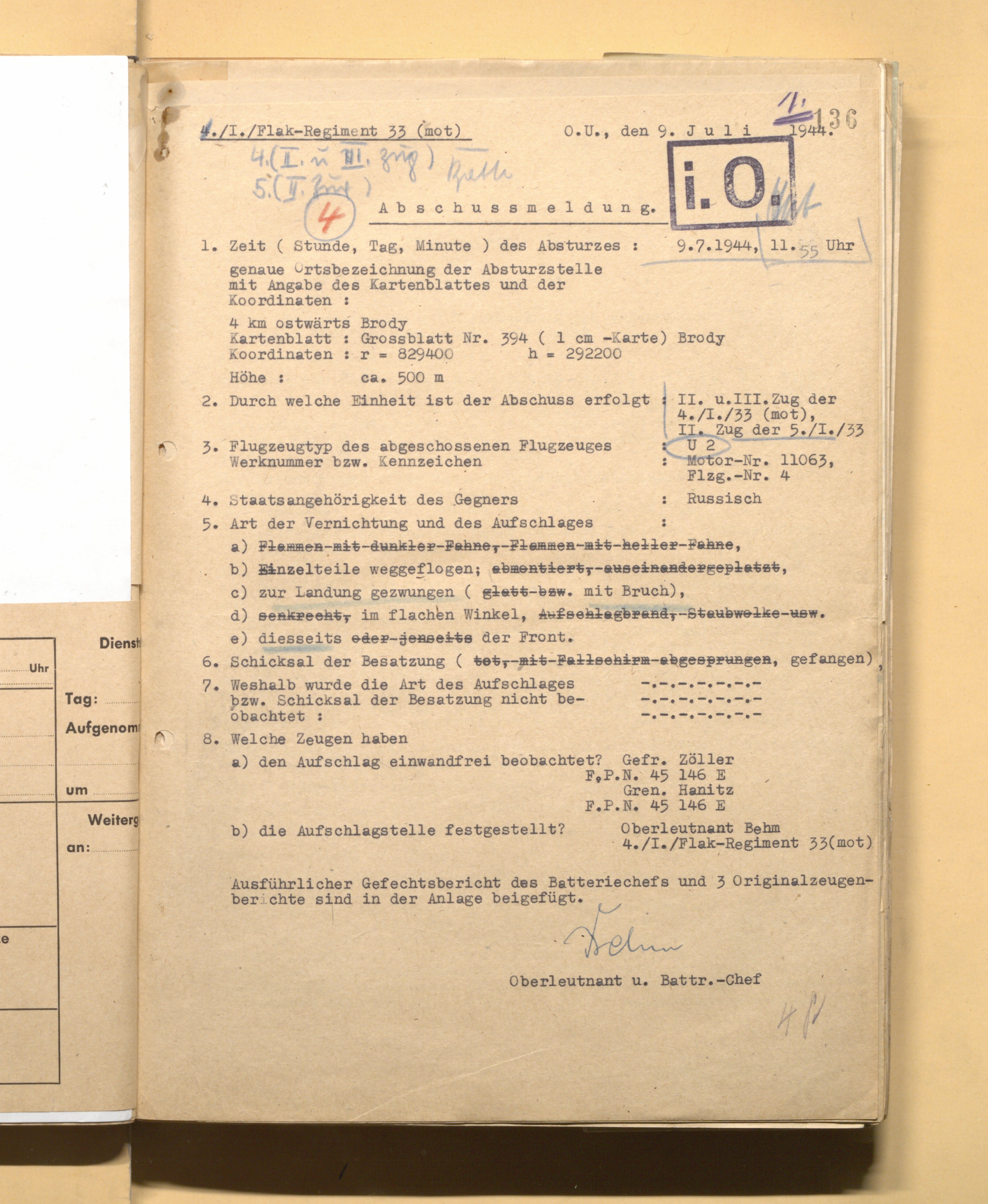 Как вариант – потеря 208 нбад 2 ВА: пропали без вести зам. к-ра дивизии подполковник Петрухин Иван Алексеевич, штурман дивизии майор Молоштан Николай Павлович. В донесении о БП сказано, что «9.7.44 г. при выполнении служебных заданий на своей территории в дневных условиях в свою часть не возвратился». Однако по другим документам Петрухин в тот день попал в плен в районе г. Броды, освобожден в 1945 г.