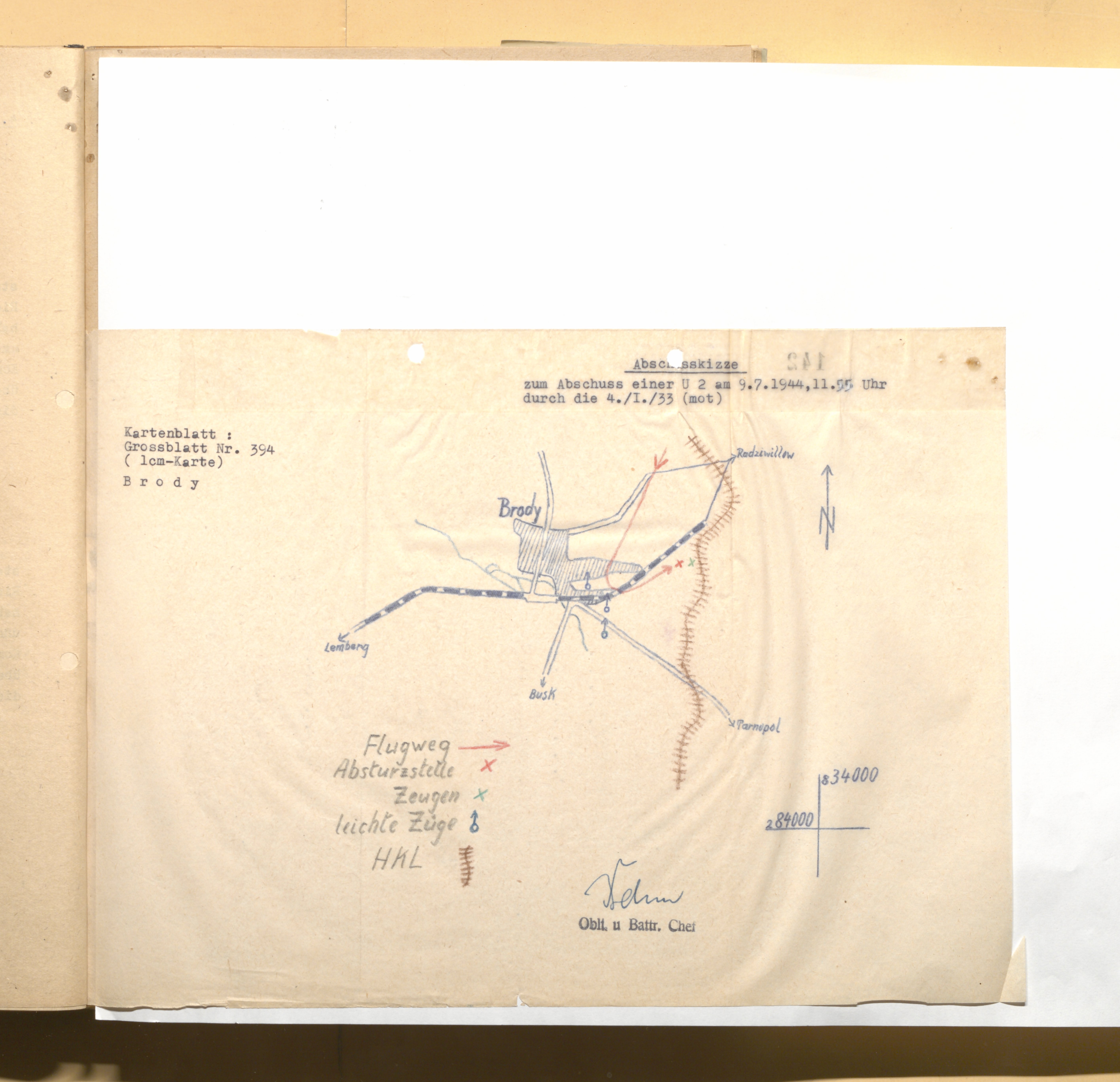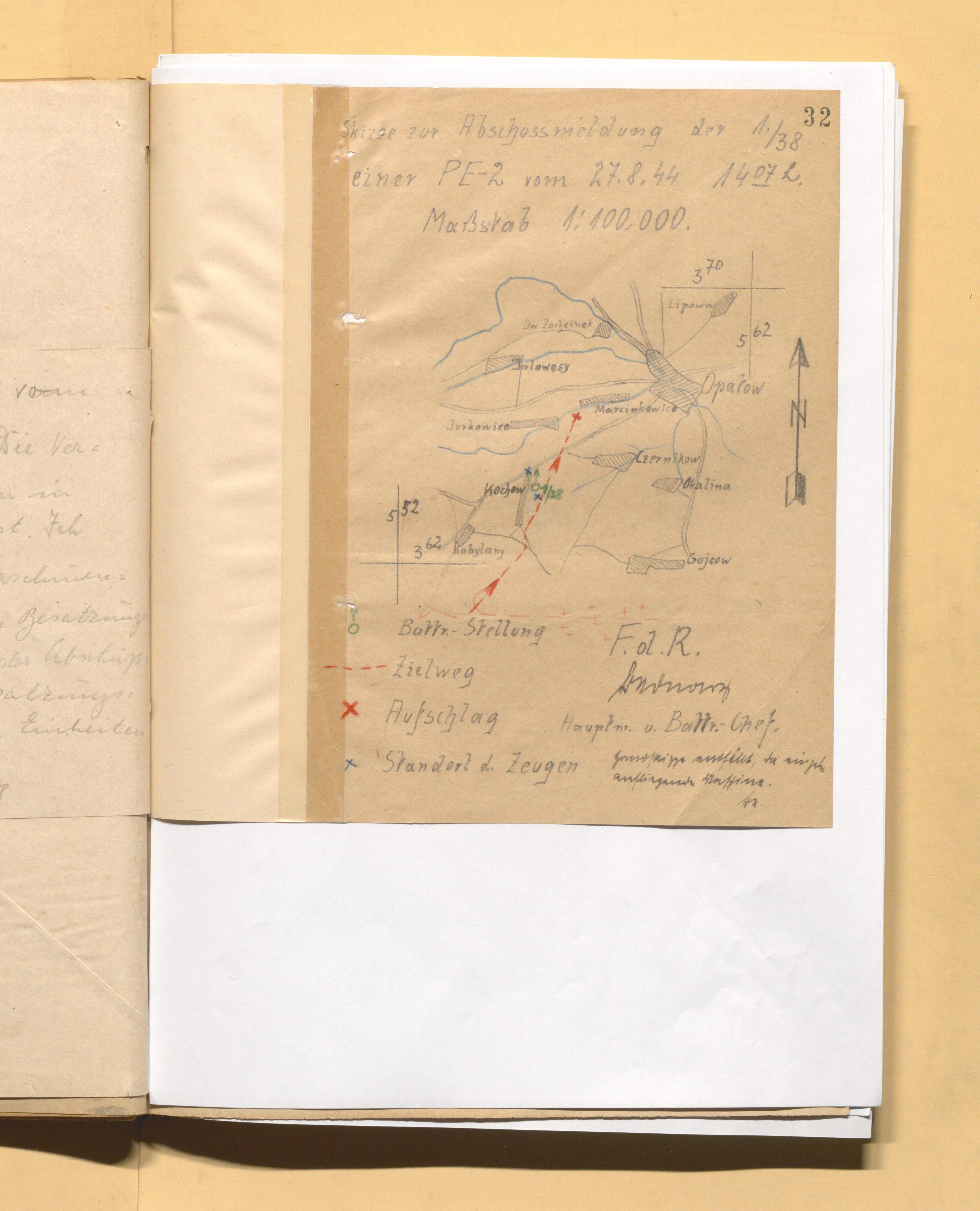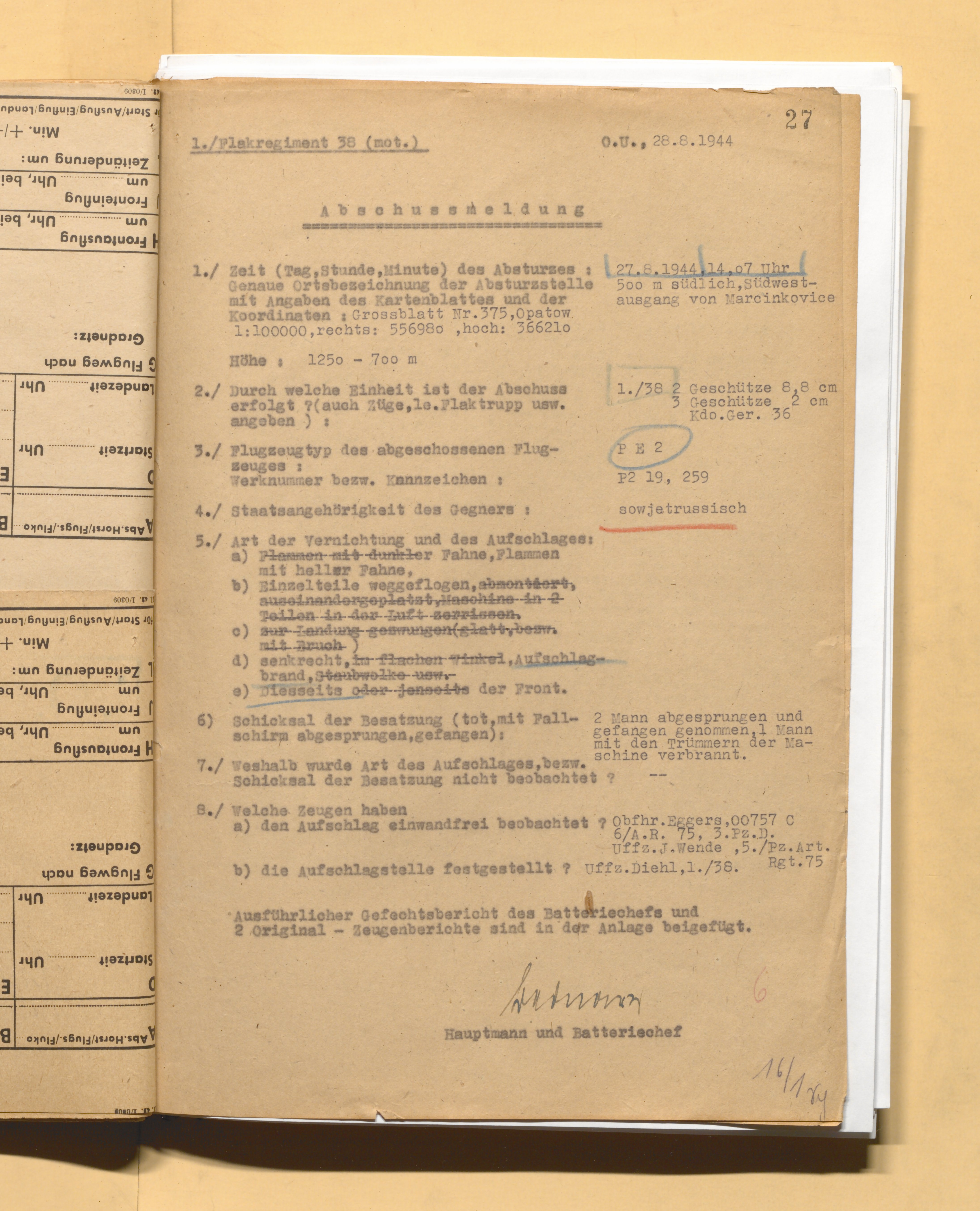 27.08.44 г. в 15.04-15.16 в том районе (в 3-х км от указанного в заявке МП) работал 2 гв. бак. На 2-м заходе прямым попаданием снаряда ЗА подожжен и упал экипаж 162 гв. бап 8 гв. бад: гв. мл. л-т Никитин Юрий Валентинович, штурман гв. мл. л-т Лебедев Александр Алексеевич (был в плену 8 мес., вернулся в полк, выжил), стрелок-радист гв. мл. с-т Обломкин Илья Трофимович (выжил, награжден в 1985 г.). В донесении о БП у Лебедева и Обломкина почему-то местом выбытия указано г. Сандомир, юго-западнее, 30 км., в другом донесении - Обломкин похоронен в 8 км юго-западнее Опатув.