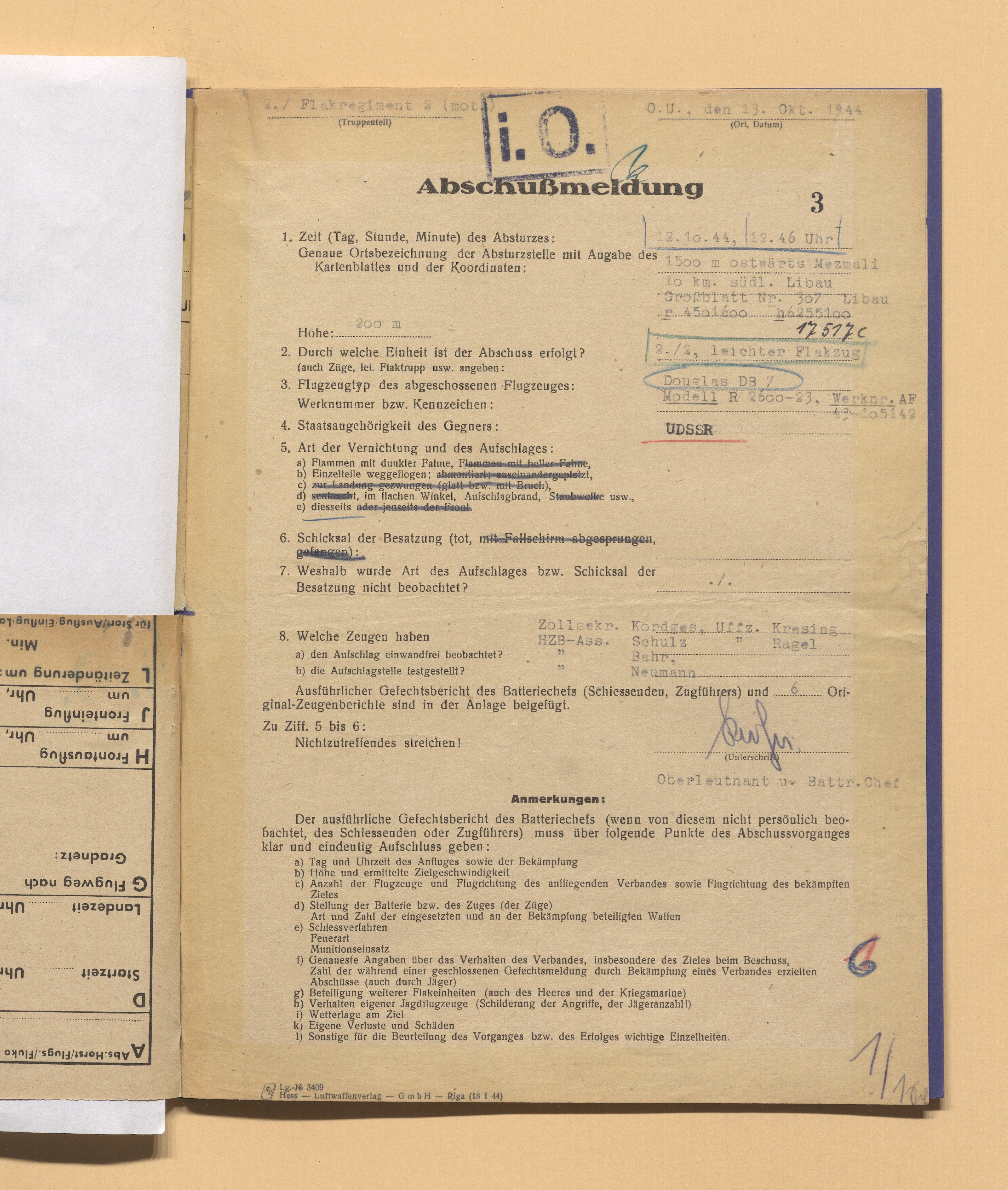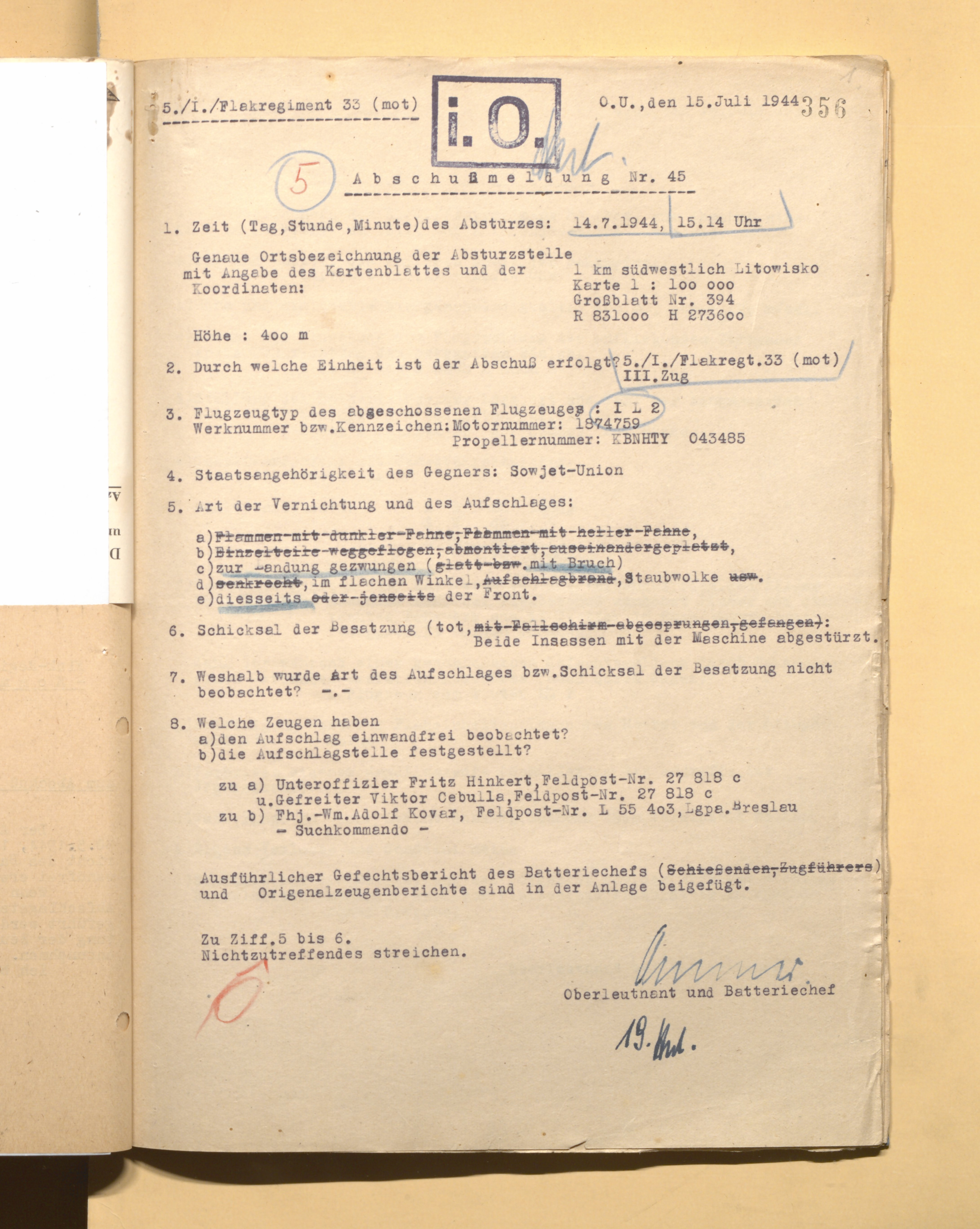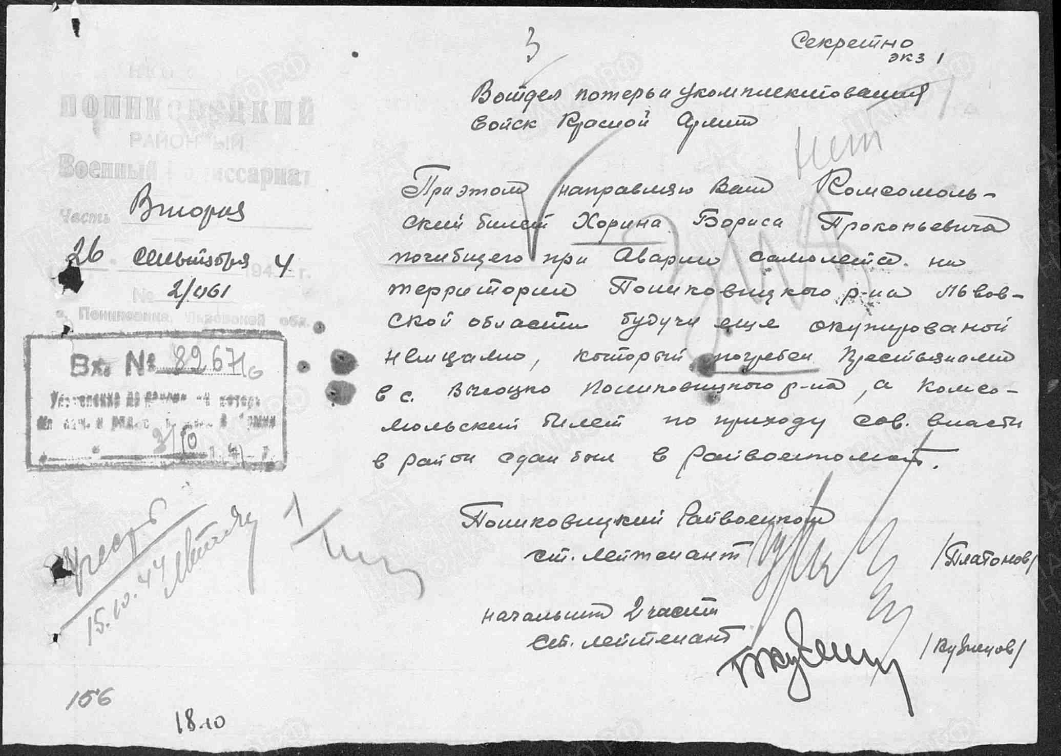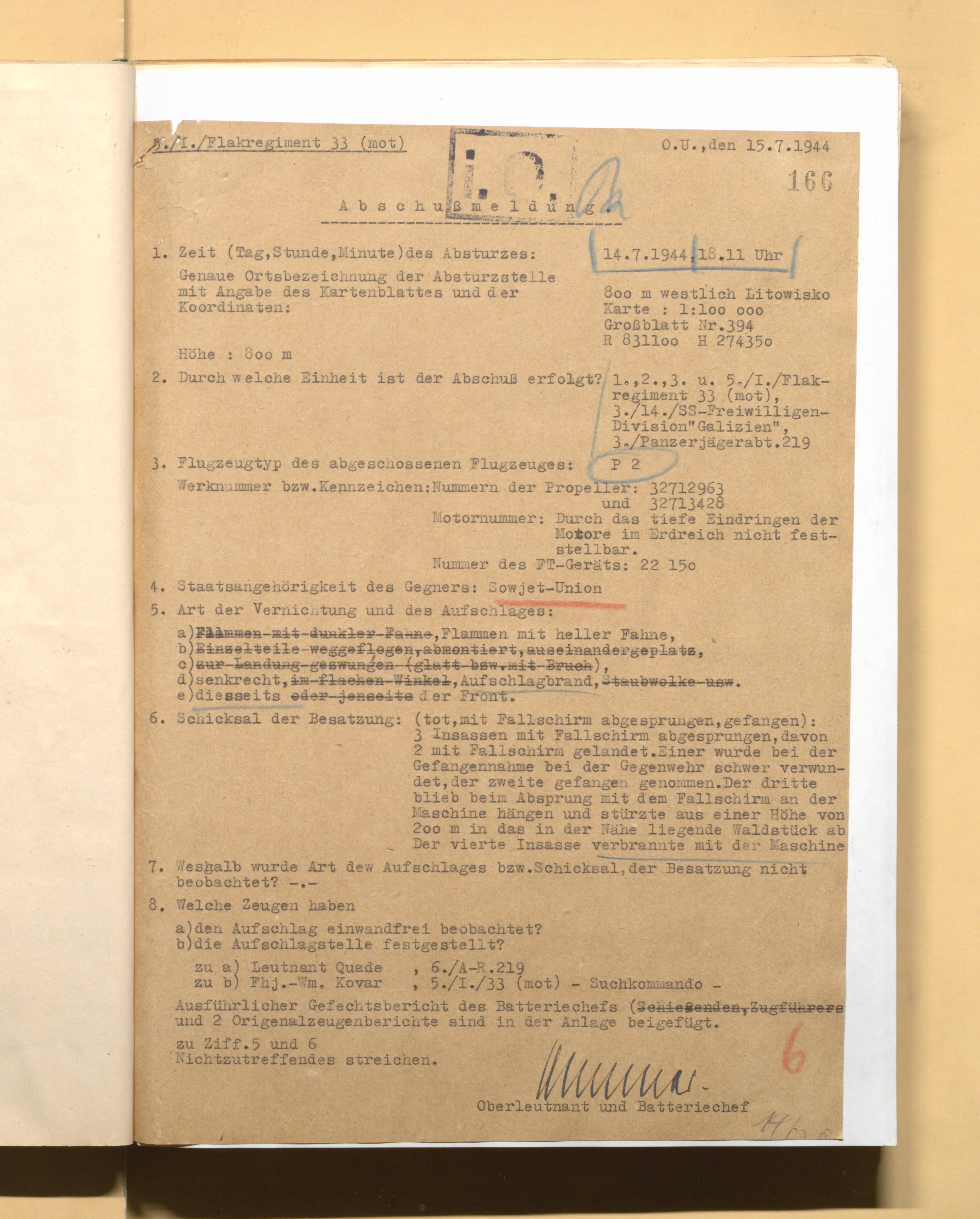 Во втором и пятом документах (они одинаковы по содержанию) о лётчиках говорится в 3-м абзаце следующее: "Члены экипажа самолёта, кажется, скрылись живыми, потому что на месте его падения были обнаружены многочисленные куски льняной материи с пятнами крови и отпечатками пальцев".