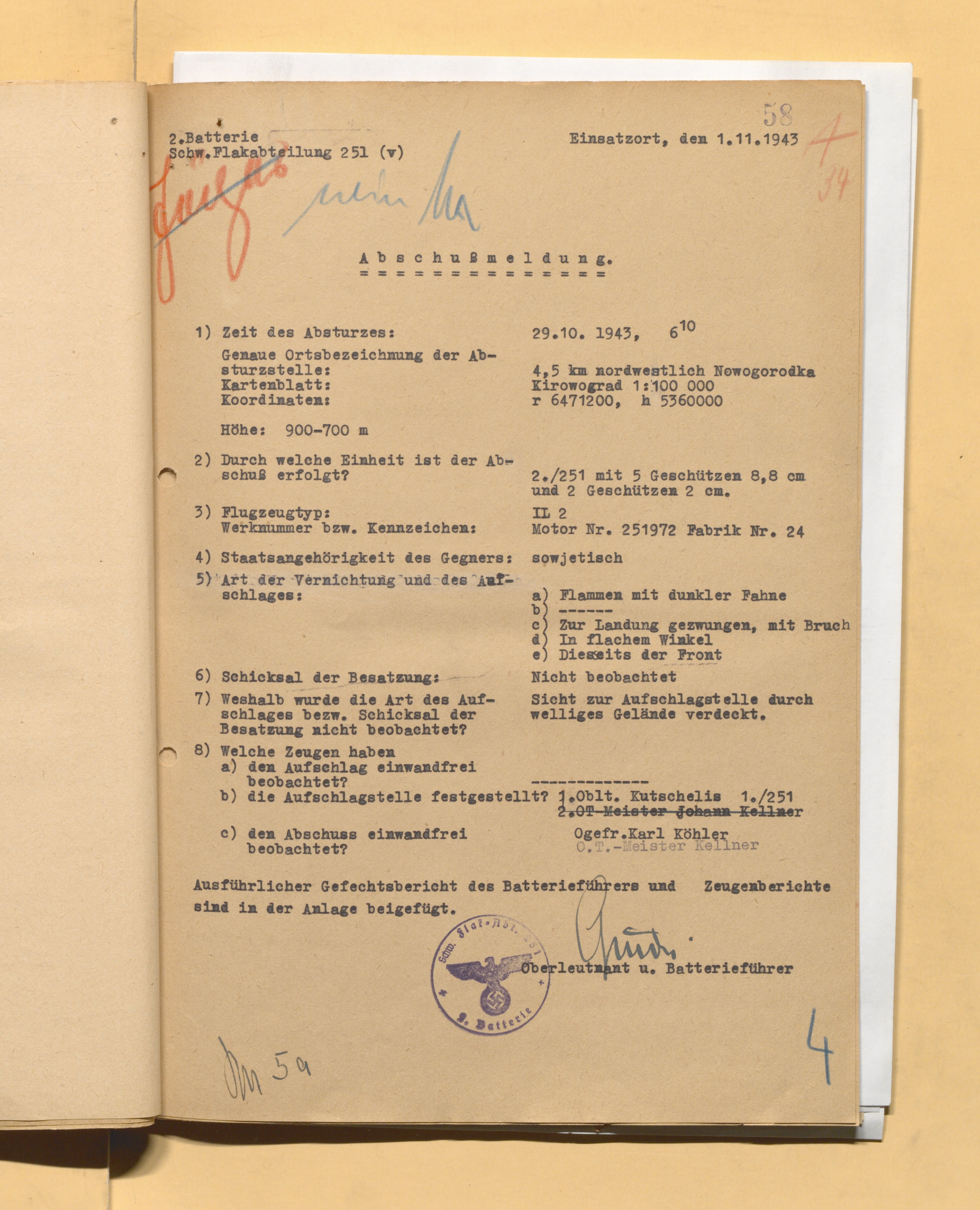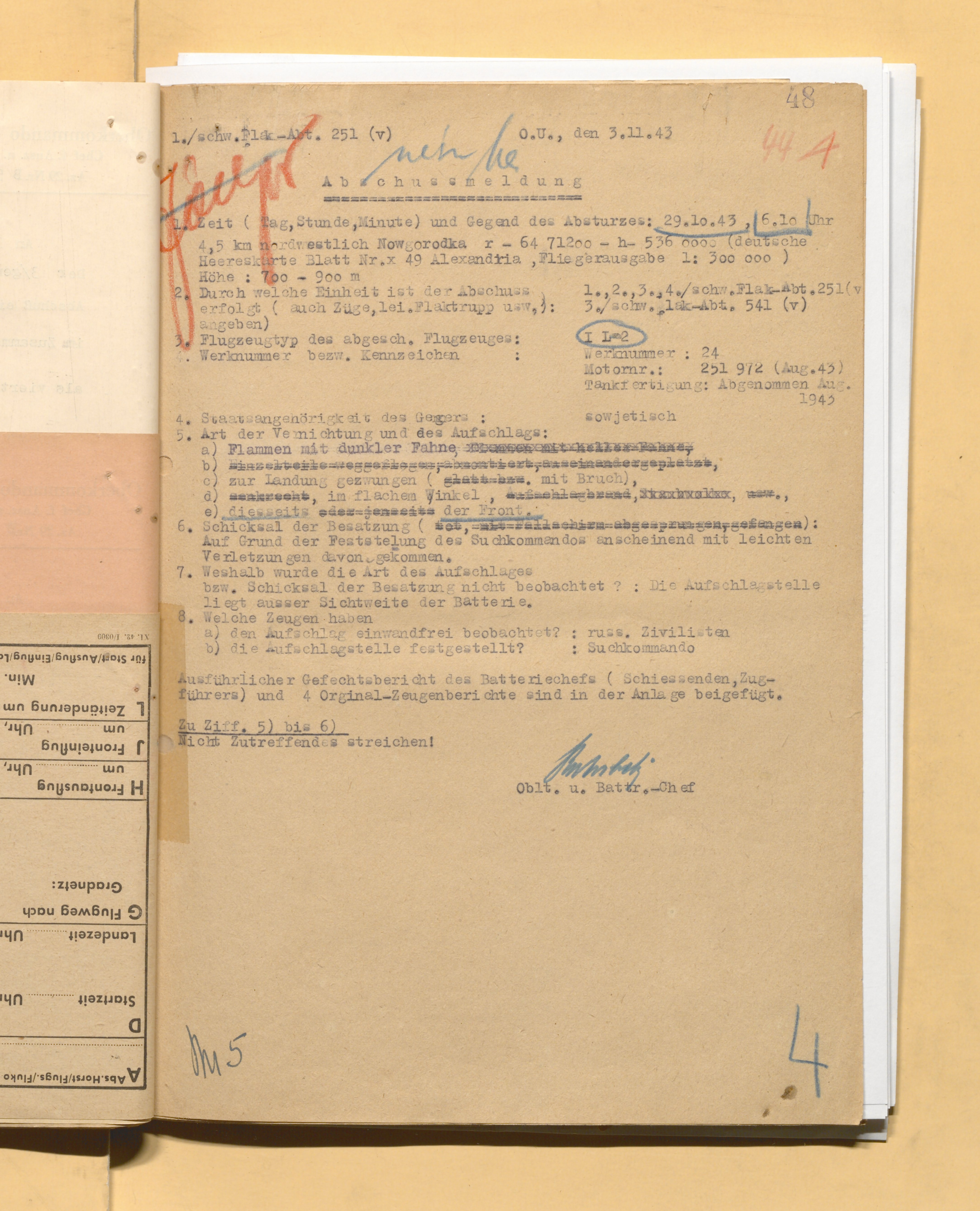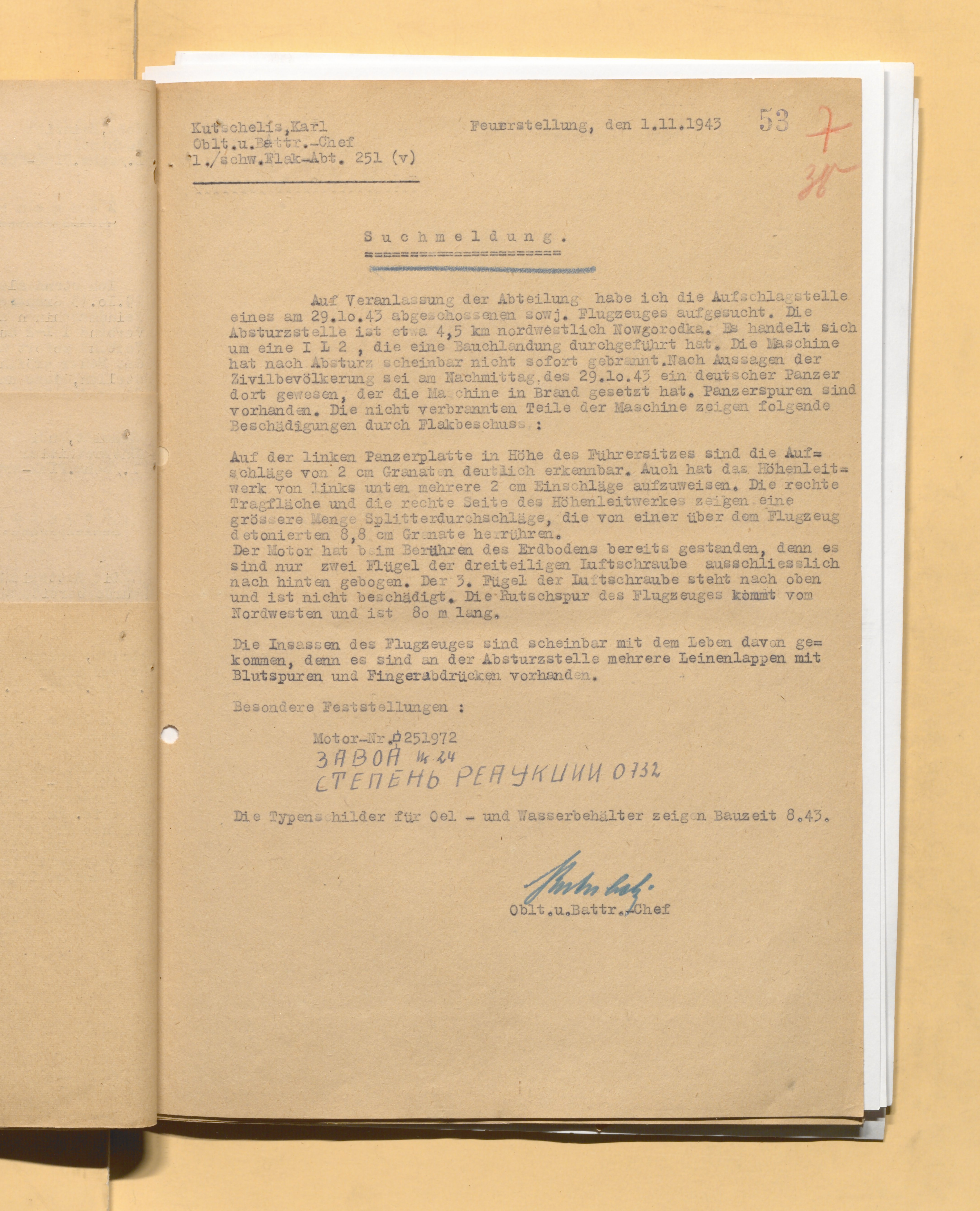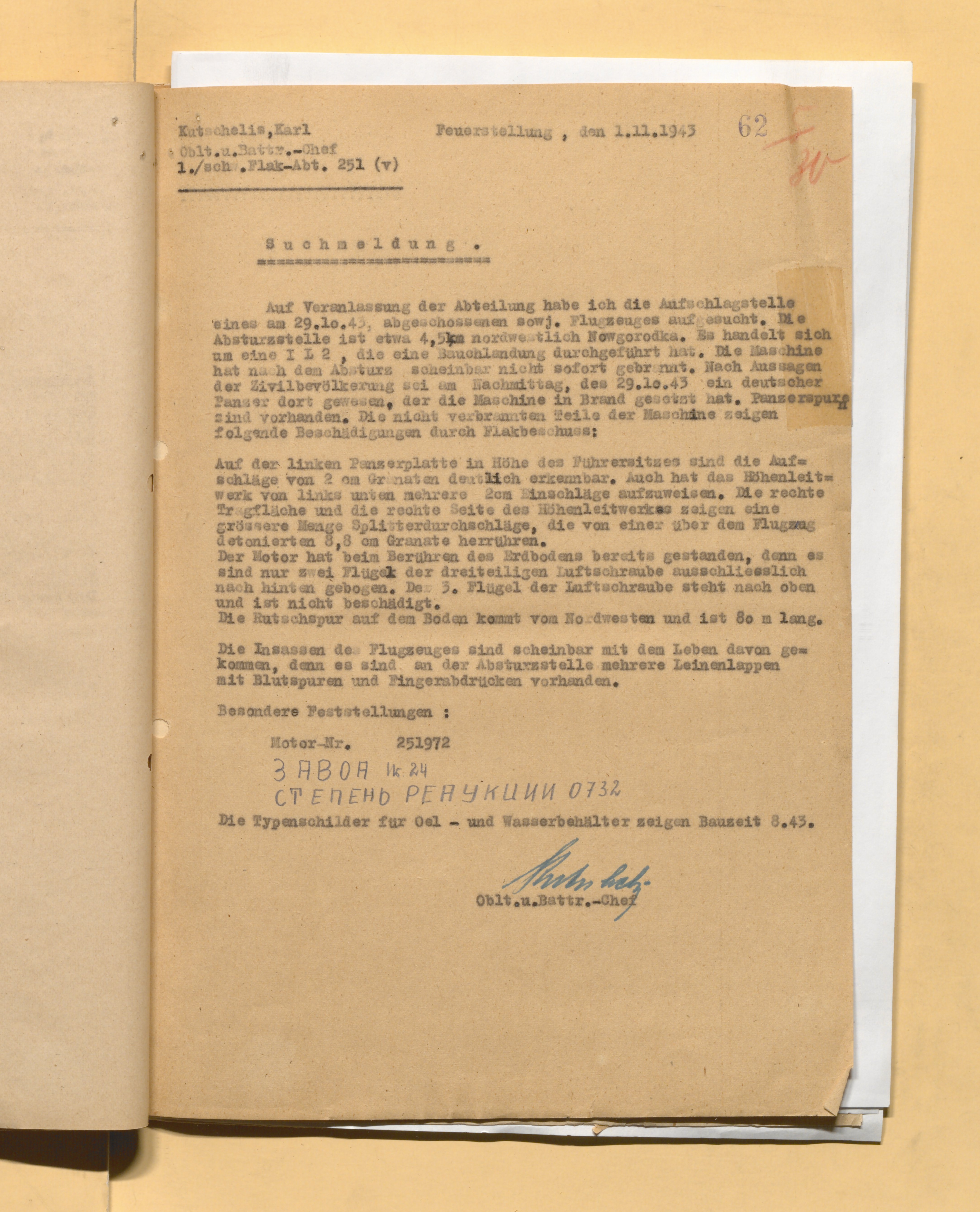 У немцев: Ил-2 с мотором №251972 сбит ЗА 29.10.1943 в 8.10 мск. Судьба экипажа надо переводить подробно. Грубо получается, что поисковая команда опоздала и (экипаж скрылся) с легкими травмами. Судьба экипажа неизвестна. / Еще запась: пассажиры самолета, по-видимому, остались живы, на месте крушения висят несколько полотняных тряпок со следами крови и отпечатками пальцев