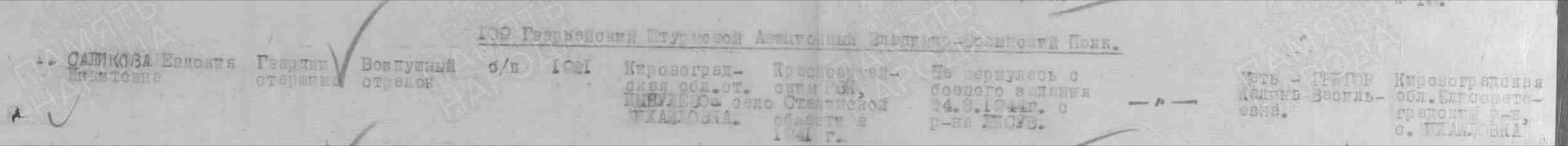 24.08.44 г. не возвратился с боевого задания экипаж 109 гв. шап 6 гв. шад: летчик гв. мл. лейтенант Саликов Дмитрий Иванович, 1918 г.р. и его жена - в/стрелок гв. старшина Саликова Евдокия Никитовна, 1921 г.р., Ил-2 № 3896.