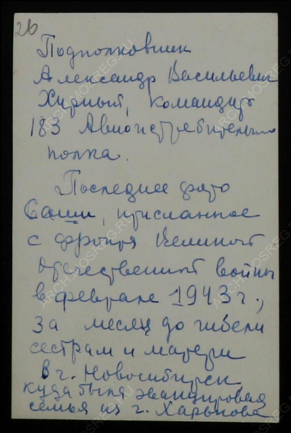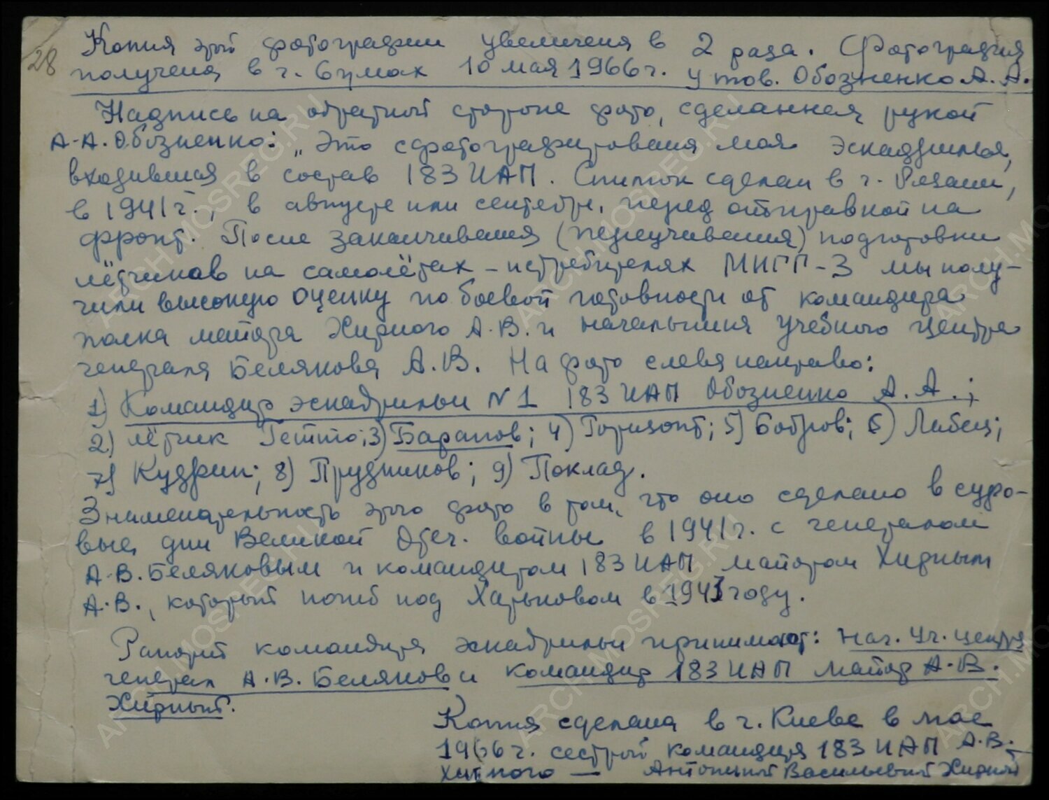 Приказом за № 148 от 31.05.1943 г (лист 198)  самолет Ил-2 №301858 с мотором Ам-38 № 458411 не вернувшийся с боевого задания исключить   из боевого состава 66 шап и списать по книгам учета полка.