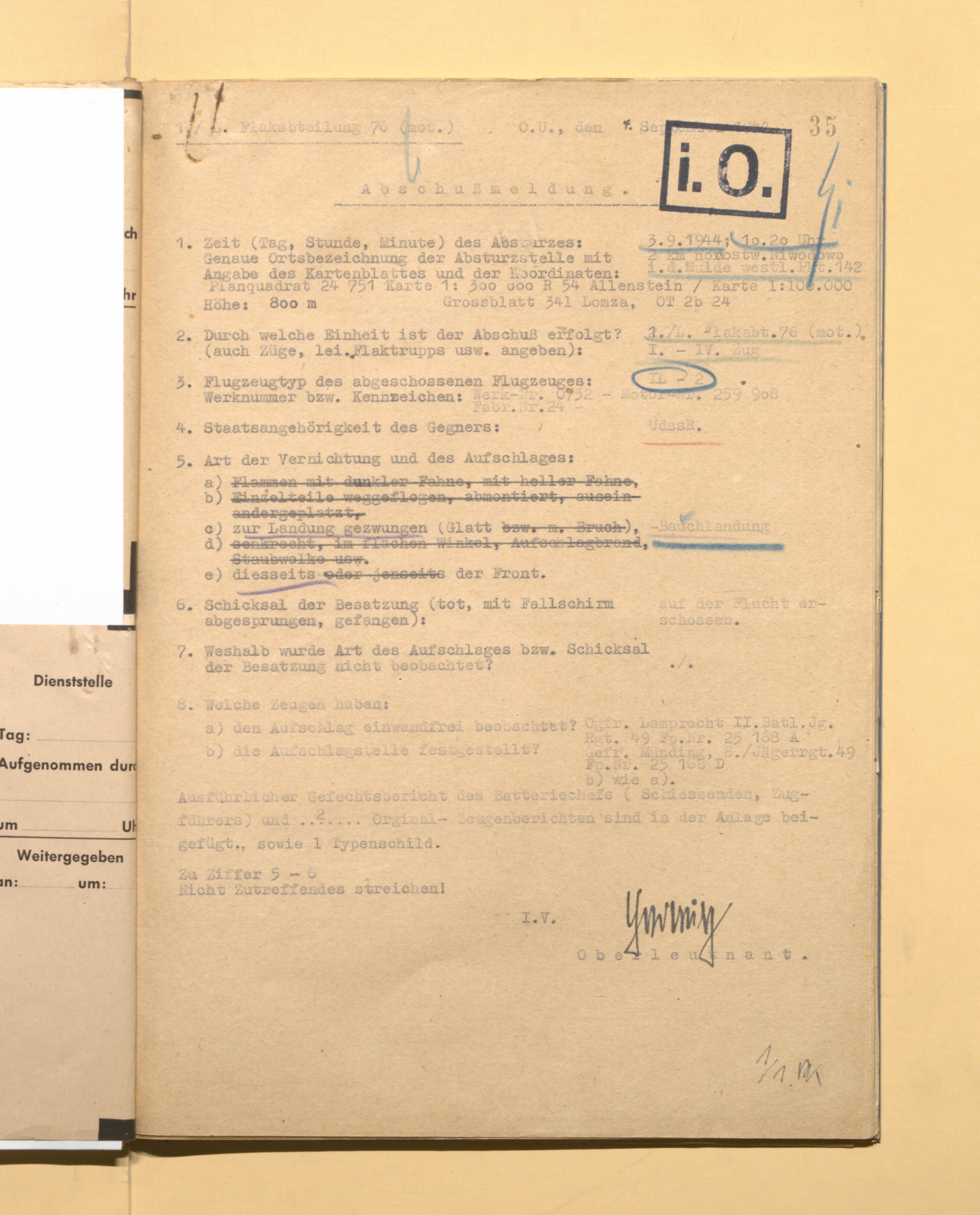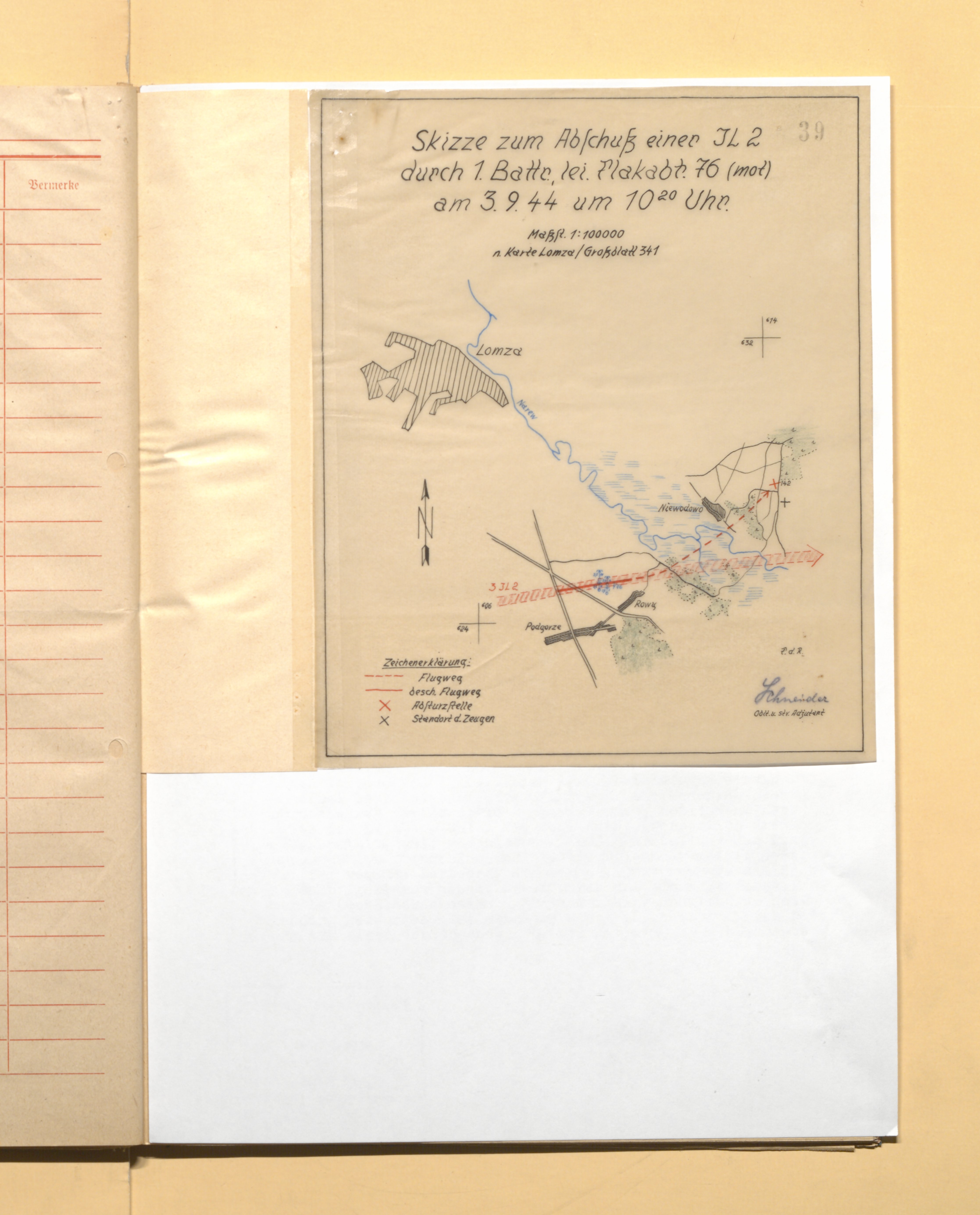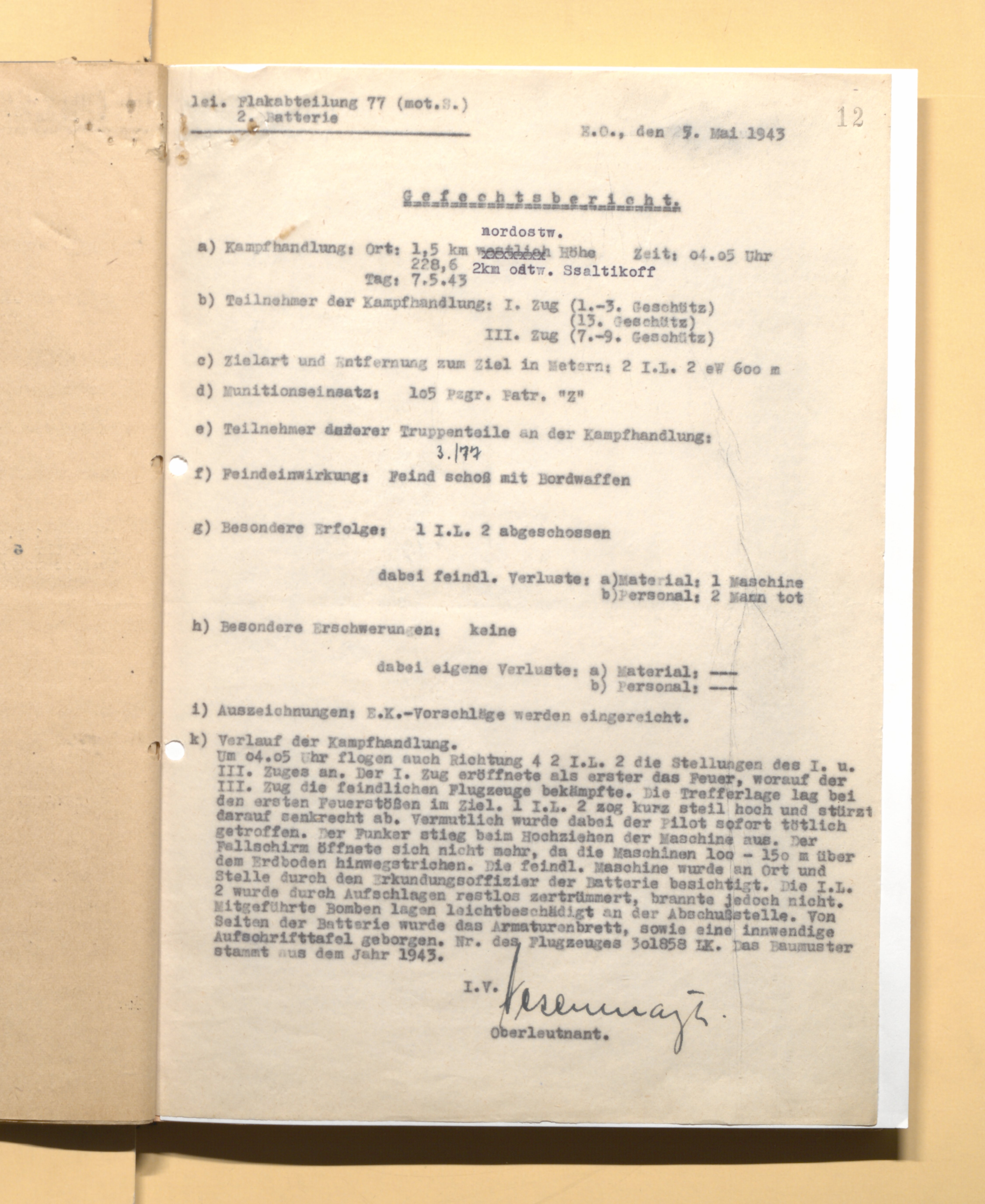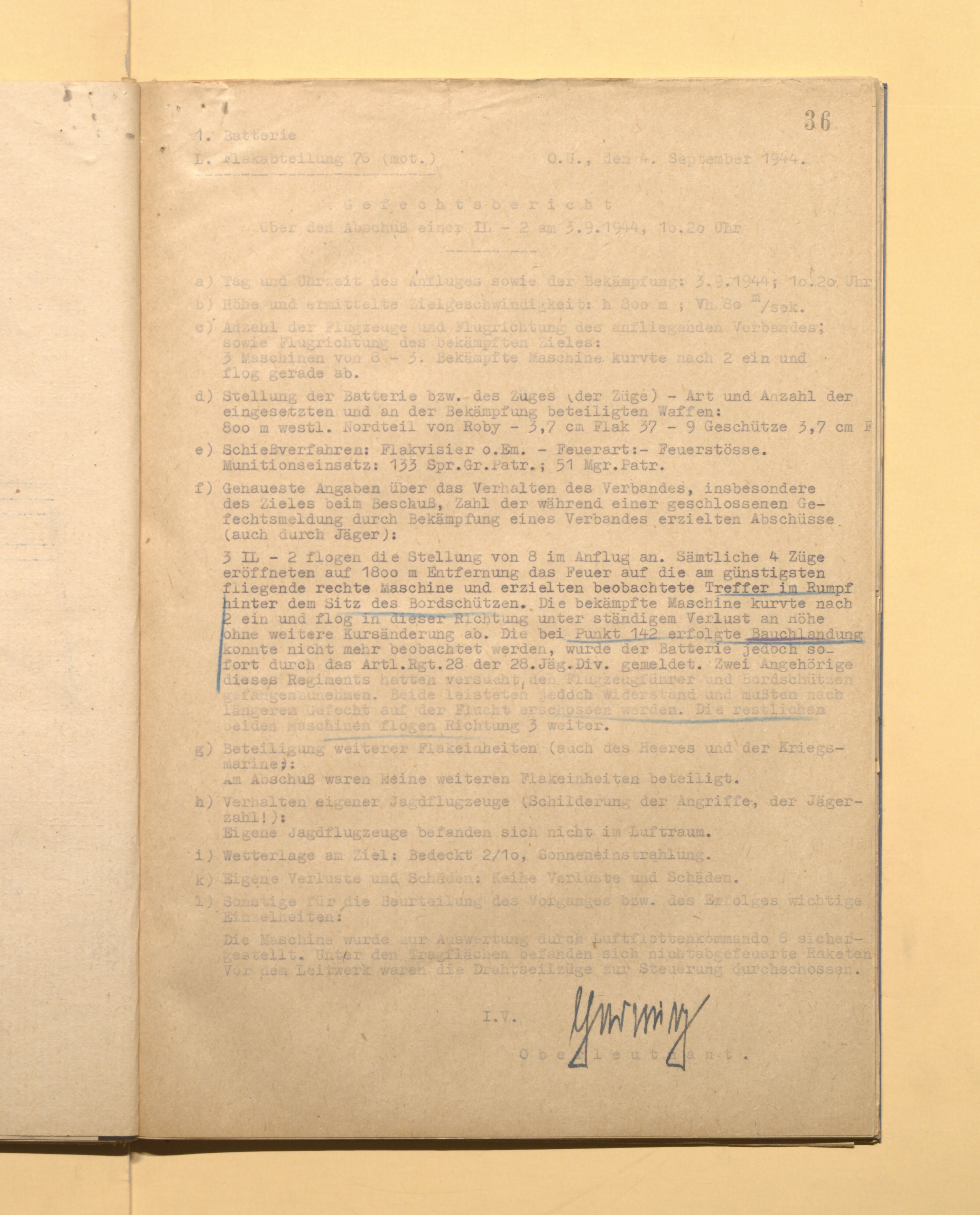 У фрицев: 3 Ил-2 из 8 пролетели над позицией. Все взвода открыли огонь с дистанции 1800 метров по наиболее подходящей цели – правой машине и наблюдали попадание в фюзеляж за сиденьем бортстрелка. Подбитая машина повернула и полетела, постоянно теряя высоту без дальнейшего изменения курса. Приземлилась на брюхо. Экипаж пытались захватить. Однако оба оказали сопротивление и были вынуждены бежать с поля боя после неудачного выстрела (Судьба экипажа – на бегу он выстрелил).