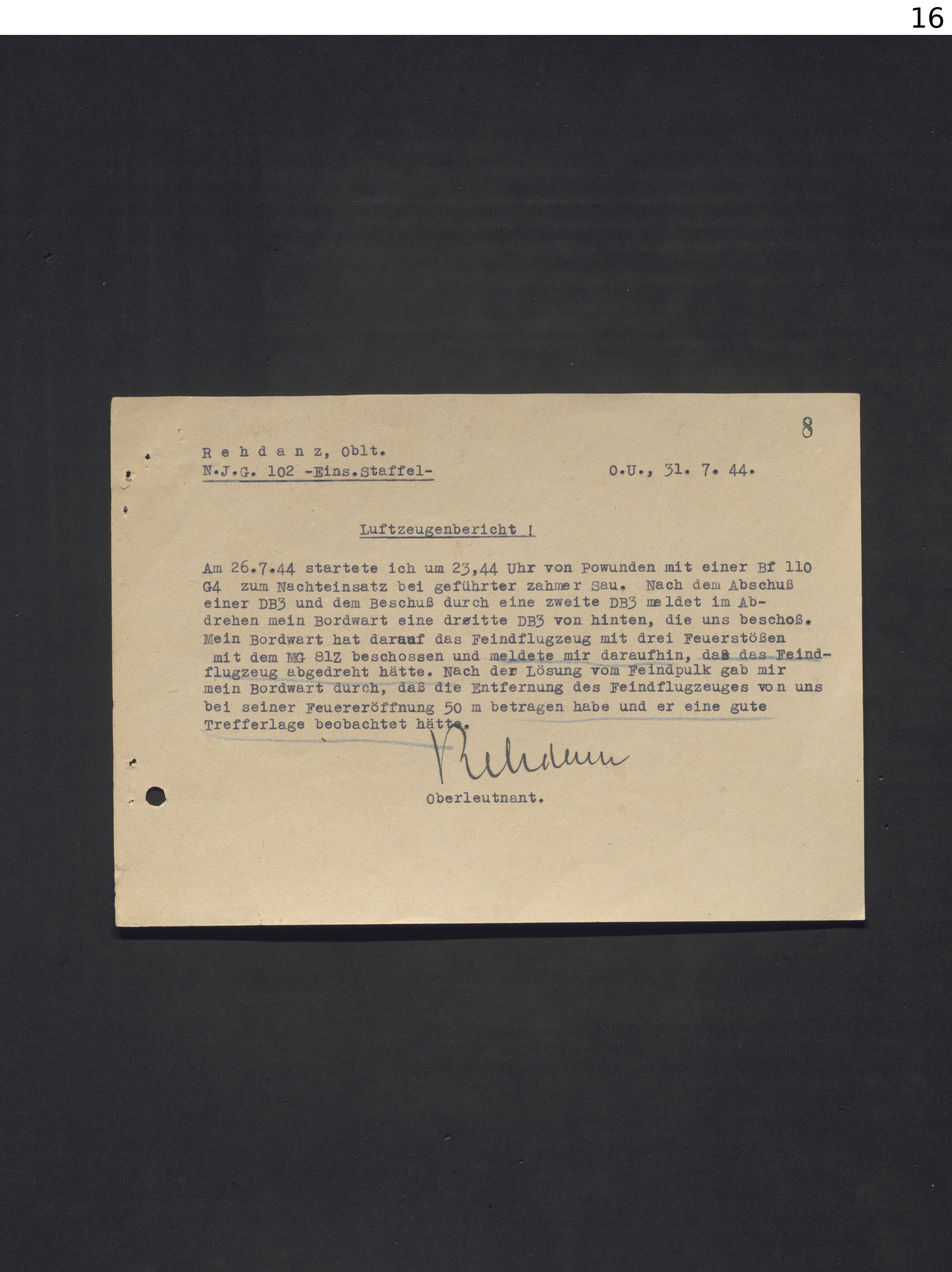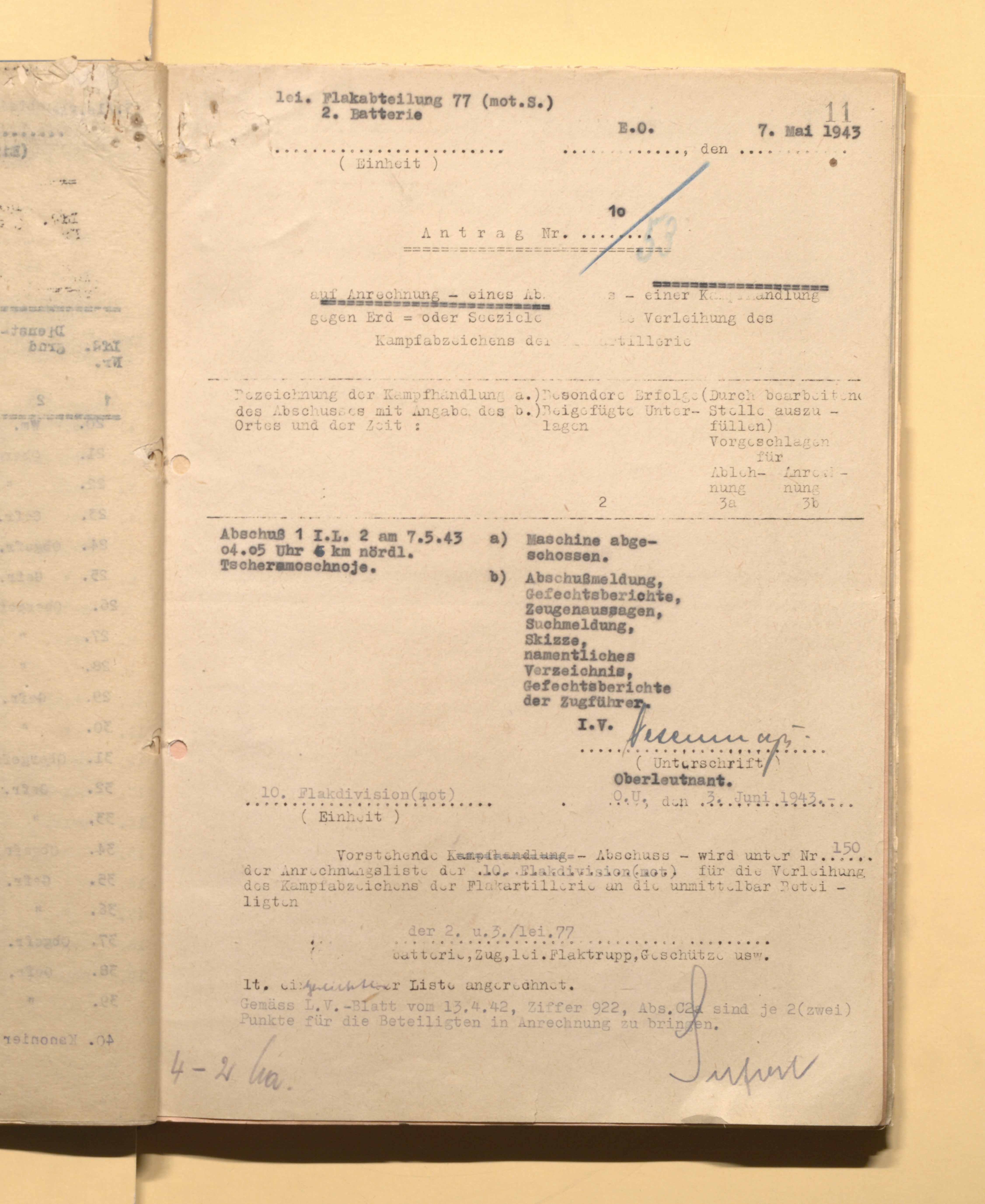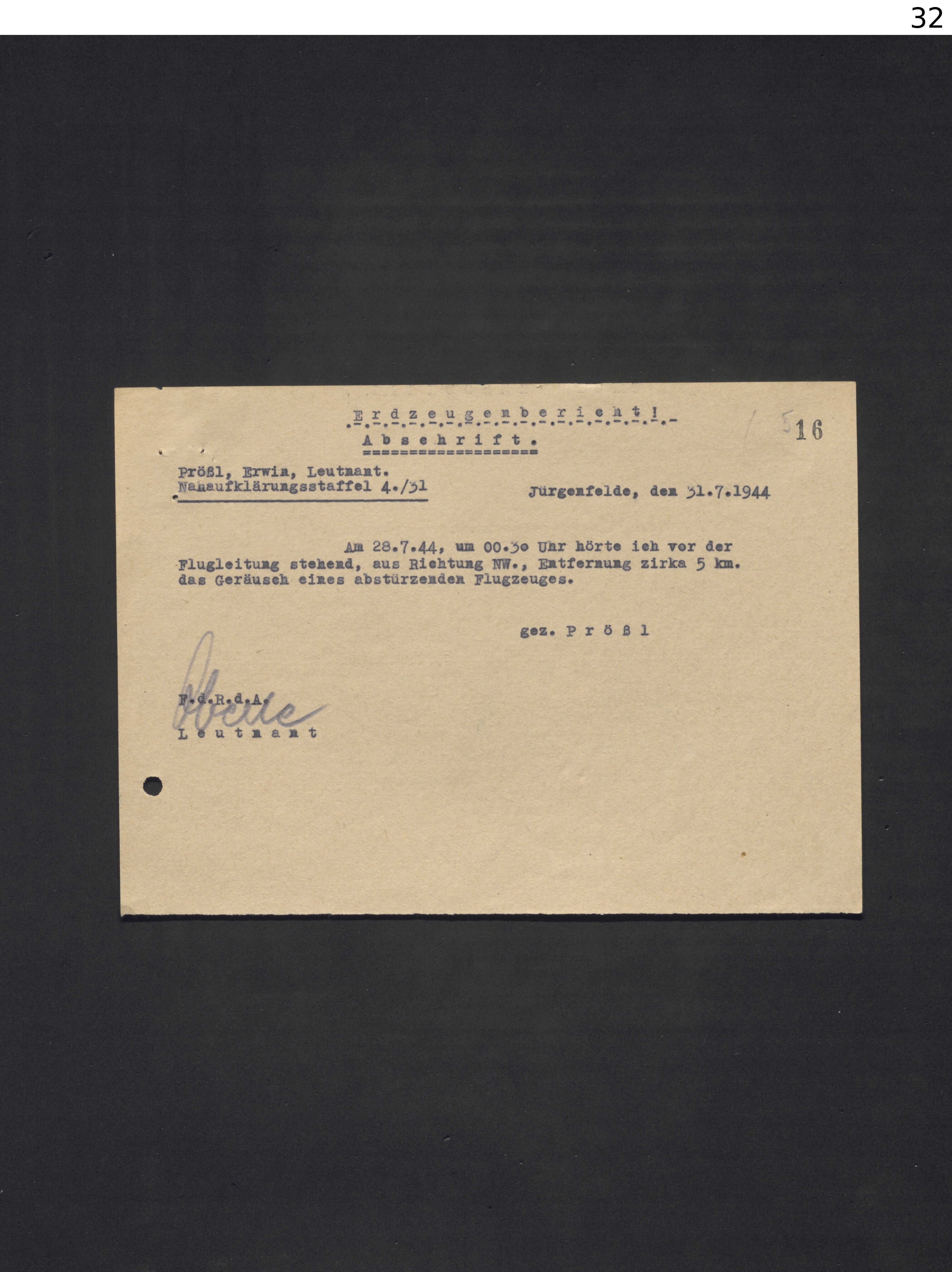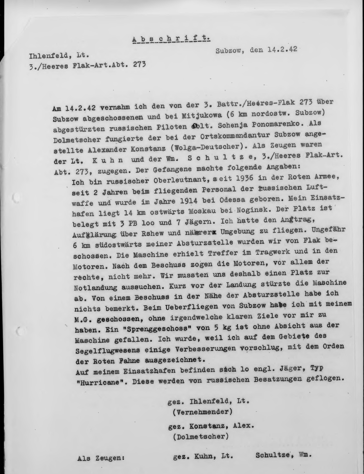 У фрицев: 3 Ил-2 из 8 пролетели над позицией. Все взвода открыли огонь с дистанции 1800 метров по наиболее подходящей цели – правой машине и наблюдали попадание в фюзеляж за сиденьем бортстрелка. Подбитая машина повернула и полетела, постоянно теряя высоту без дальнейшего изменения курса. Приземлилась на брюхо. Экипаж пытались захватить. Однако оба оказали сопротивление и были вынуждены бежать с поля боя после неудачного выстрела (Судьба экипажа – на бегу он выстрелил).