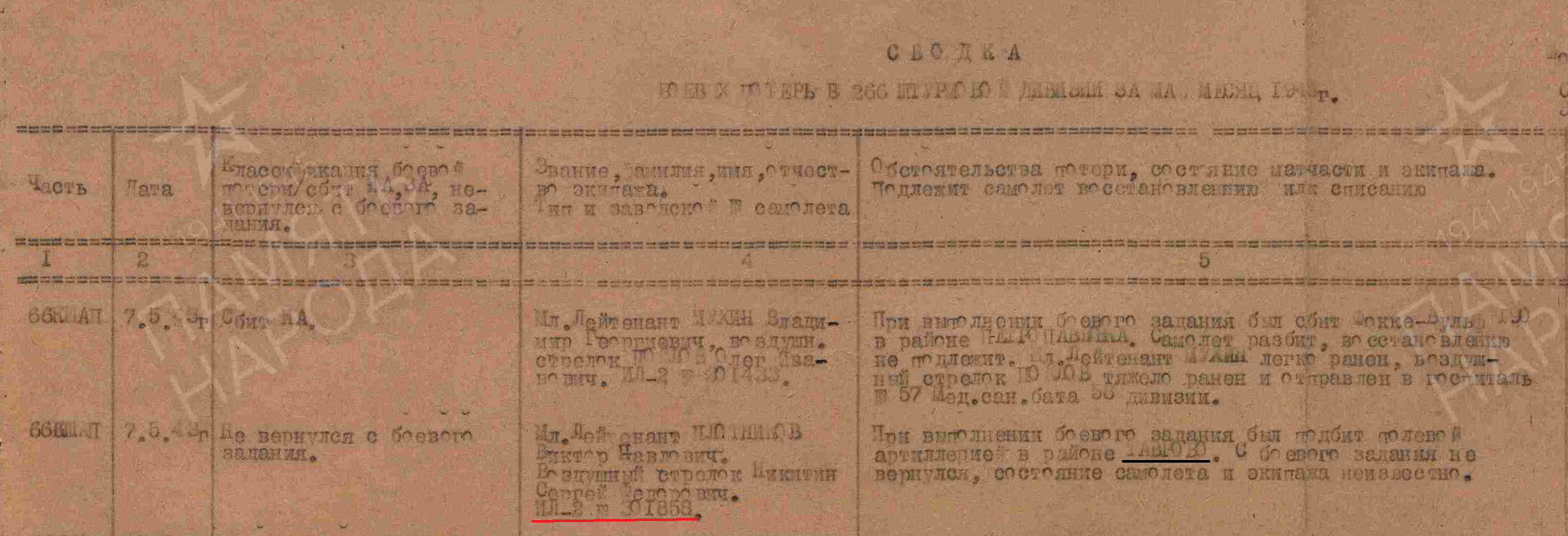 66 шап две пары Ил-2 вылетали на свободную охоту по дороге Белгород-Казачья Лопань. нбз 2 экипажа Мухин-Пойлов и Плотников-Никитин. 11.5.1943 в часть возвратился пилот Мухин, который сообщил, что он и Плотников были обстреляны ЗА на бреющем в районе Таврово. Плотников был подбит и упал западнее Таврово у реки. Мухин и стрелок были ранены и самолет поврежден, а затем атакован ИА. Сел на фюзеляж в районе Петропавловка, ИА добила самолет на земле. Стрелок в медсанбате.