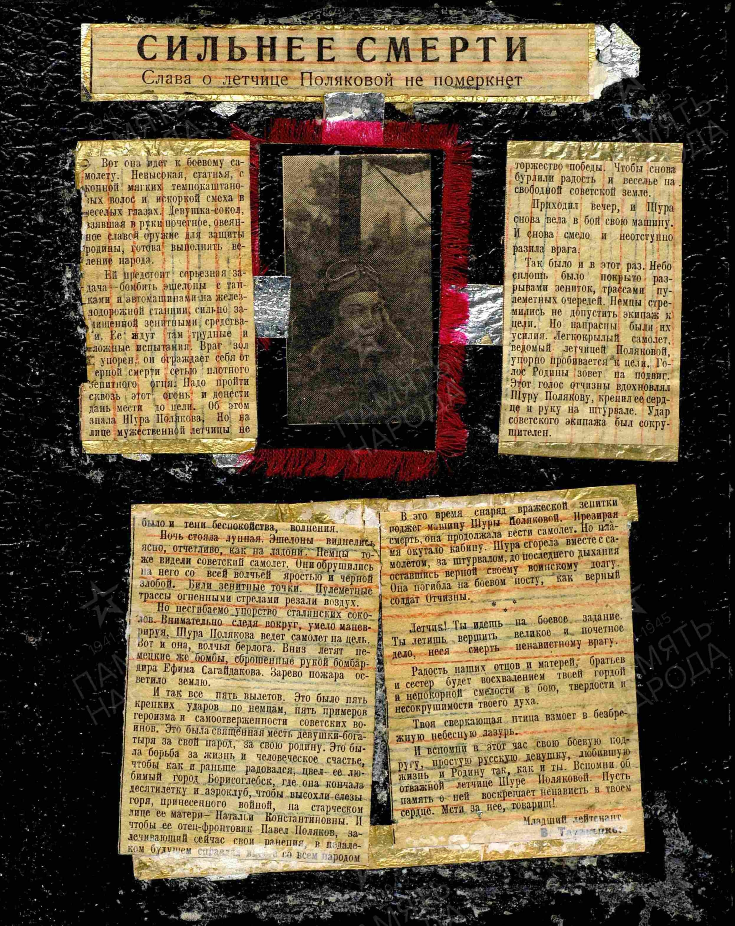 «…Еще под Сталинградом, в самый разгар битвы, к нам в полк пришла летчица Шура Полякова. Невысокого роста, черноволосая, с нежным румянцем на щеках, честно сказать, девушка не вызвала у нас особого восторга. Мы недоумевали по поводу такого решения руководства. Ведь в это время в предгорьях Кавказа воевал на У-2 женский авиационный полк. Почему бы ей не быть там, среди девушек-летчиц, рассуждали мы. Но судьбе было угодно распорядиться иначе: Шура Полякова стала единственной летчицей среди нас, ночных бомбардировщиков.