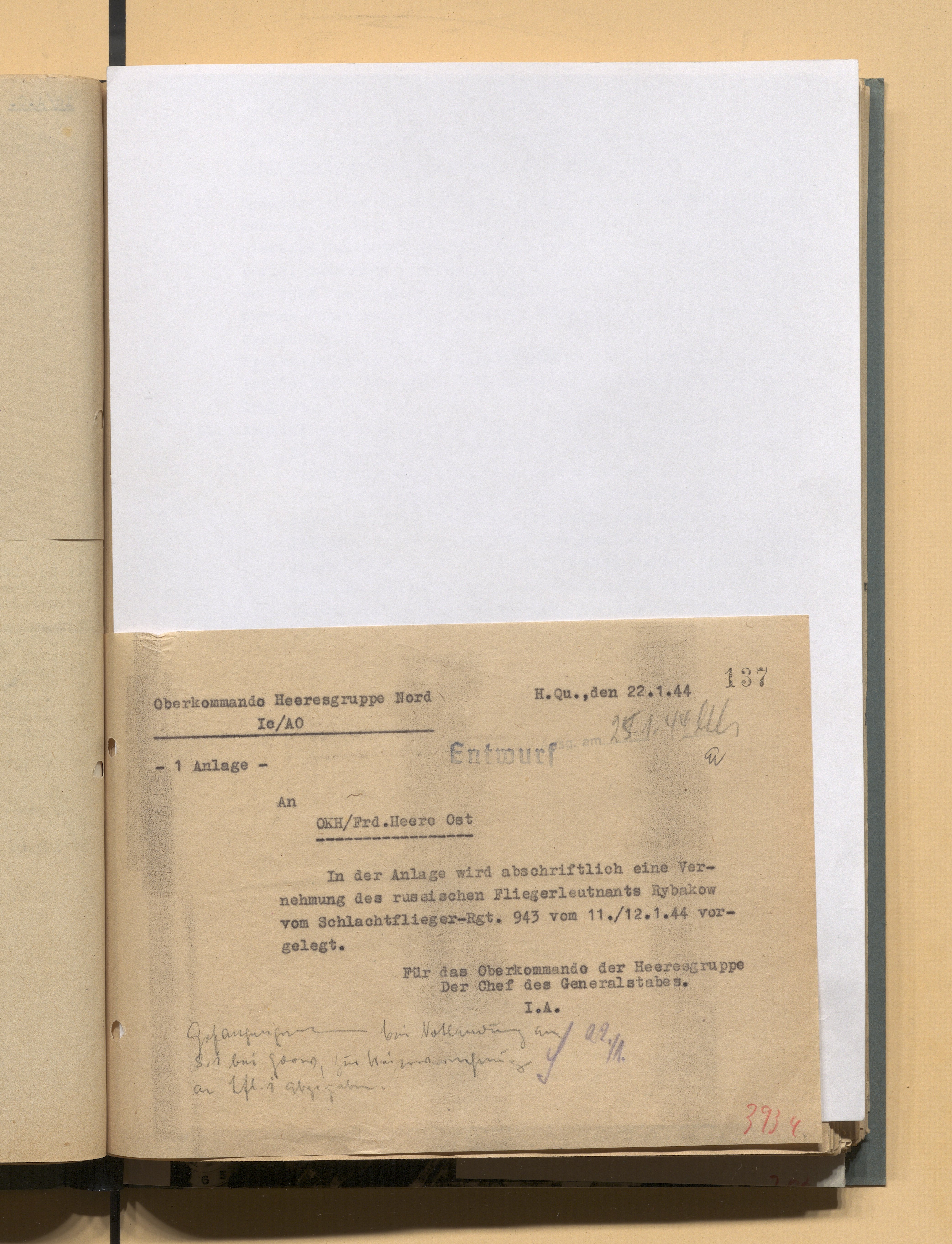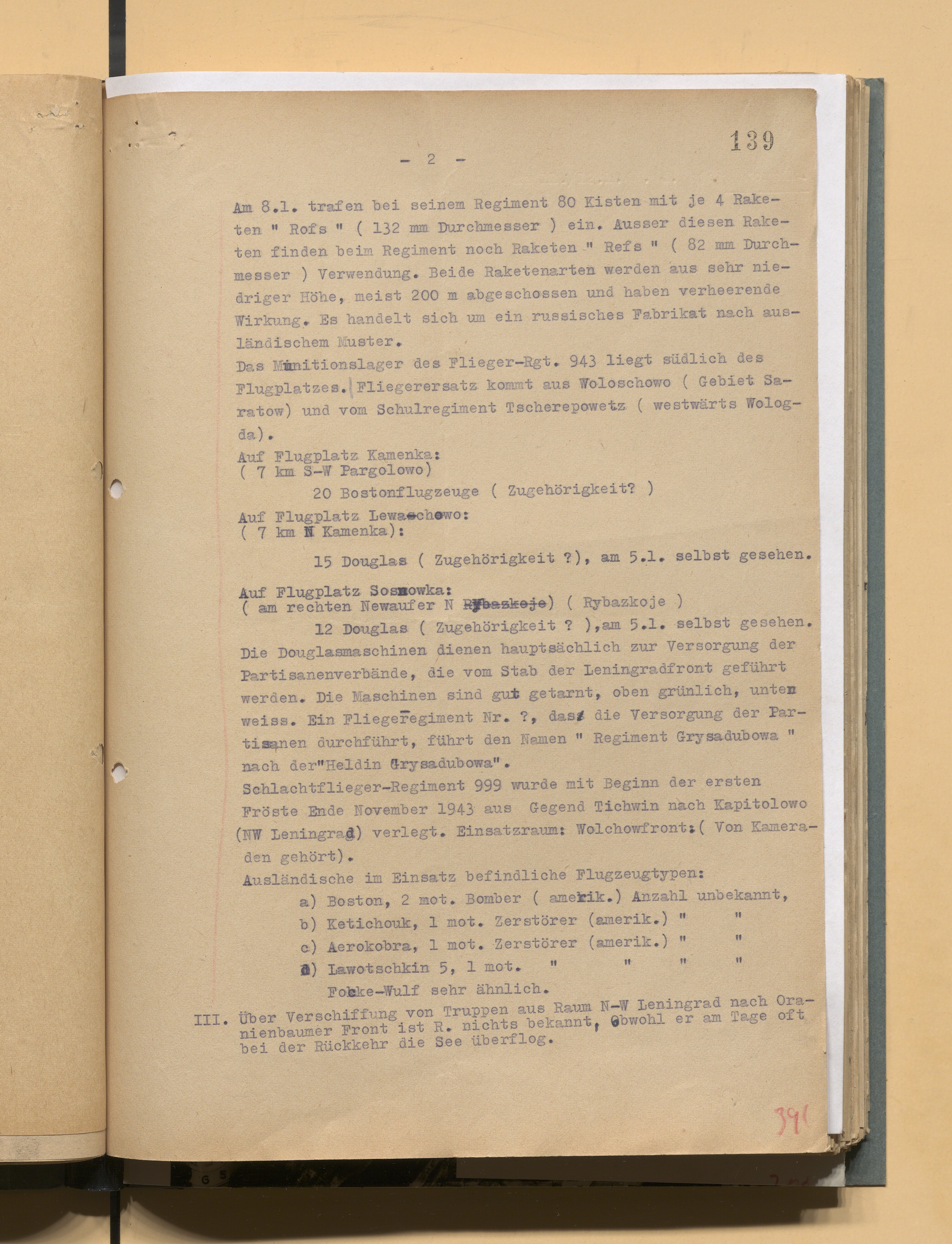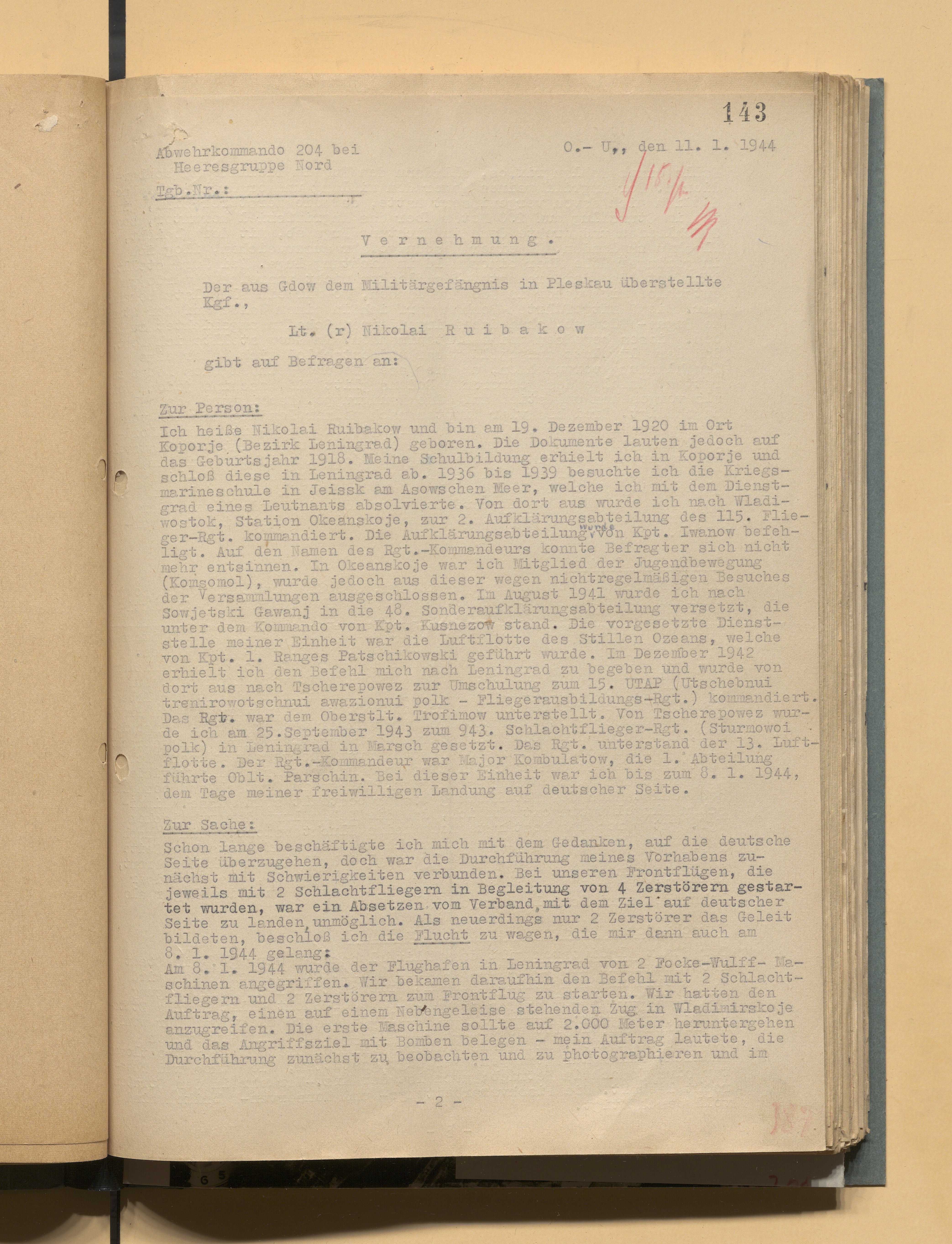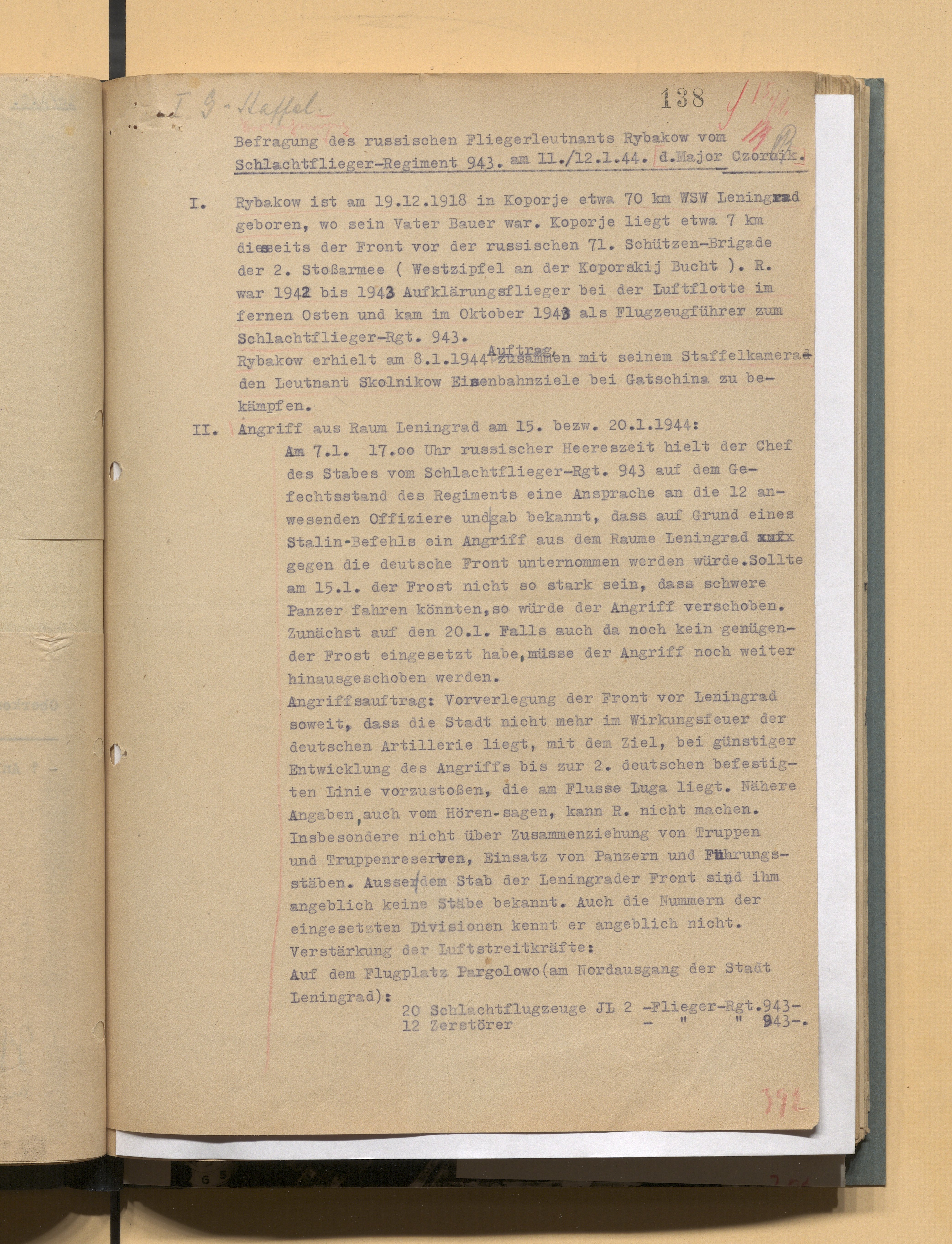 Докладная по допросу летчика 943 штурмового авиаполка лейтенанта Рыбакова Николая Кузьмича (1918 г.р., уроженец ст. Капорье Ораниенбаумского р-на Ленинградской обл.). Сбит ЗА 08.01.44 г. в районе г. Слуцк Ленинградской обл. (в/стрелок мл. сержант Кузьменко Василий Матвеевич, 1918 г.р., уроженец с. Катериновка Велико-Бурлуцкого р-на Харьковской обл.).