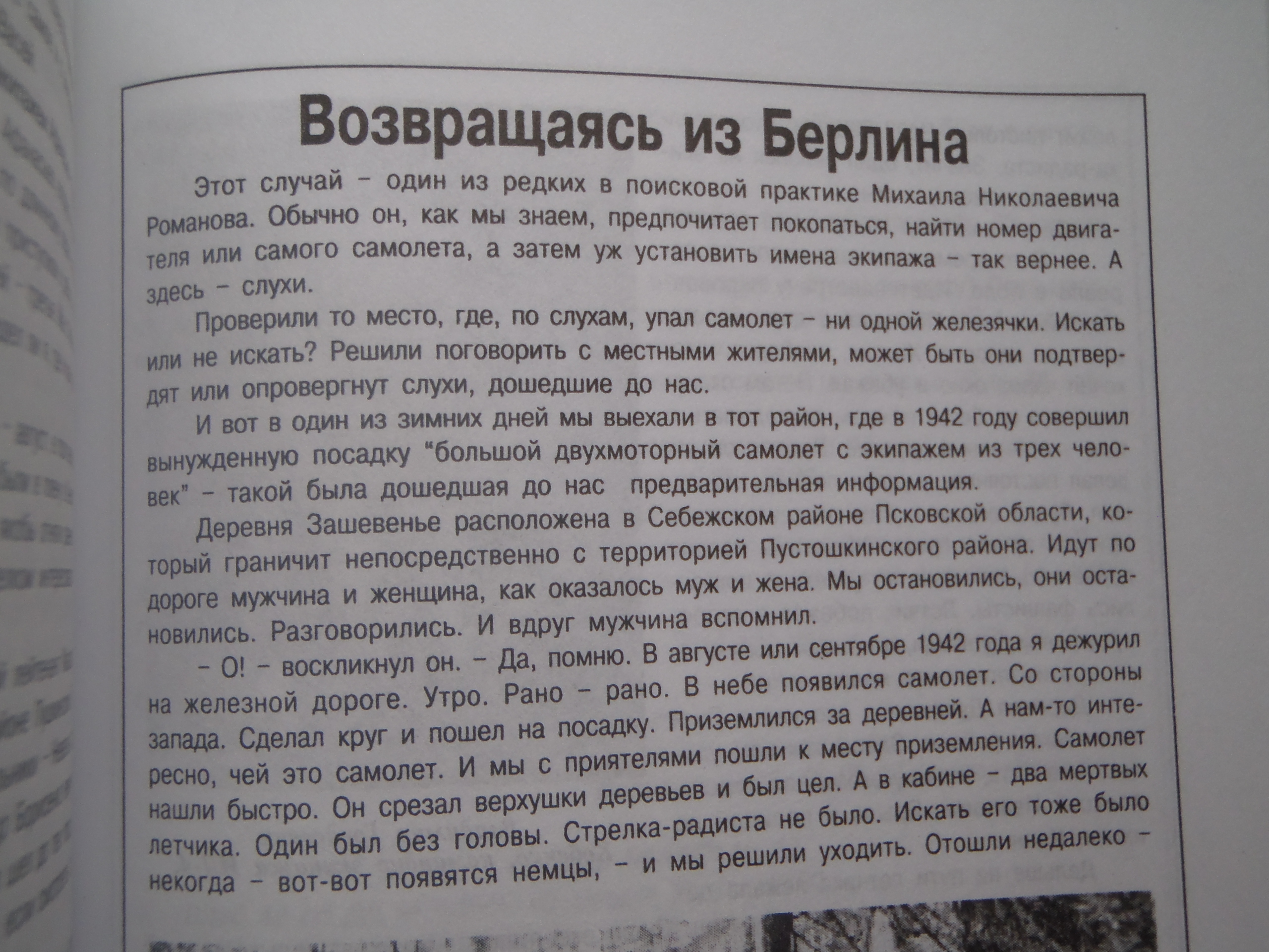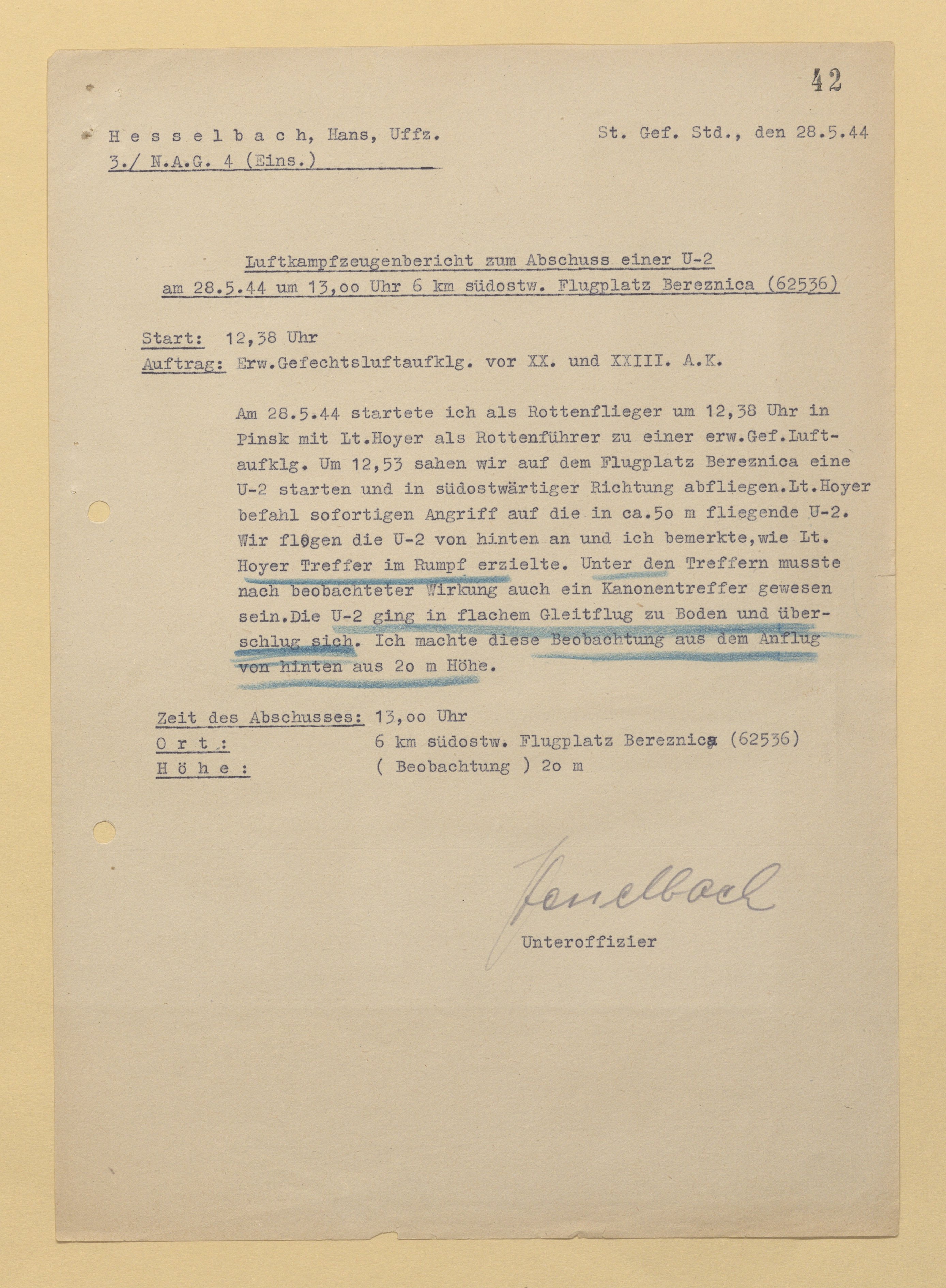 У немцев: Объяснительная ведомого к заявке о сбитом ведущим л-т Хольт советского самолета У-2 28.5.1944 в 13.00 берлинского. Летели парой на Пинск. Увидели, как с аэродрома Березница/Бережница взлетел У-2. Ведущий сбил его в 6 км ЮВ аэродрома (62536). У-2 упал полого и перевернулся. Фото прилагается,  справа внизу виден частично У-2.