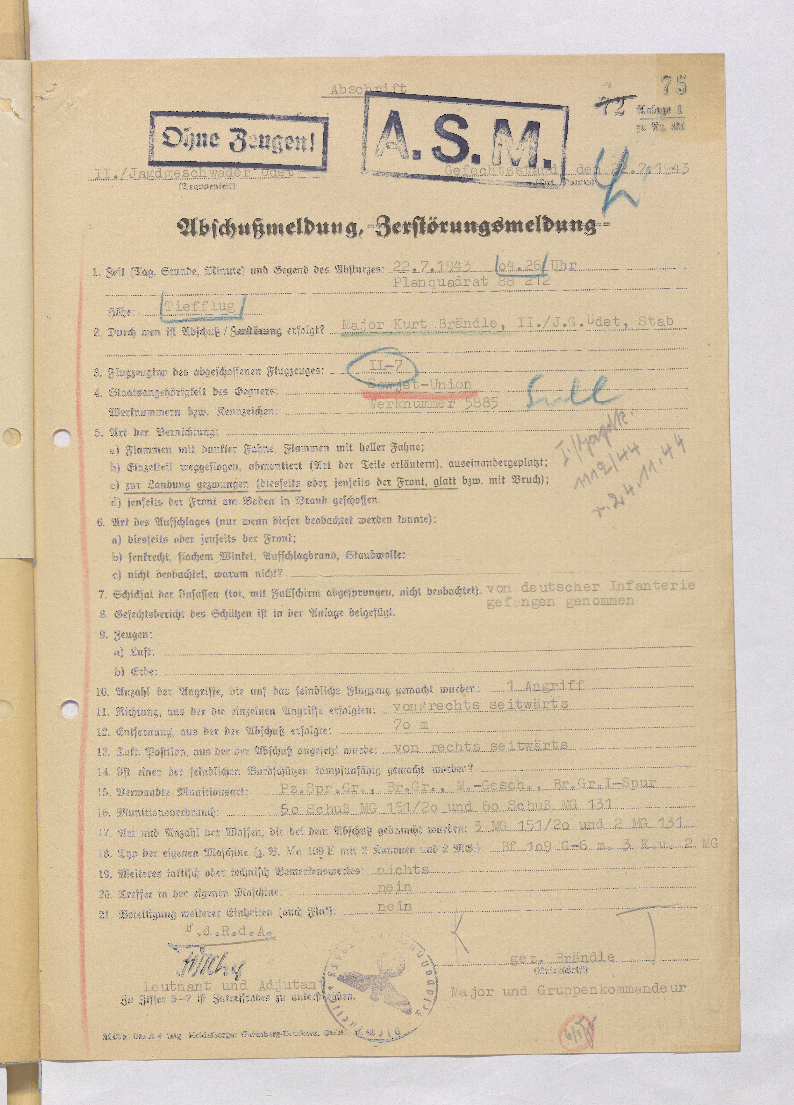 Но в списках потерь в 806 шап 22.7.1944 нбз 8 летчиков! Ошибка в мемуарах или второй вылет? В тот день у майора Брандл еще 3 заявки в 10.44-10.50.