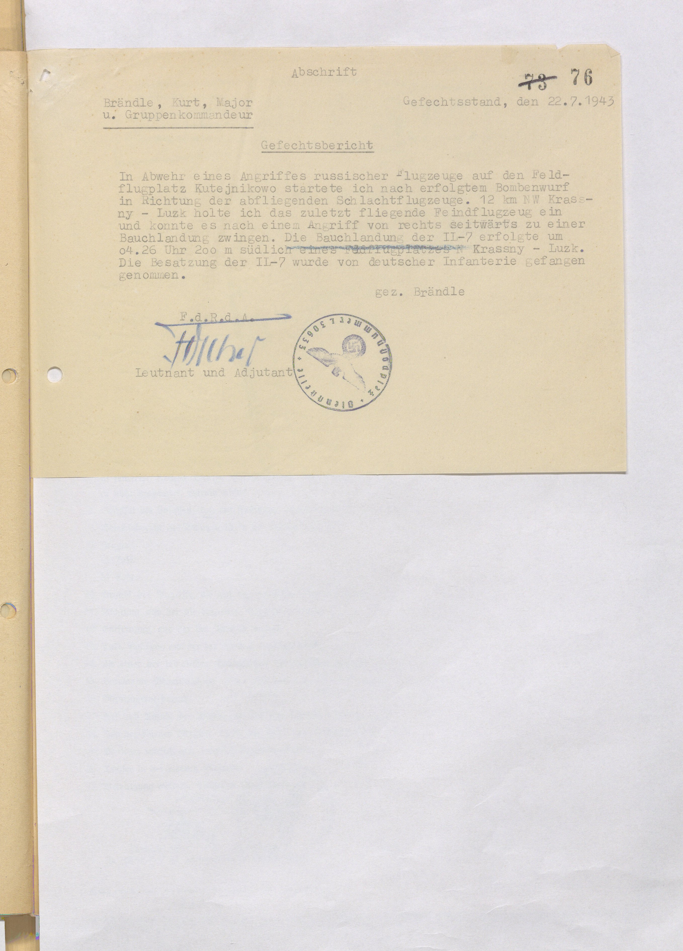 У немцев: Заявка майора Брандл из эскадры Удет на сбитый Ил-7 (!) 22.7.1943 в 4.26 берлинского. После бомбардировки русскими полевого аэродрома немцев Кутейниково майор сумел благополучно взлететь и погнался вдогонку за русскими самолетами. В 12 км СЗ "Красны - Луцк" (? Красный Луч?, но вряд ли) атаковал замыкающий самолет и вынудил его совершить посадку на брюхо в 4.26 в 200 м южнее "Красны - Луцк". Экипаж был захвачен в плен немецкой пехотой. Квадрат 88212