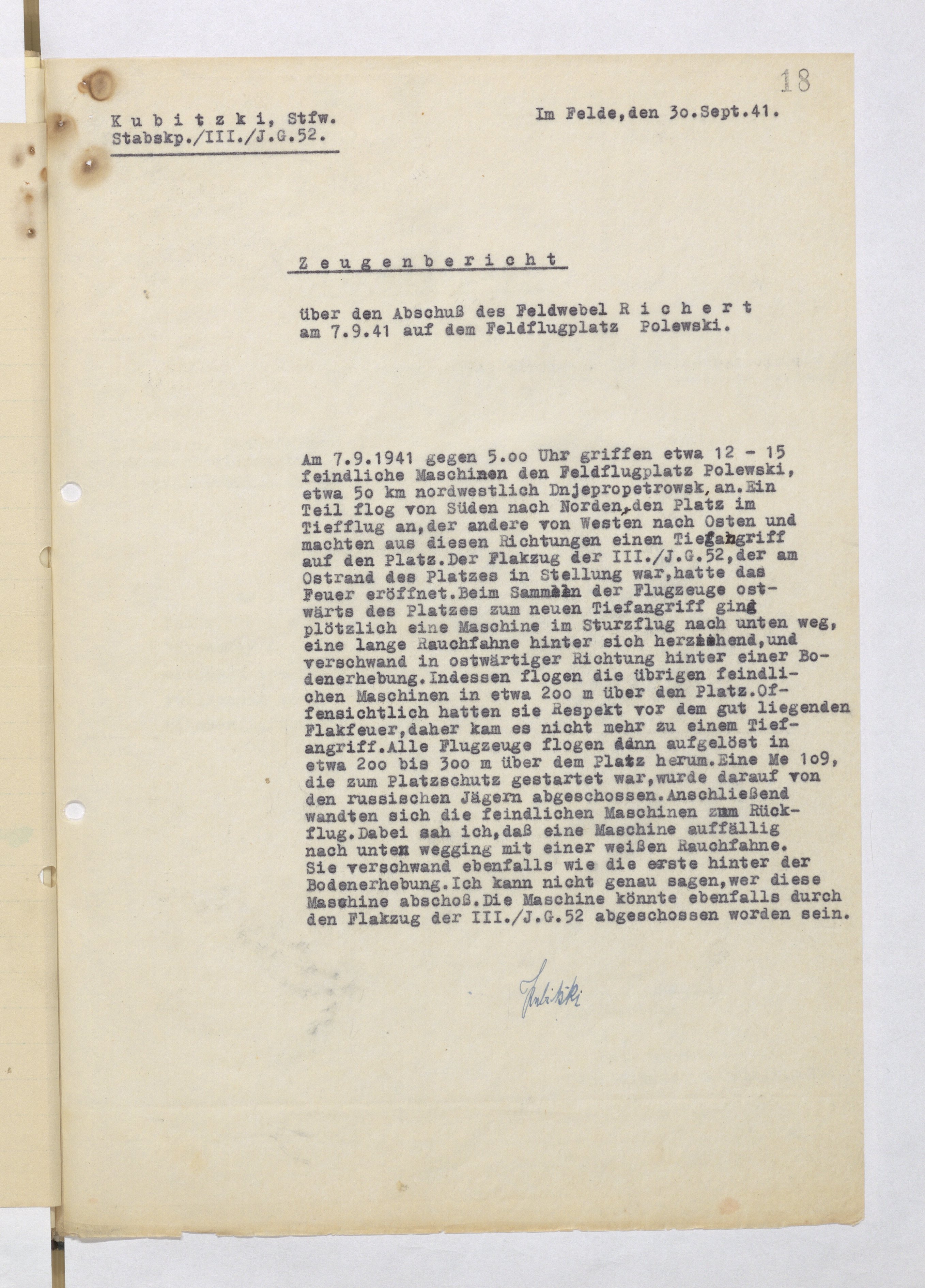 У немцев: 12.10.1943 в 9.30 берлинского ИА сбила неизвестный советский истребитель в районе Задорожье, что в 12 км ЮВ Бол. Дятел. Самолет упал с большой высоты, разбился. НЕПОНЯТНО: Бумаги, карты и пилота нельзя было опознать?